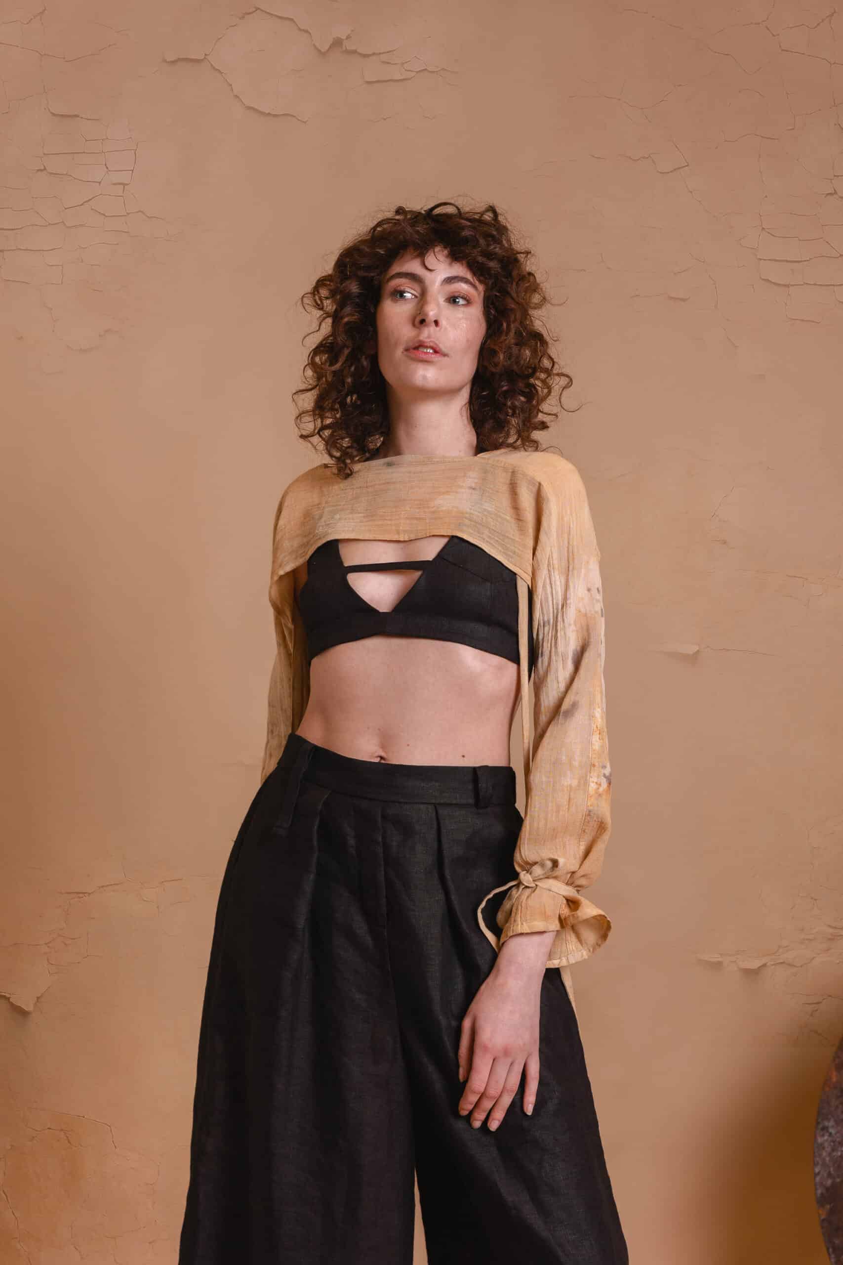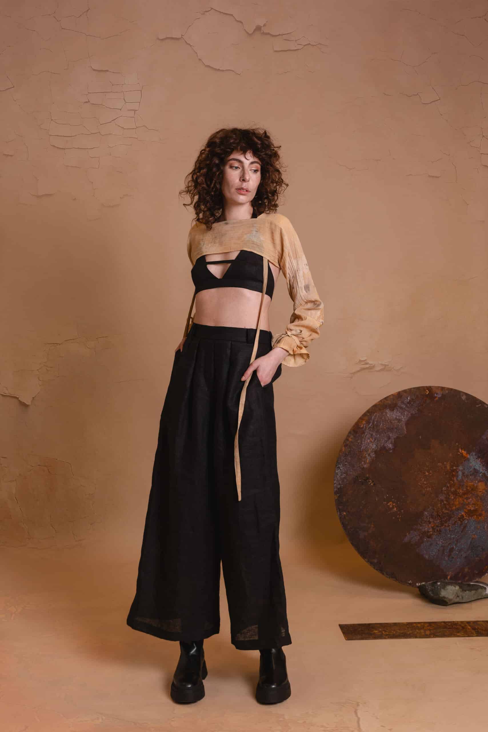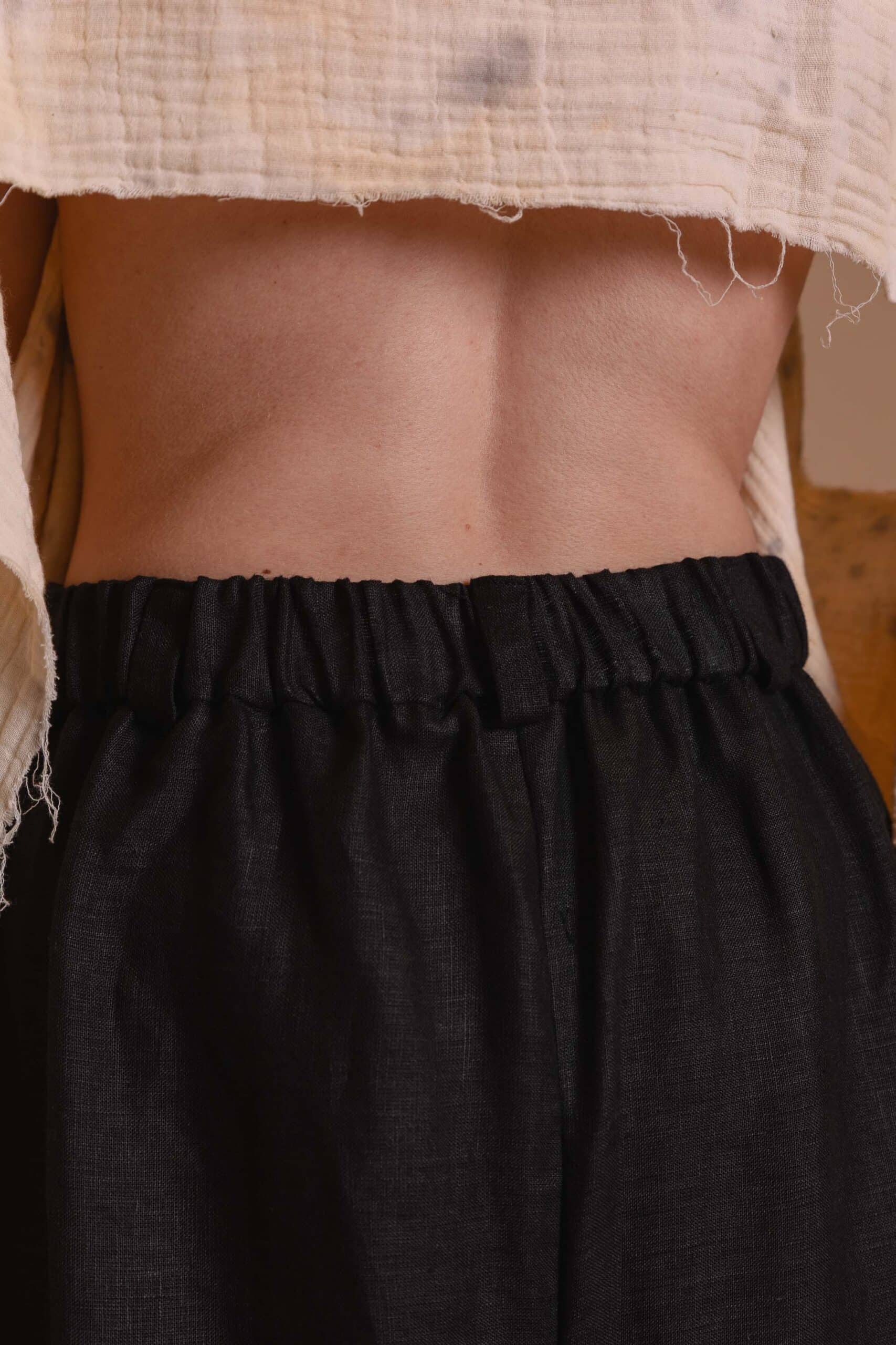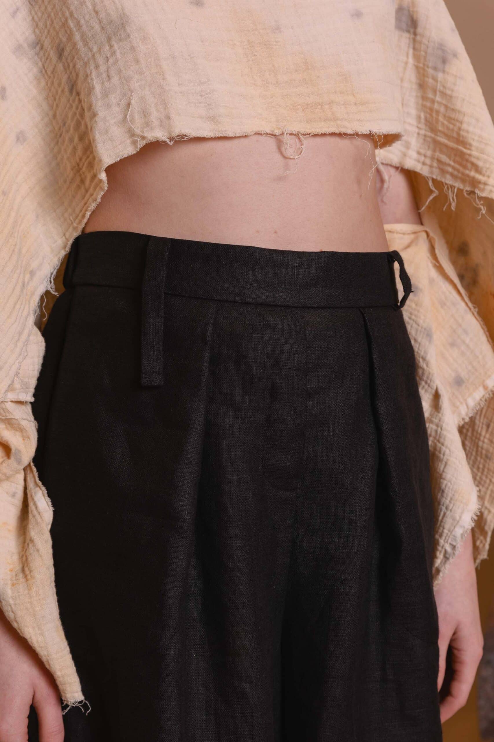 Blends comfort and thoughtful details in a high-waisted design. They feature a faux fly at the front, two elegant pleats, and an organic elastic waistband at the back for an effortless fit. Functional pockets and belt loops, one of which extends into a longer cord for a unique touch.