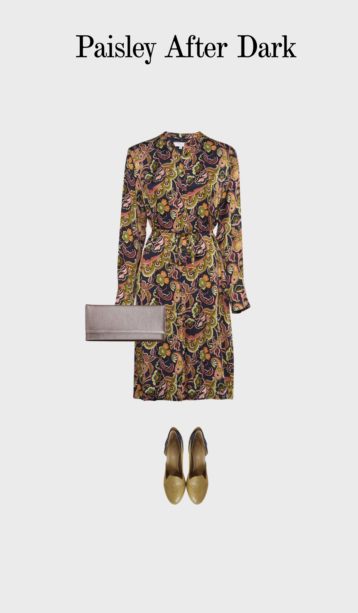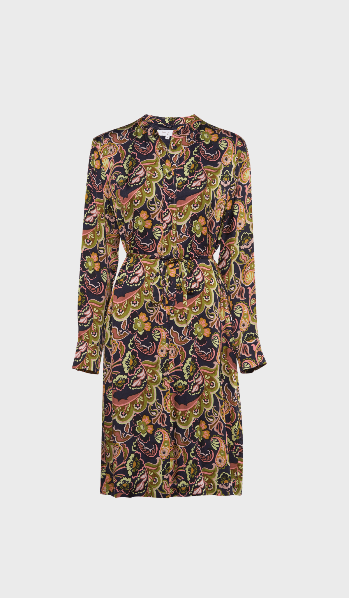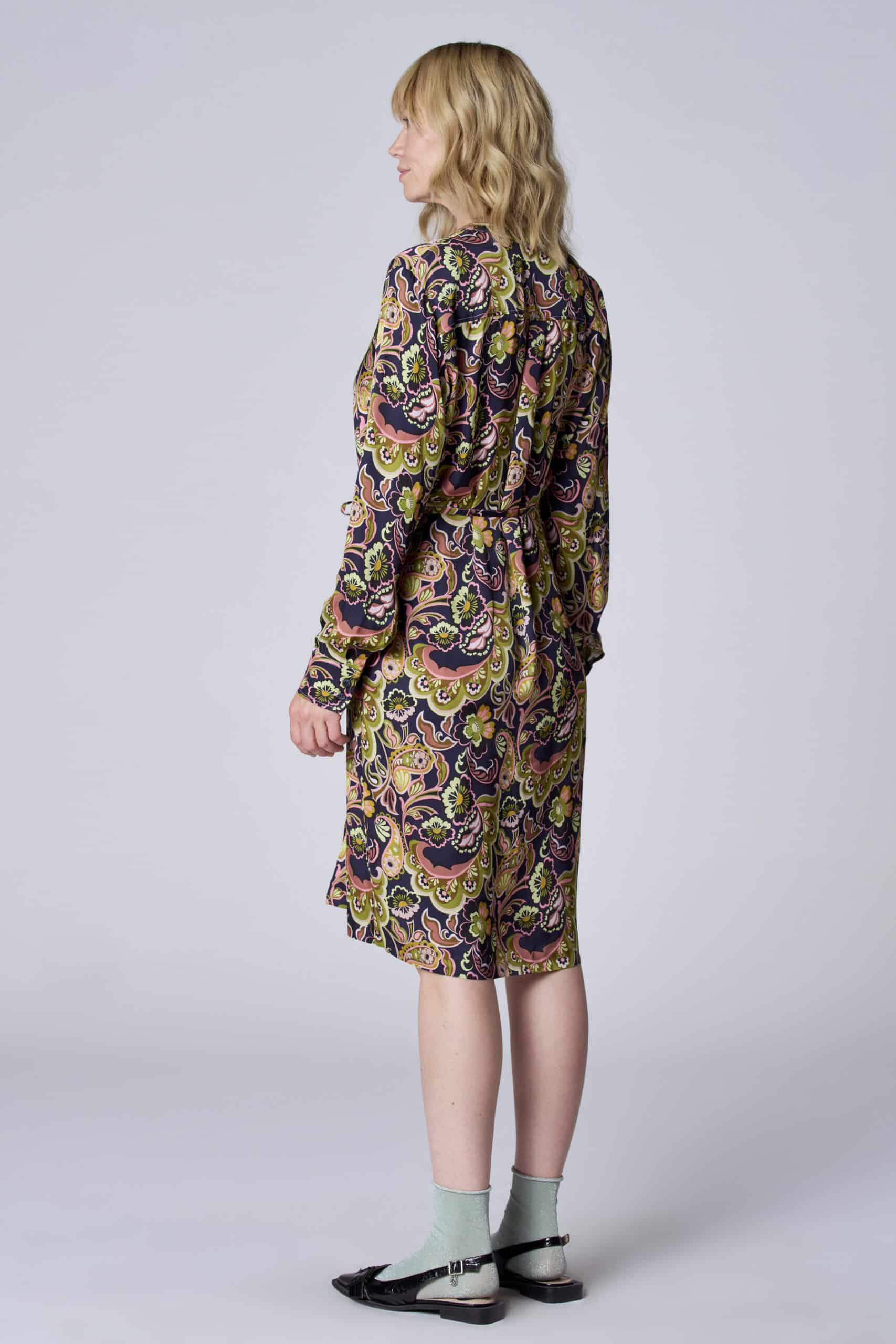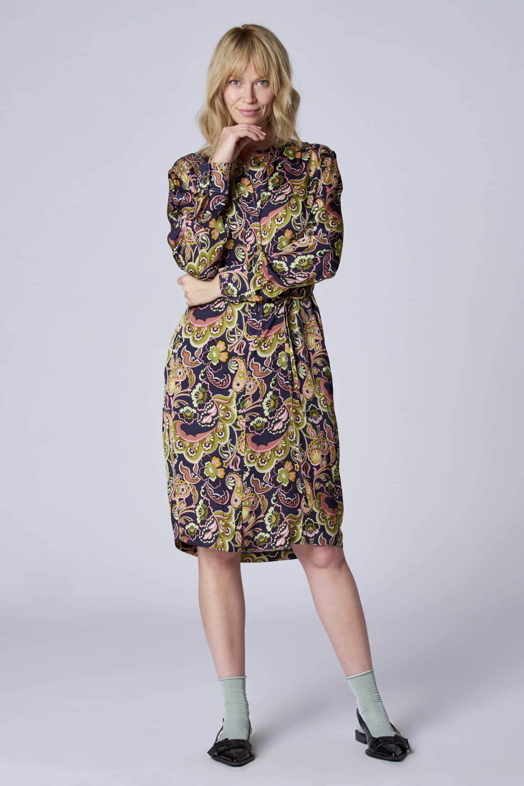 This dress with a bold floral print in pink, green, and aubergine is an instant mood booster. The fluid fabric and tie belt create a flattering, feminine silhouette. With its long sleeves and elegant collar, this is a versatile dress that can be worn both casually and for festive occasions.