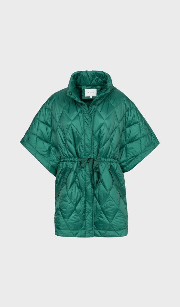 Albi by Gigue is an emerald colored quilted mantel with high collar and waistband string detail.