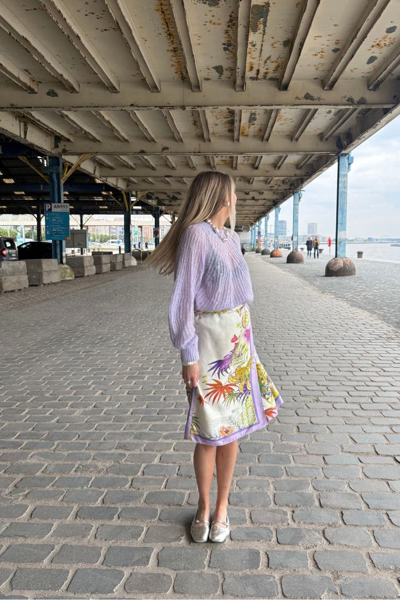 Upcycled skirt in 100% silk with a colorful print with floral and palm leaf patterns.
