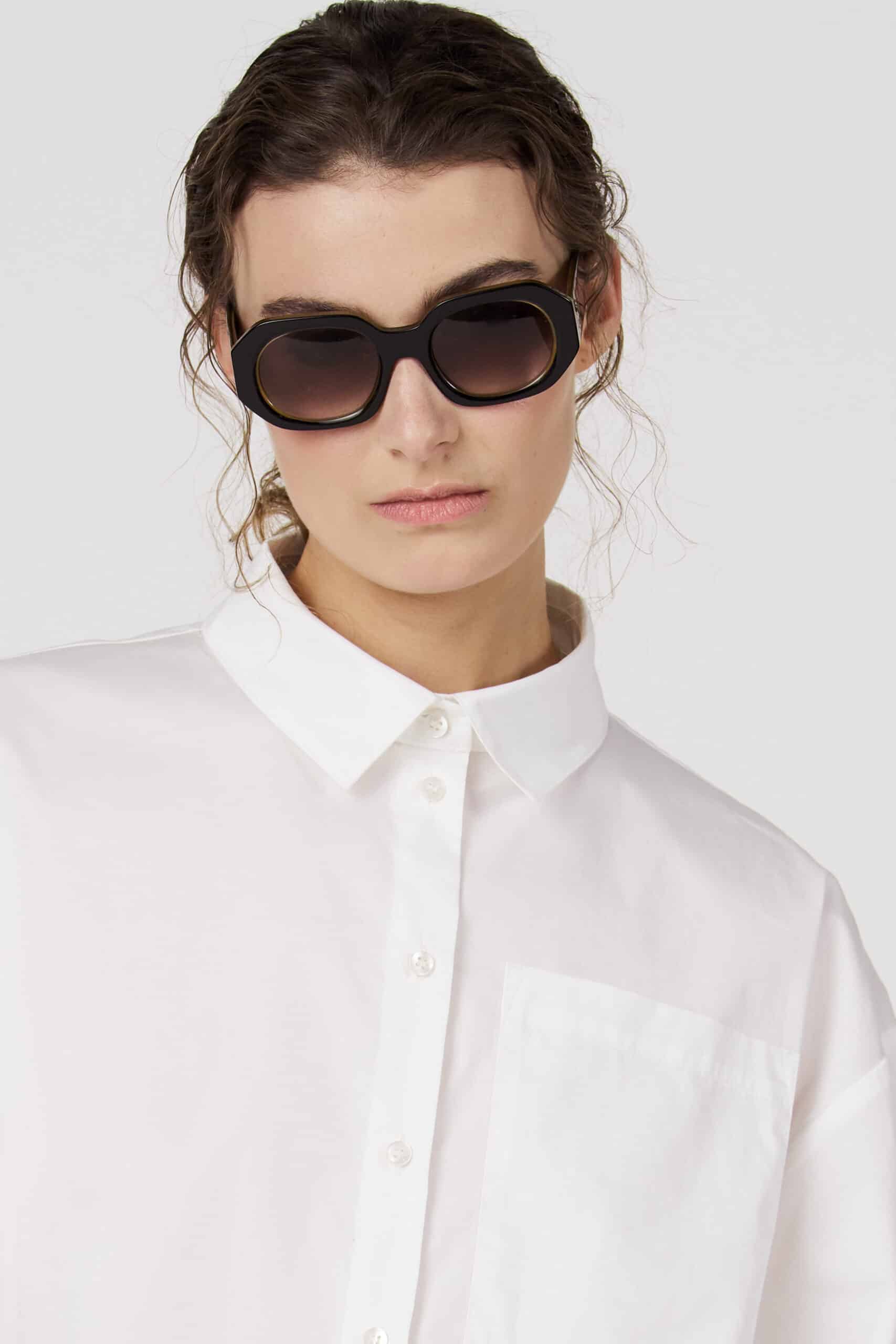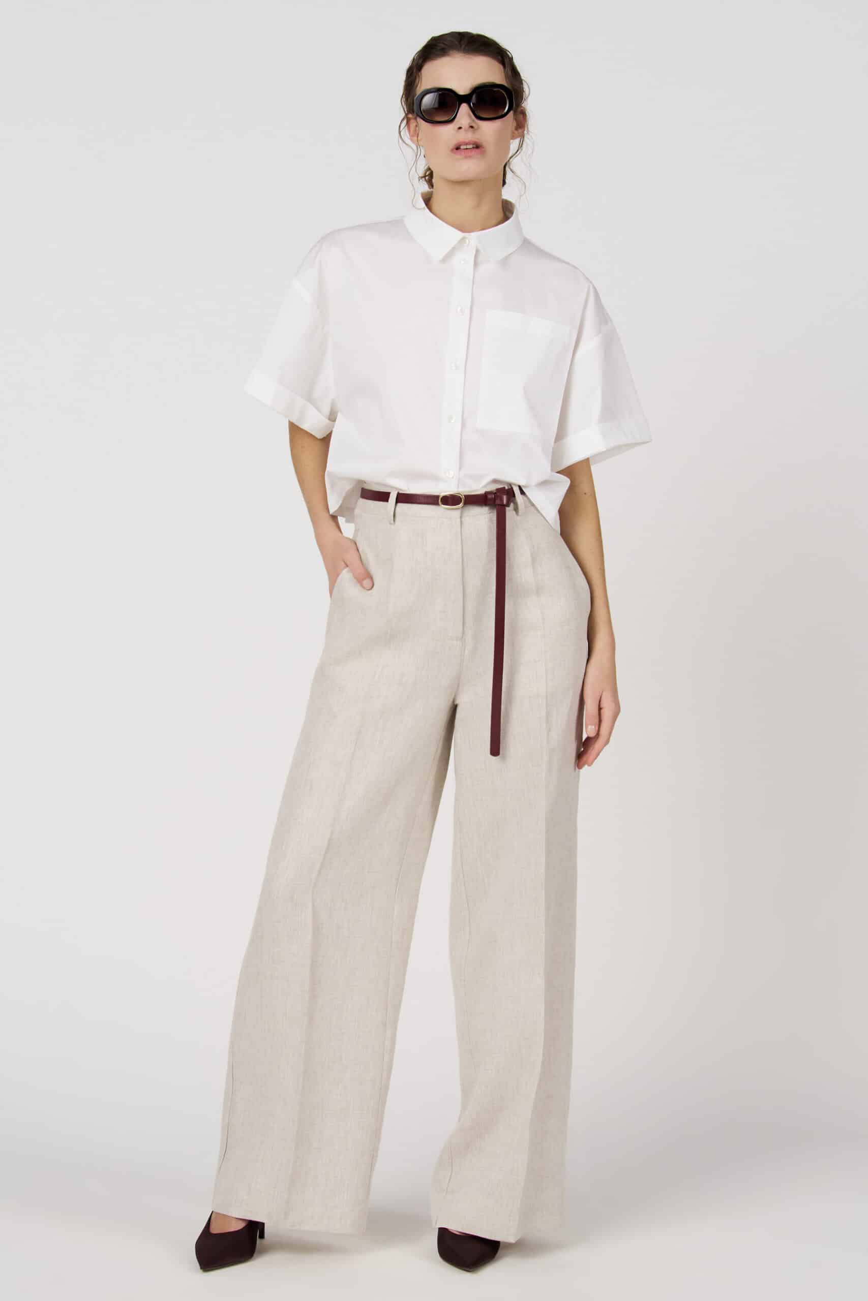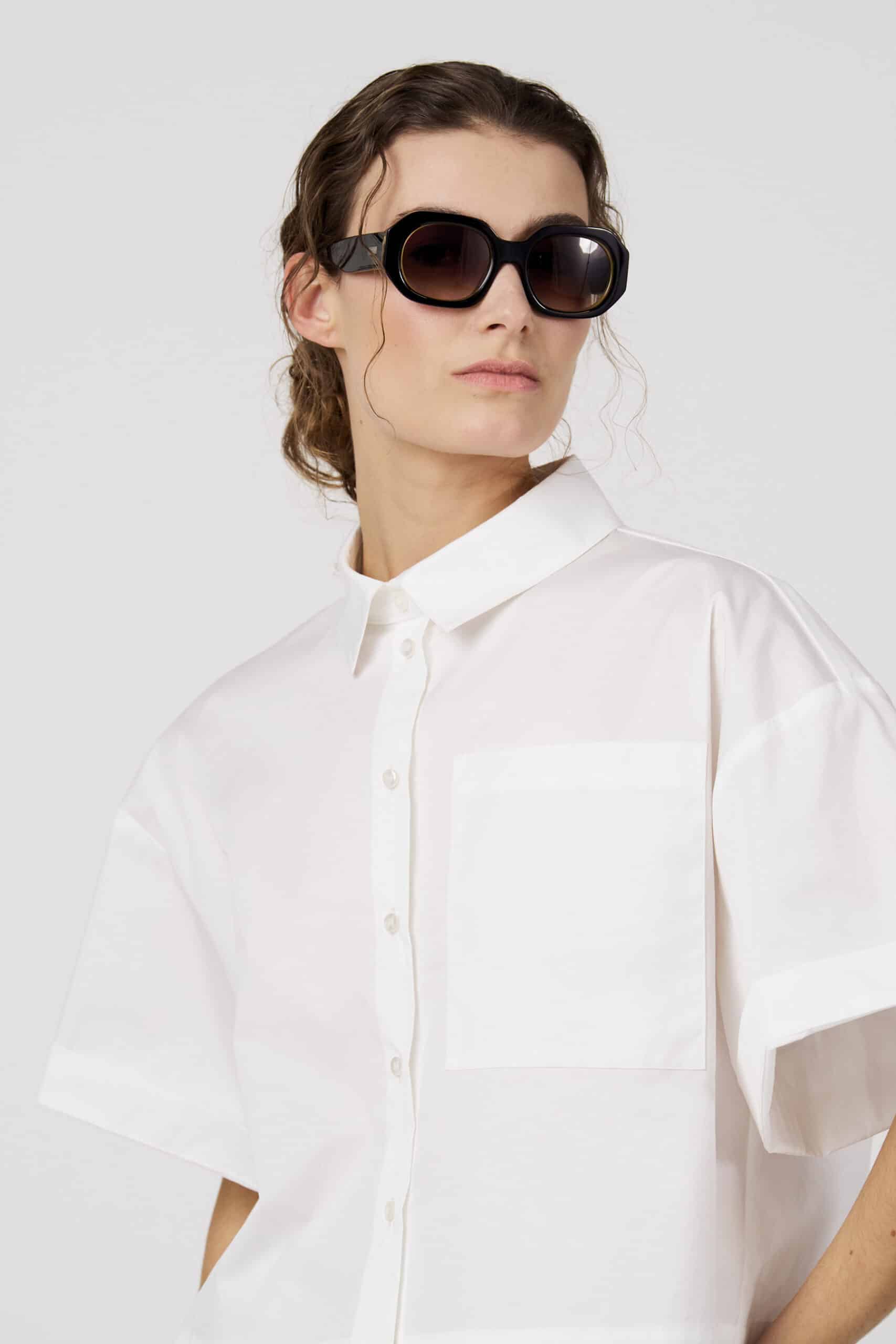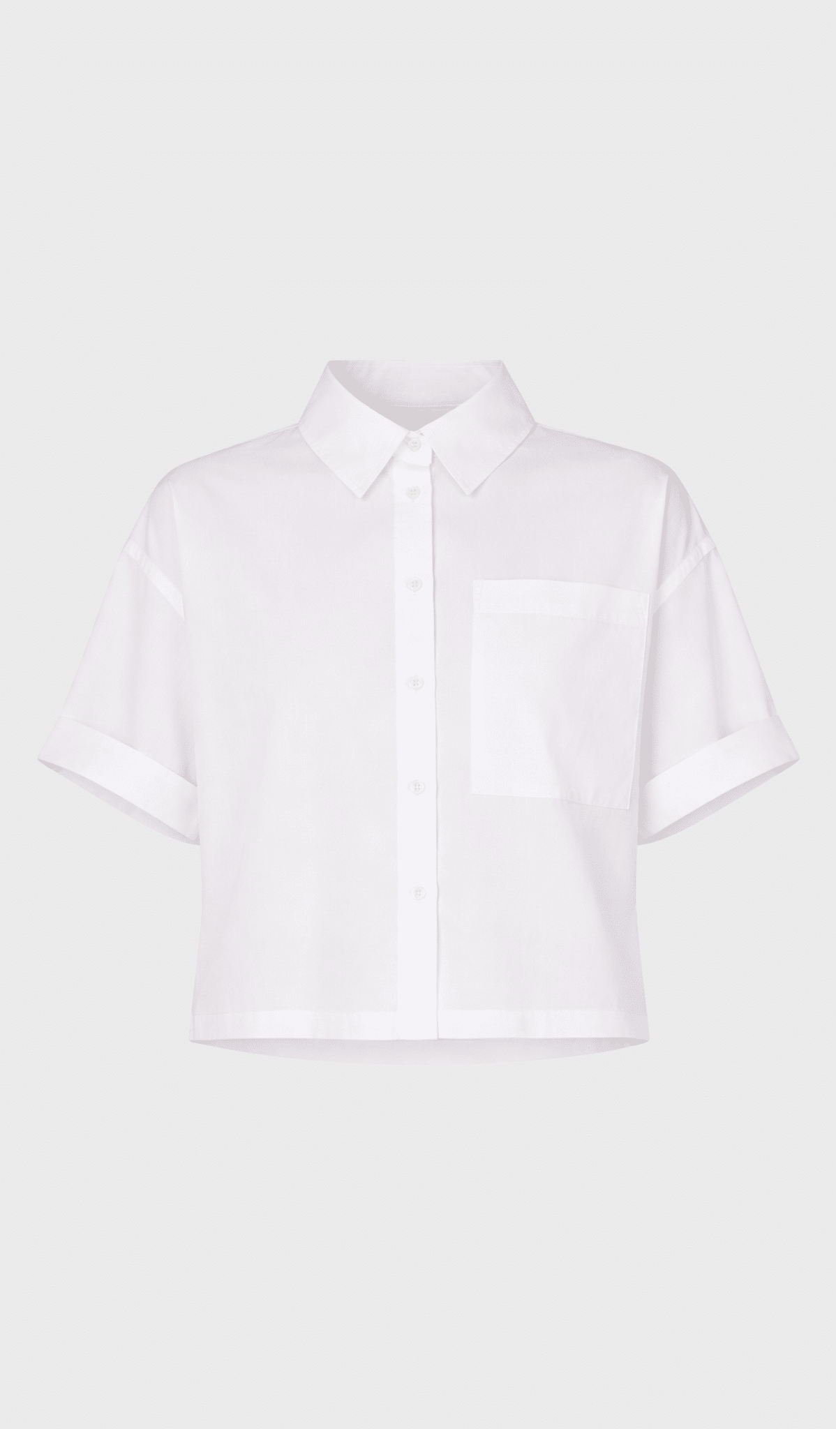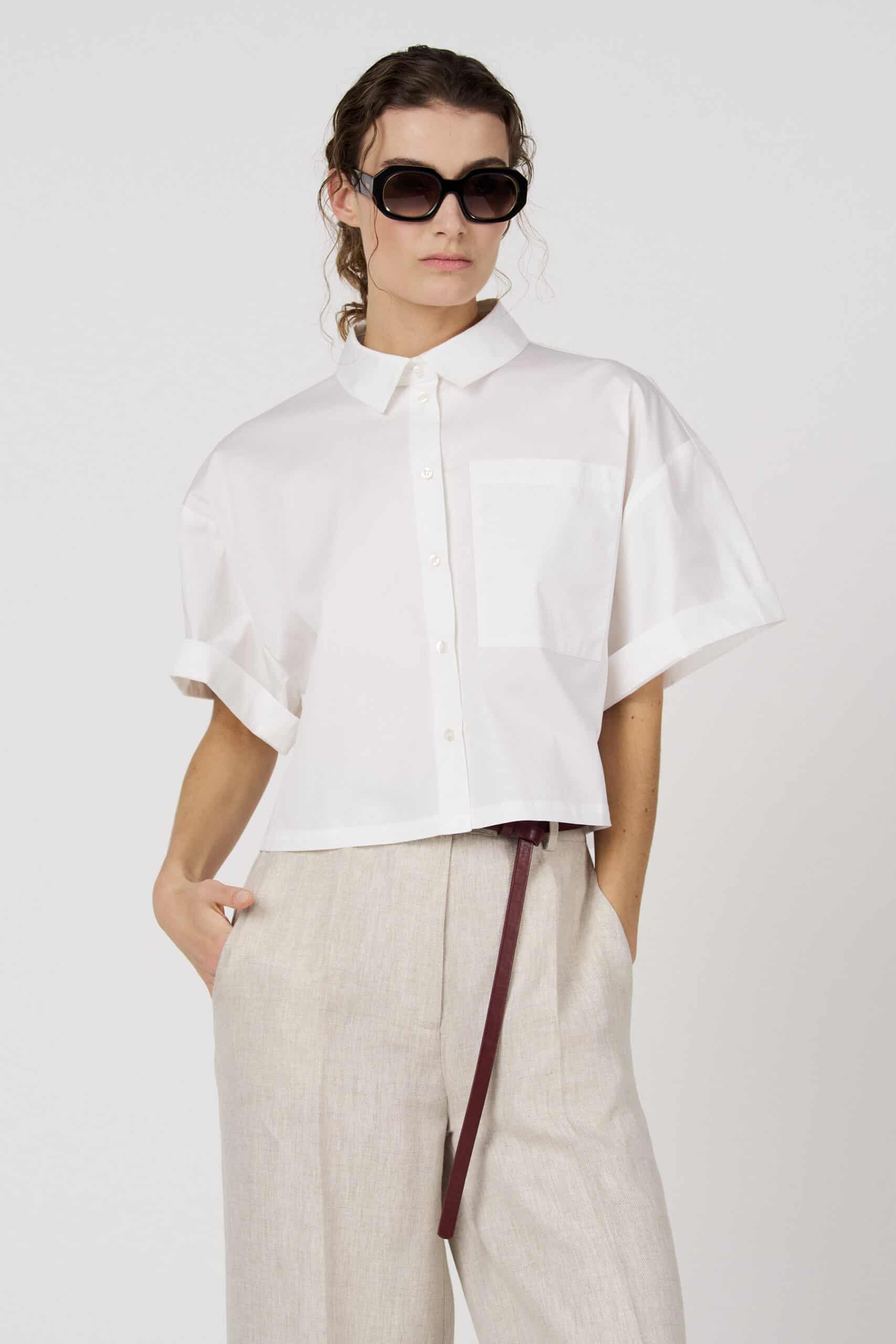 Timeless white blouse with short rolled-up sleeves and a classic collar. The minimalist design and chest pocket create a modern and versatile look. Perfect to wear both casually and in a more dressed-up way.
