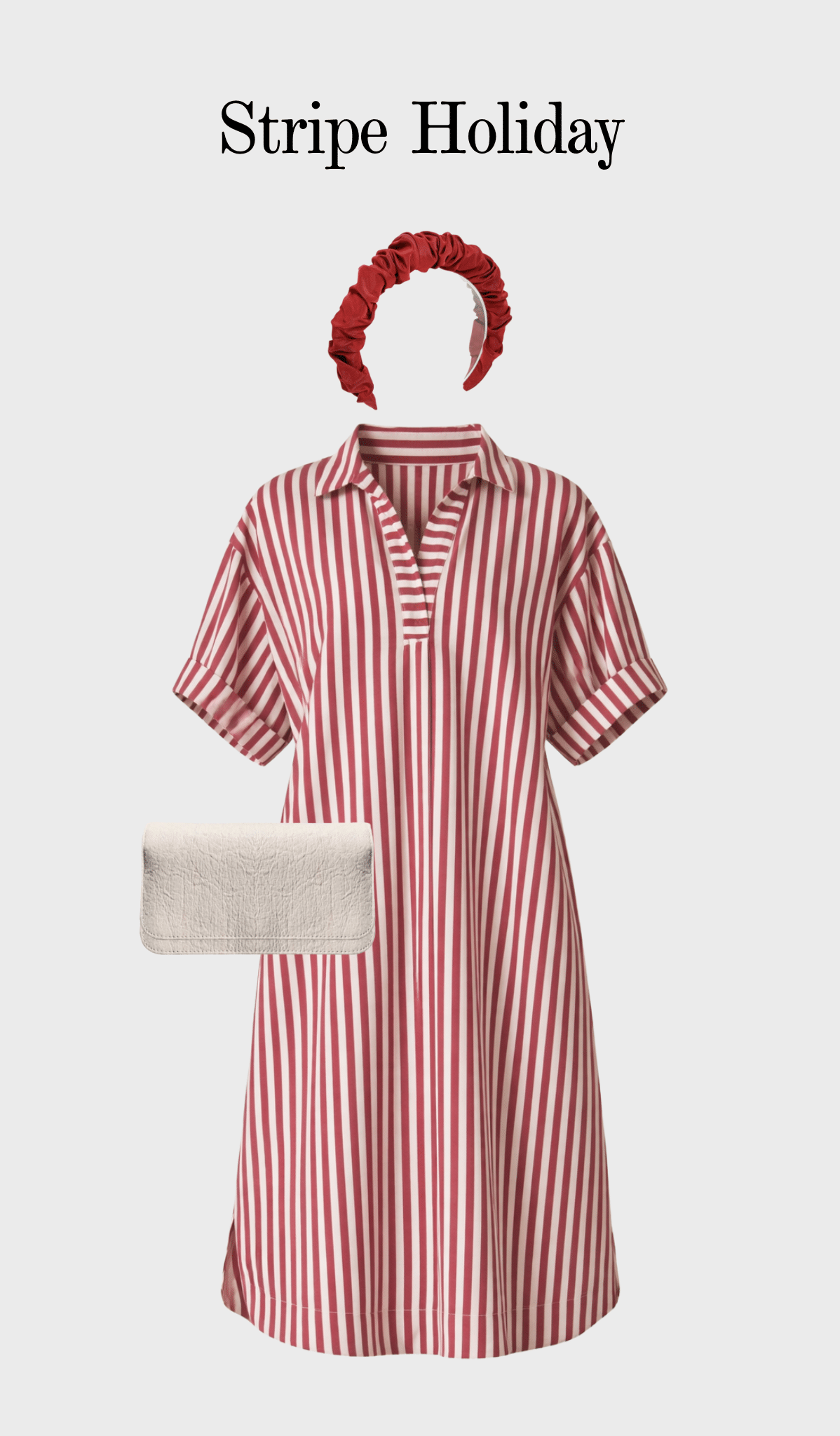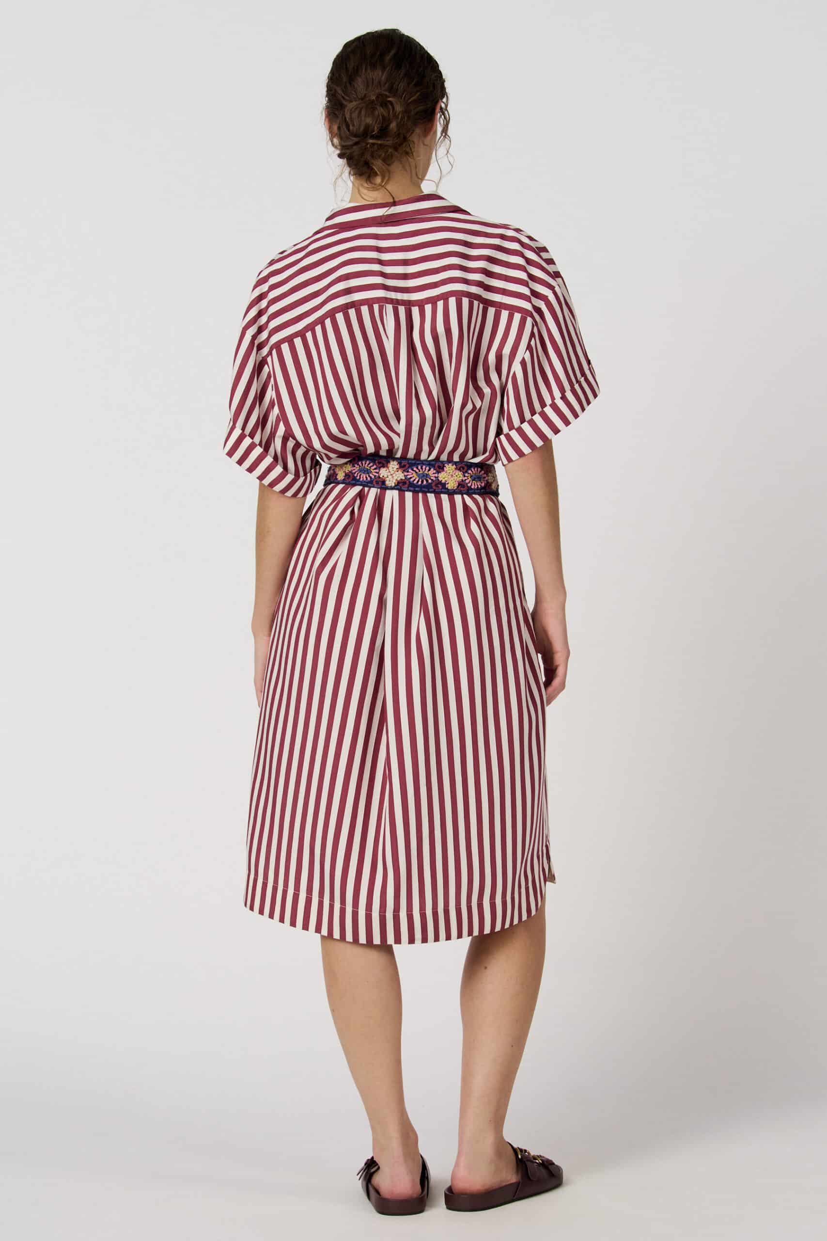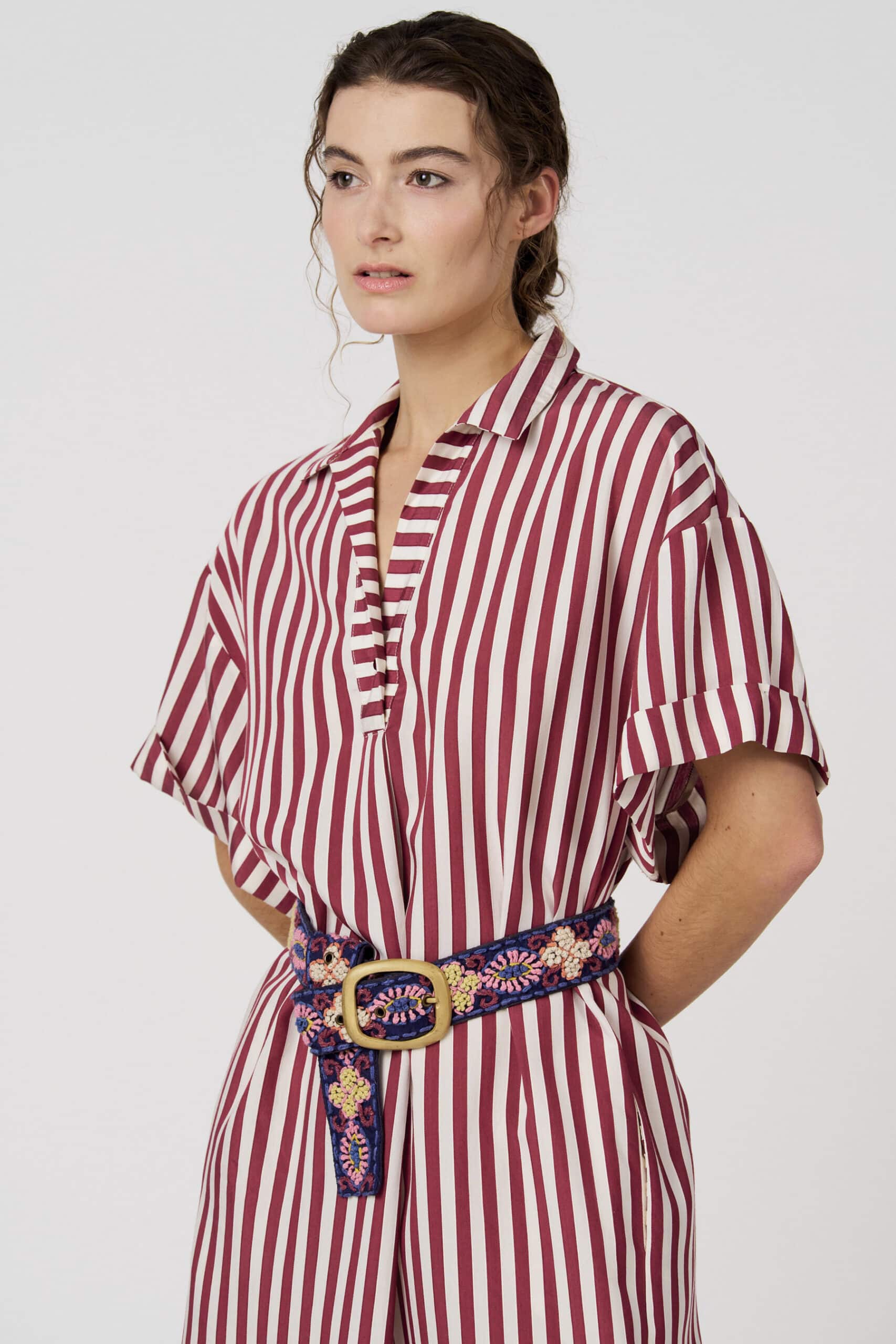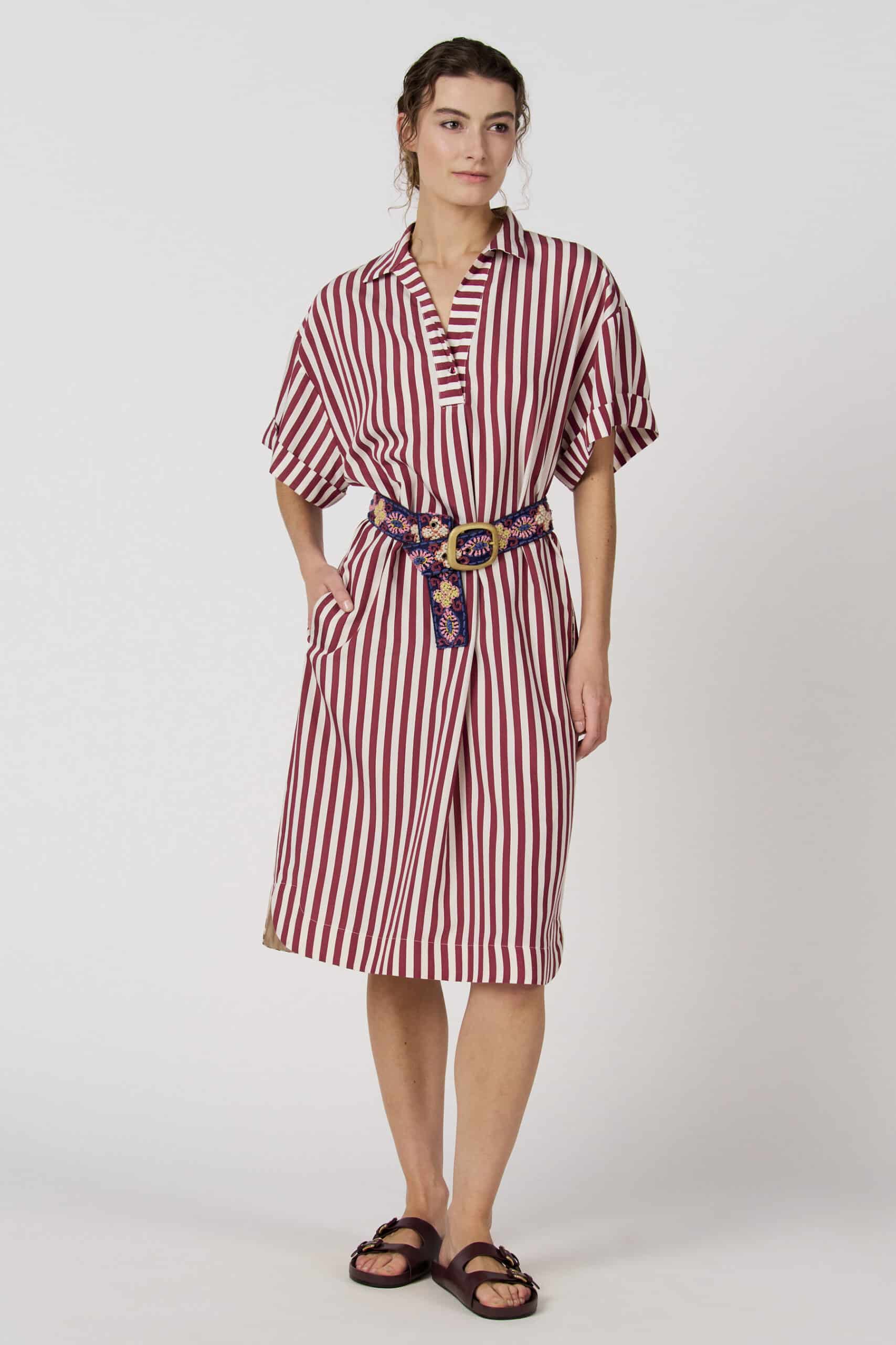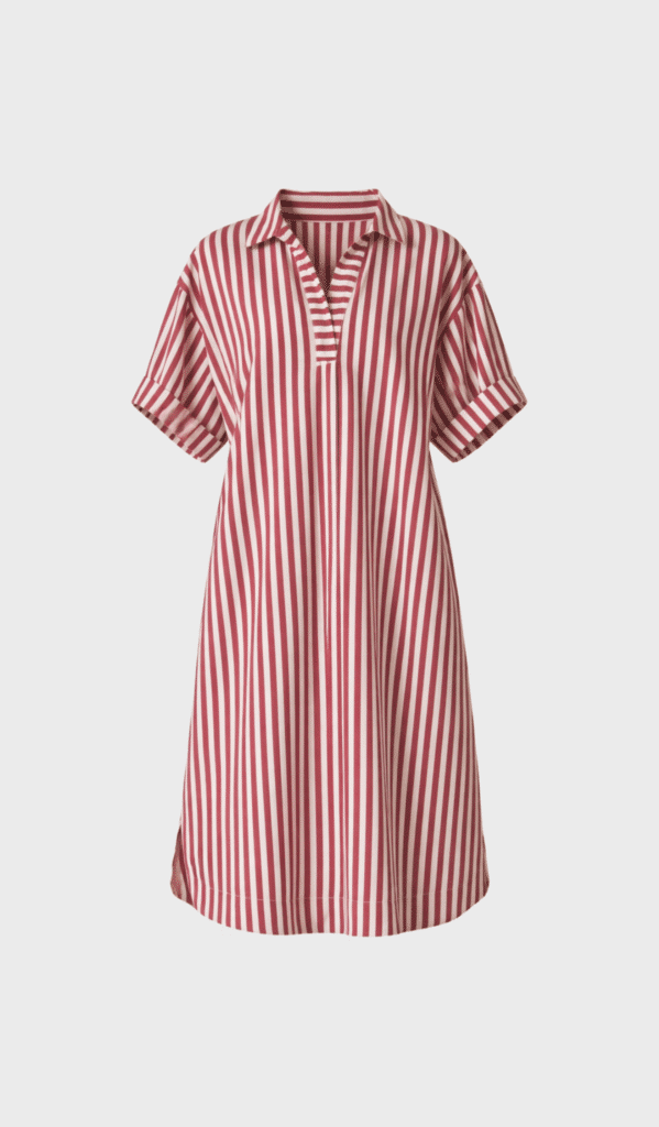 Airy dress with a vertical striped pattern and a loose A-line fit. The short sleeves and collar create a casual yet polished look. Perfect for a comfortable and stylish summer outfit.