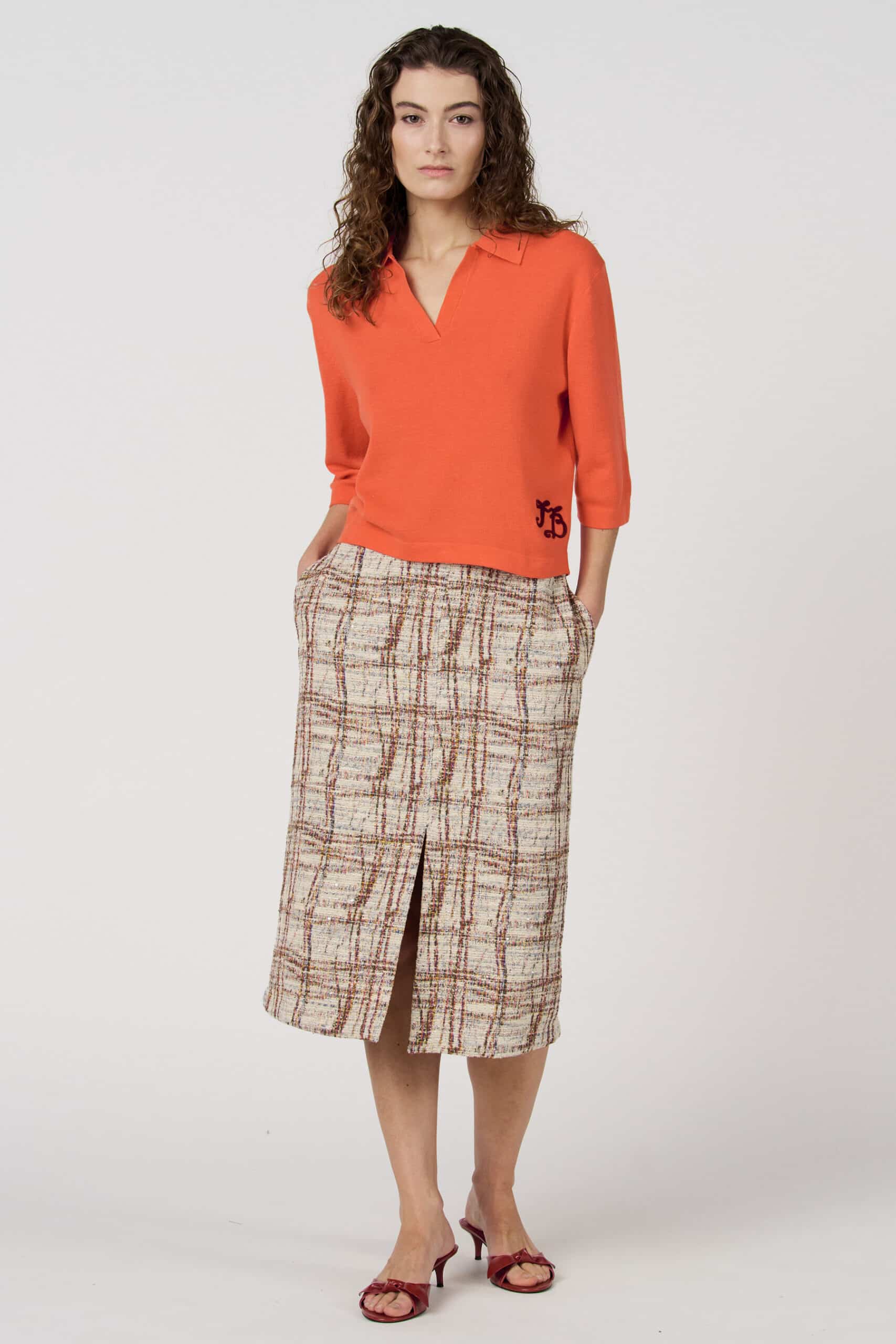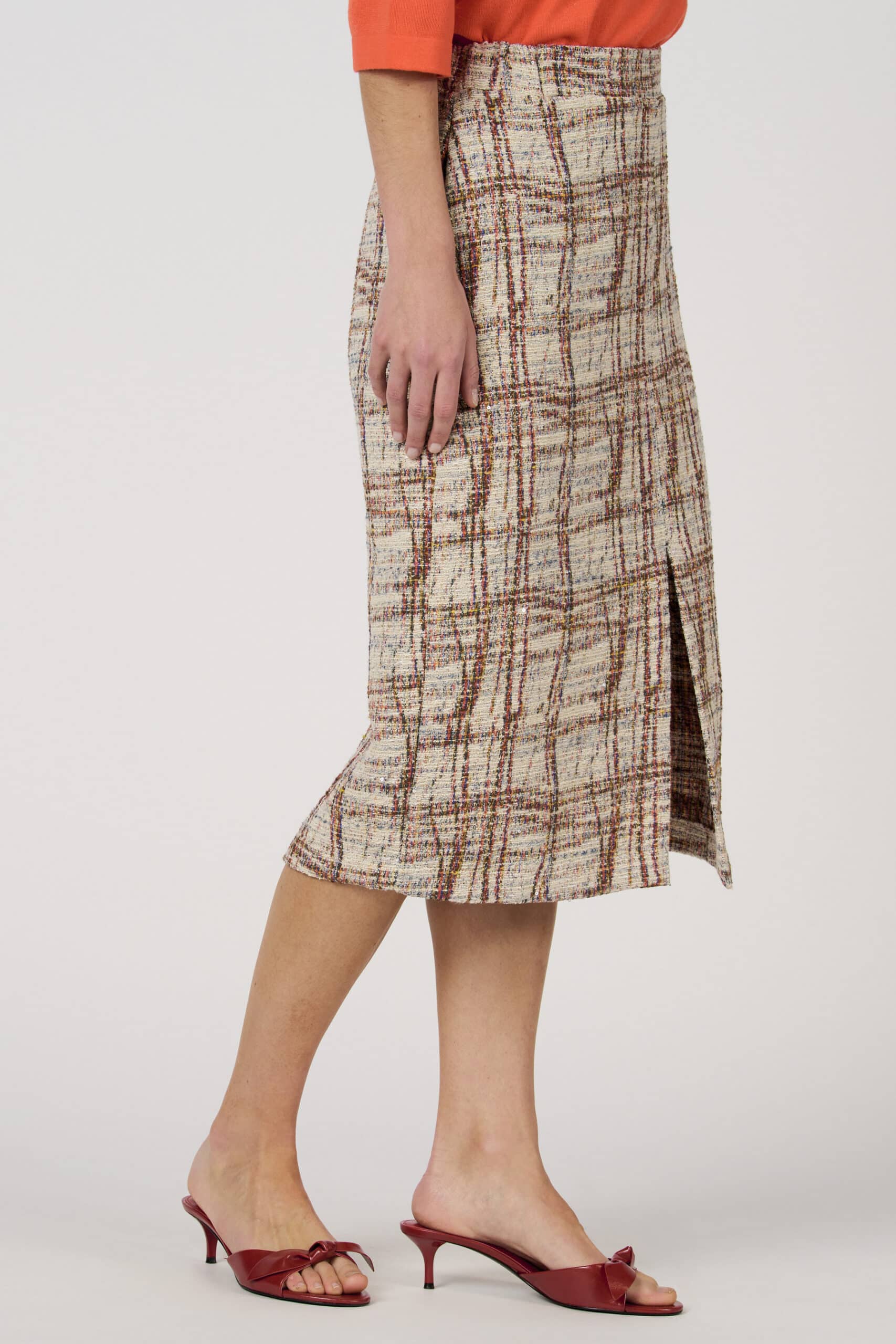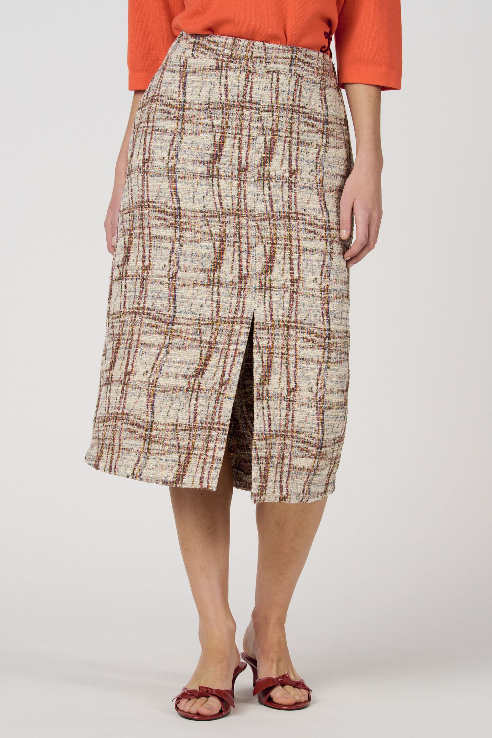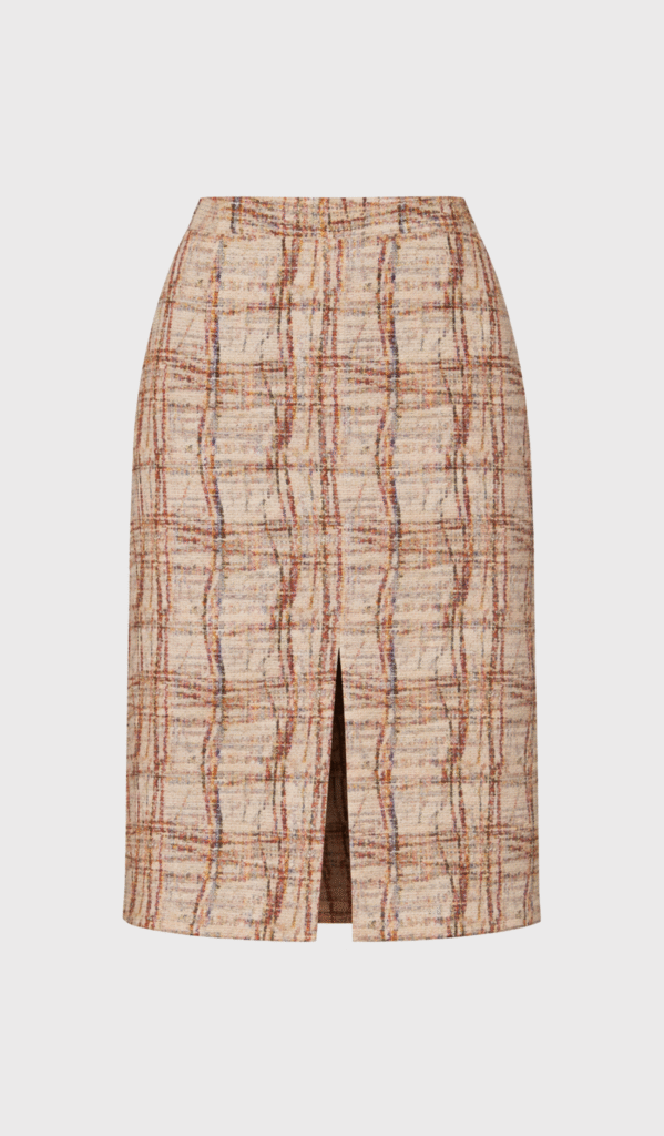Midi skirt in a structured fabric with a subtle checked pattern in warm tones. The straight cut creates an elegant and timeless look, while the front slit adds extra freedom of movement. Pair it with a blouse or knit for a refined yet modern outfit.