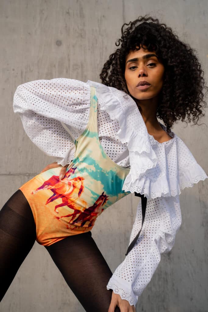 Blouse Bathing Suit by Studio Circulaire is a white colored suit with perforated collar detail, made from a combination from a blouse of ‘Philosophy’ and a bathing suit from ‘We Are Handsome’.