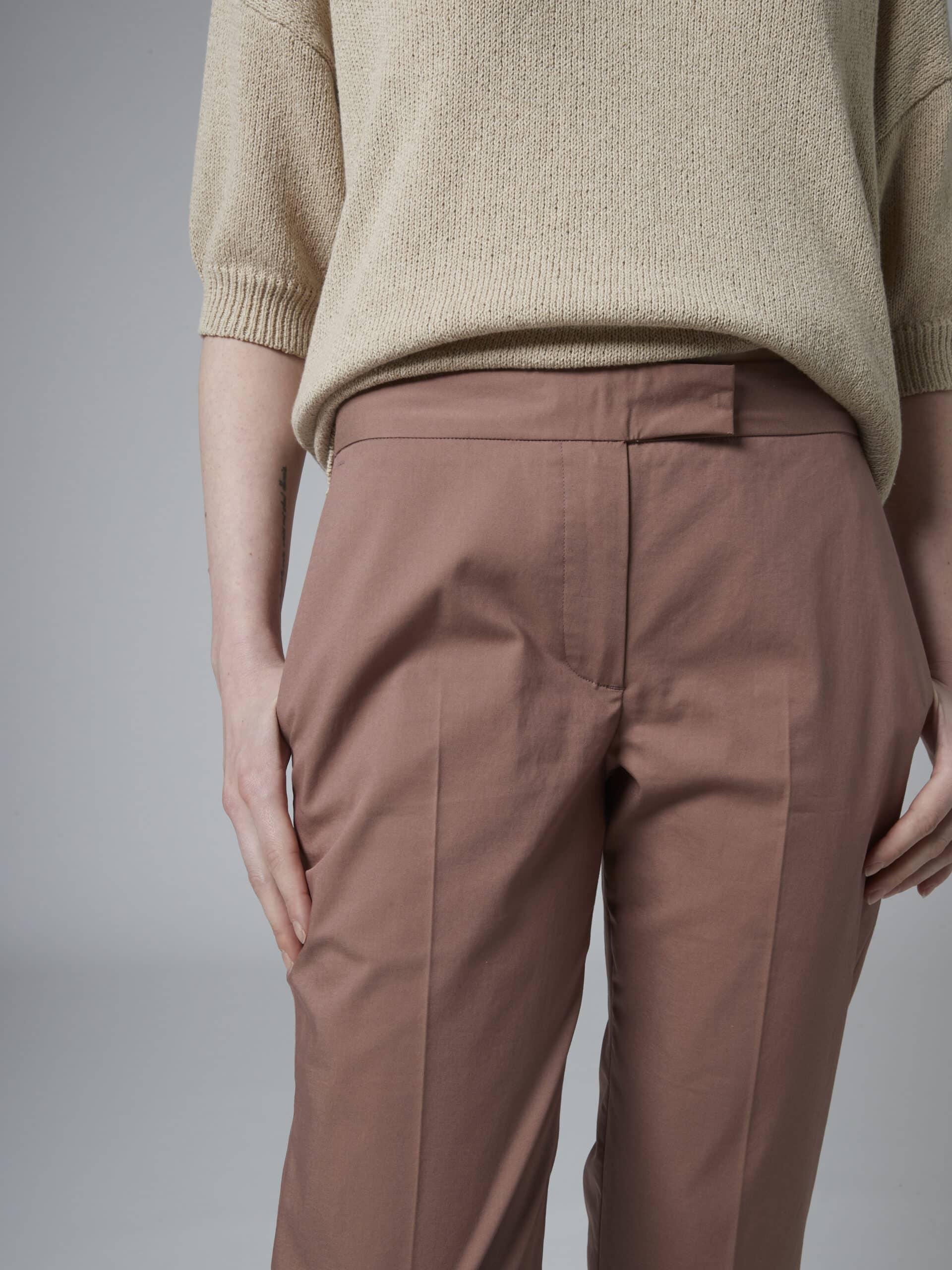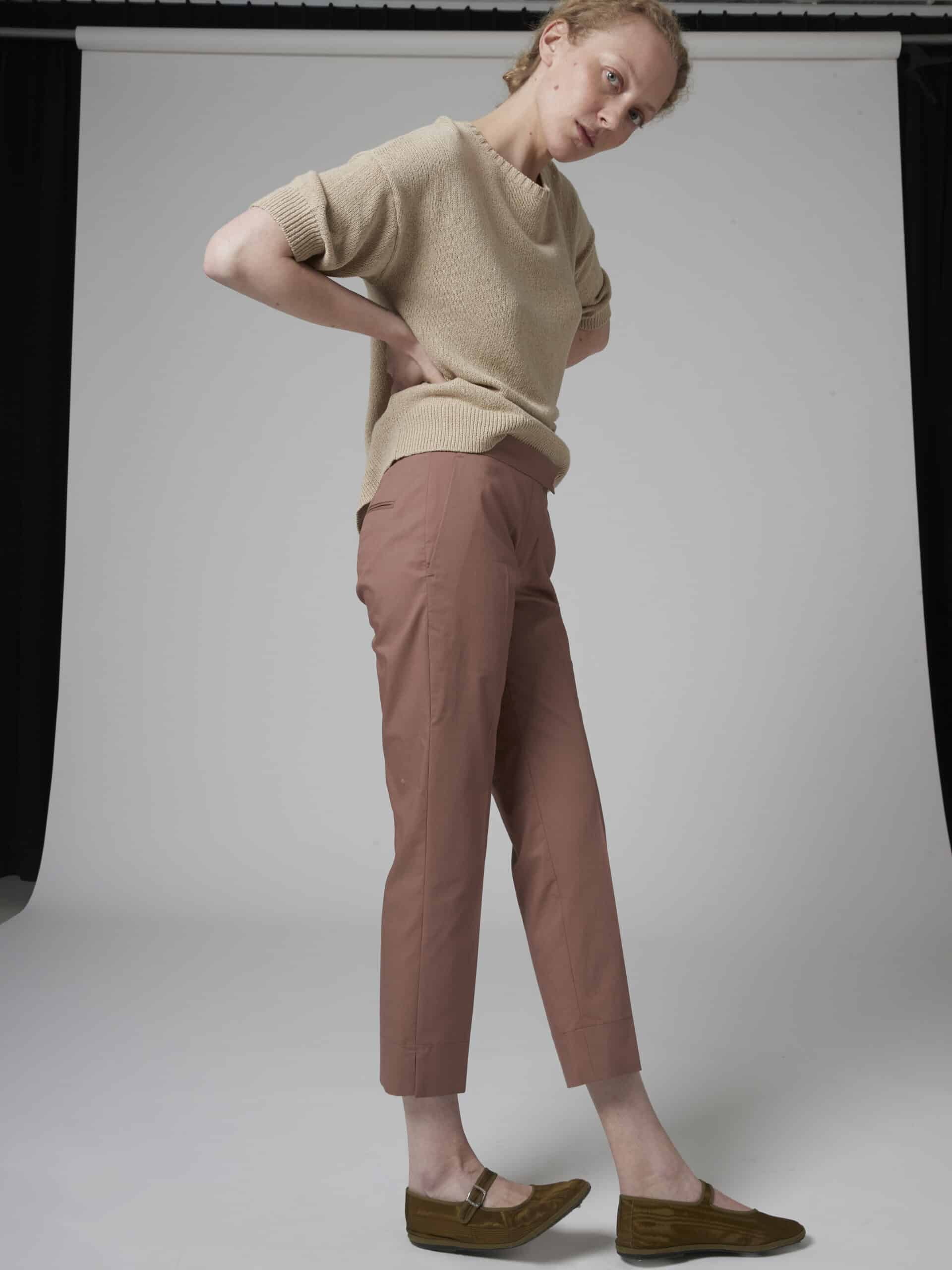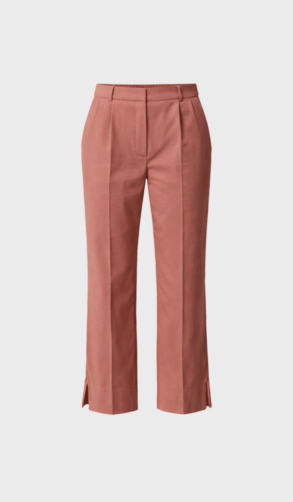 Short length pants, mid waist, Fitted look, side pockets, side splits at the ankle.