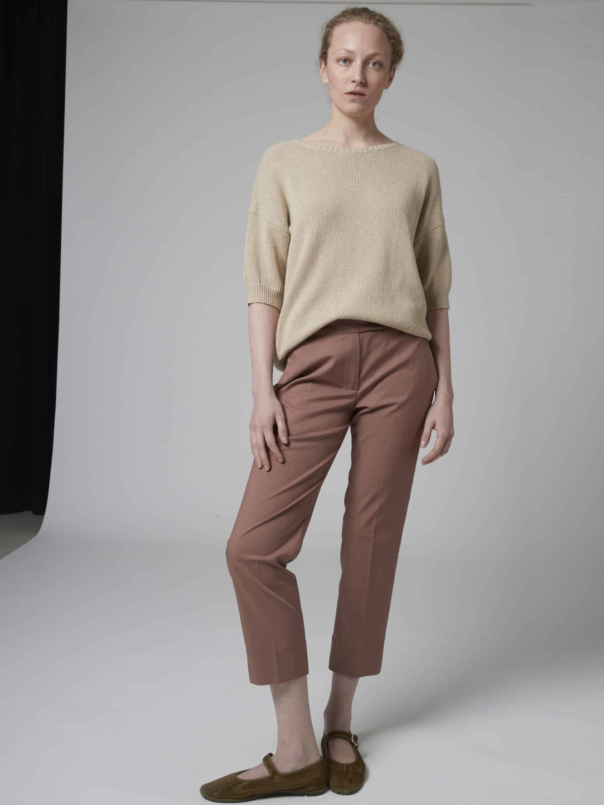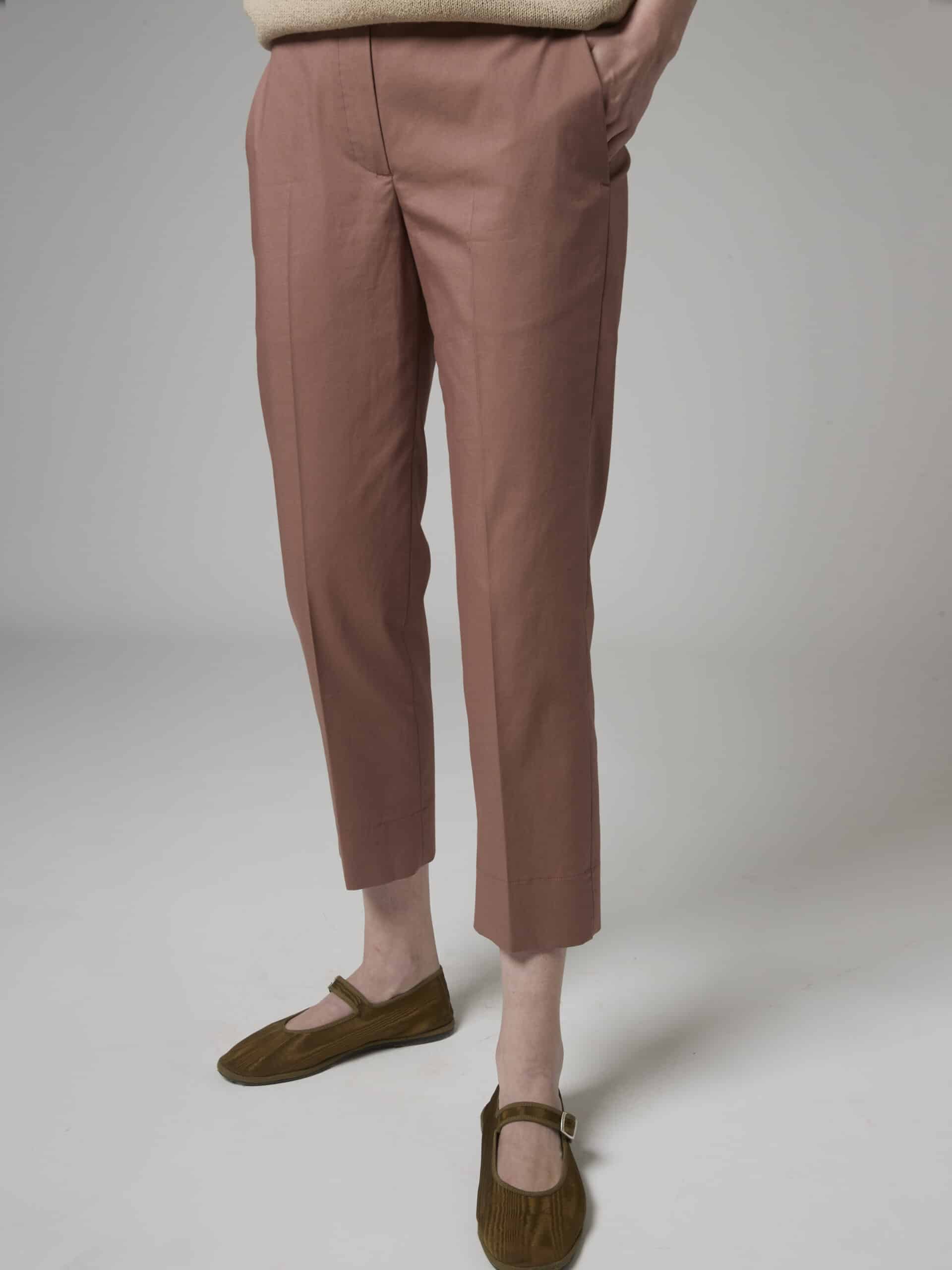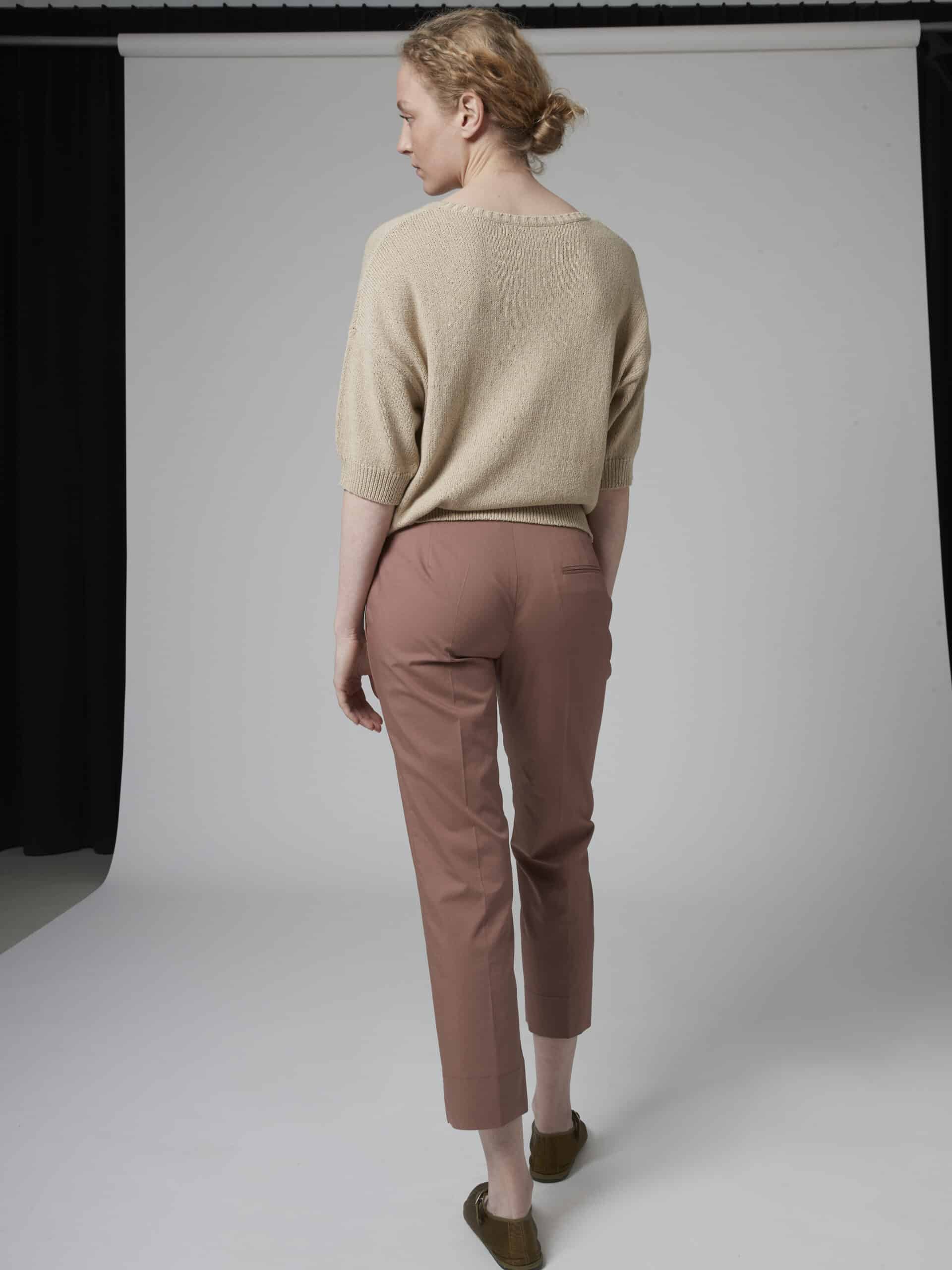 Short length pants, mid waist, Fitted look, side pockets, side splits at the ankle.