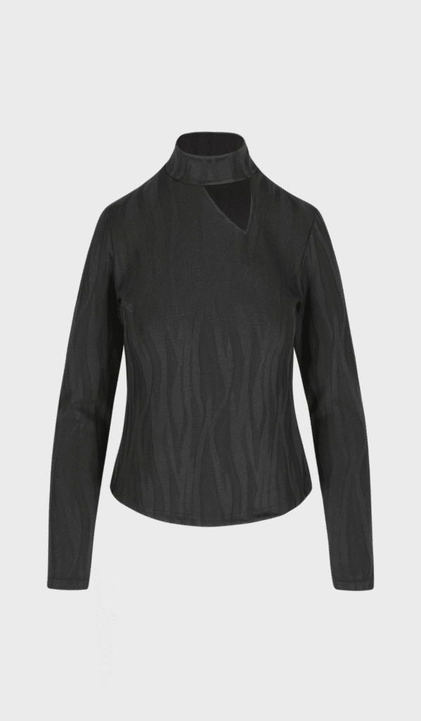 Sculptural black with a subtle tonal motif woven into a resilient fabric. Close fit with a distinctive neckline cut-out for refined appeal.