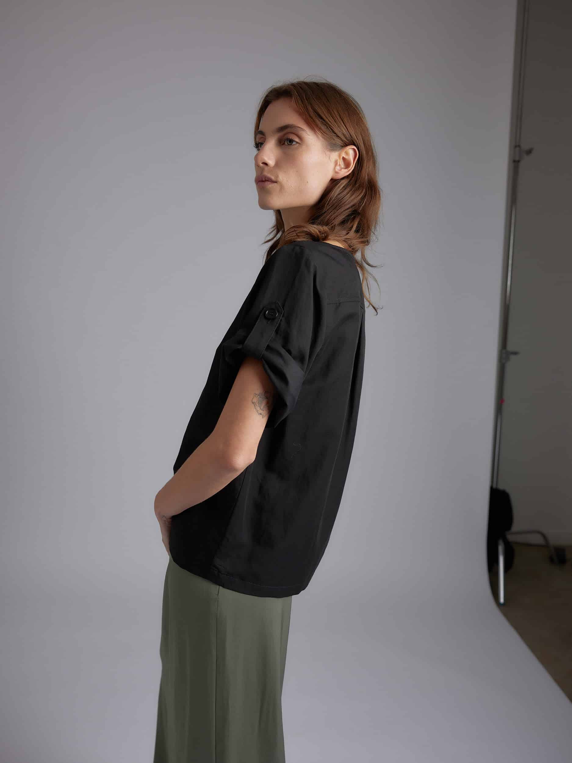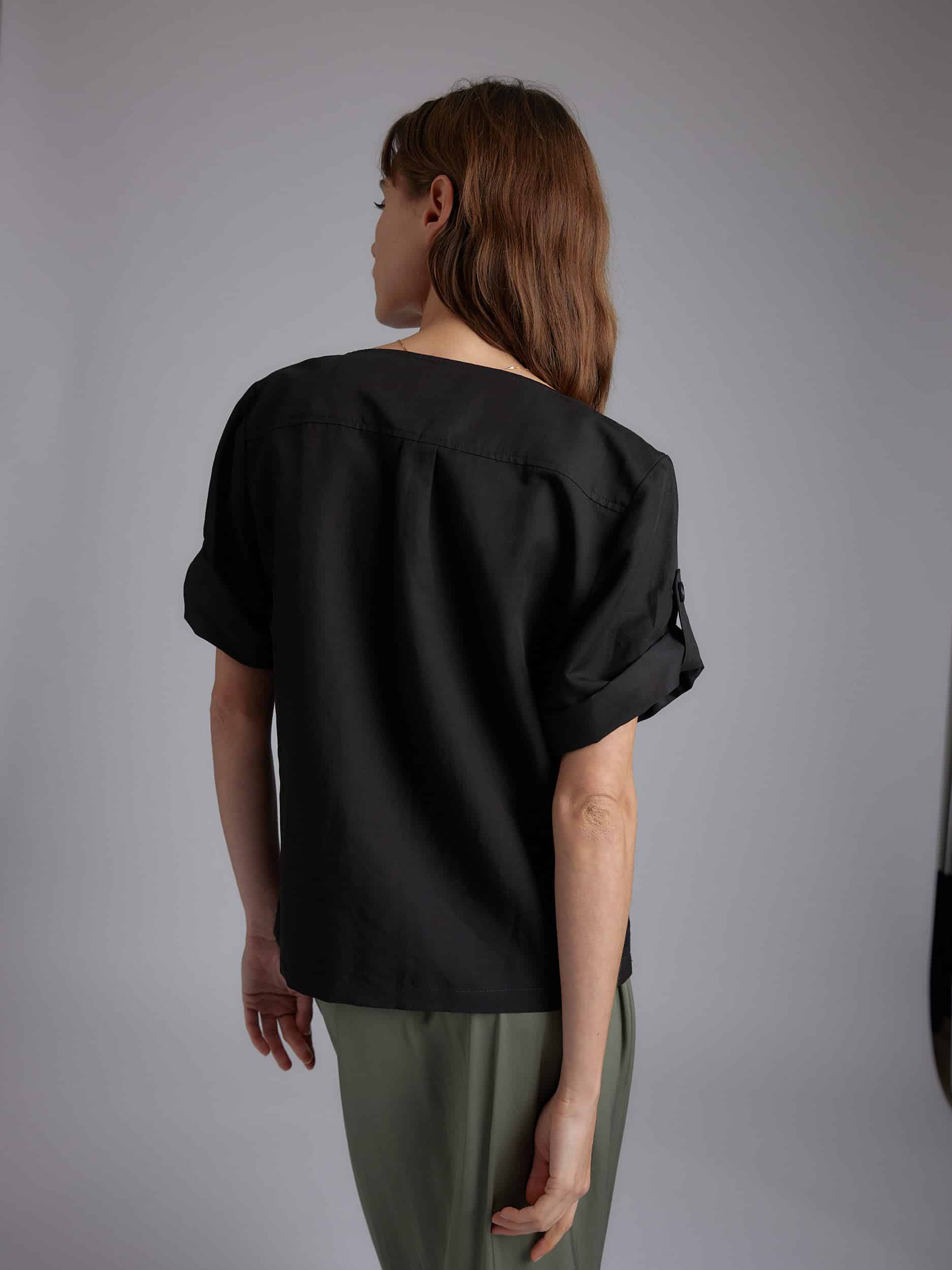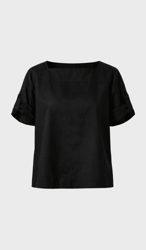 Short sleeves with button detail on the arm. Squared cut collar, straight fit.
