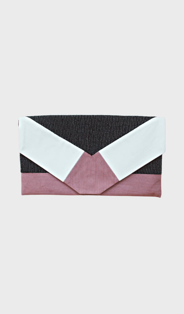 Clutch bag is a small pink and white clutch bag colored.