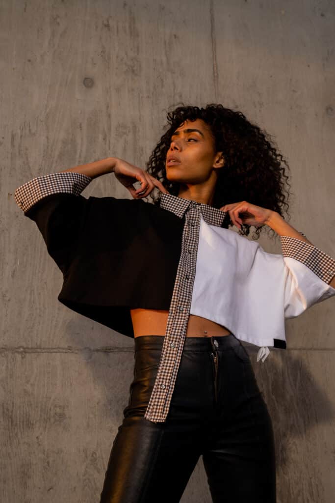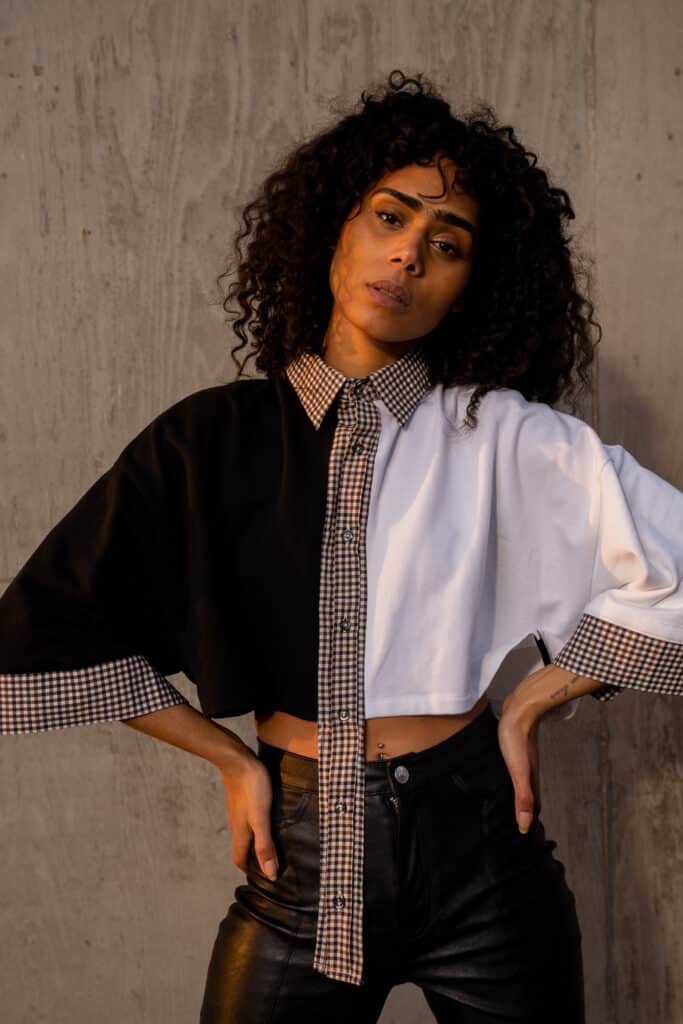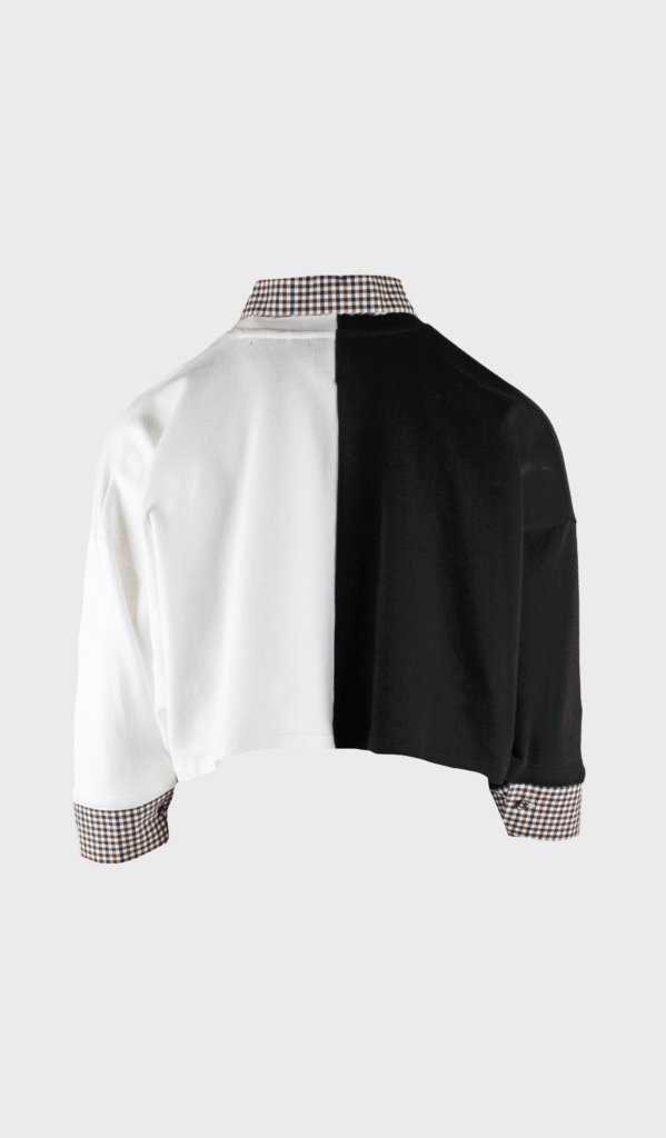 Cropped Sweater by Studio Circulaire is a black & white colored cropped top made from two ‘Fenty’ pieces, a sweater and a checked shirt.