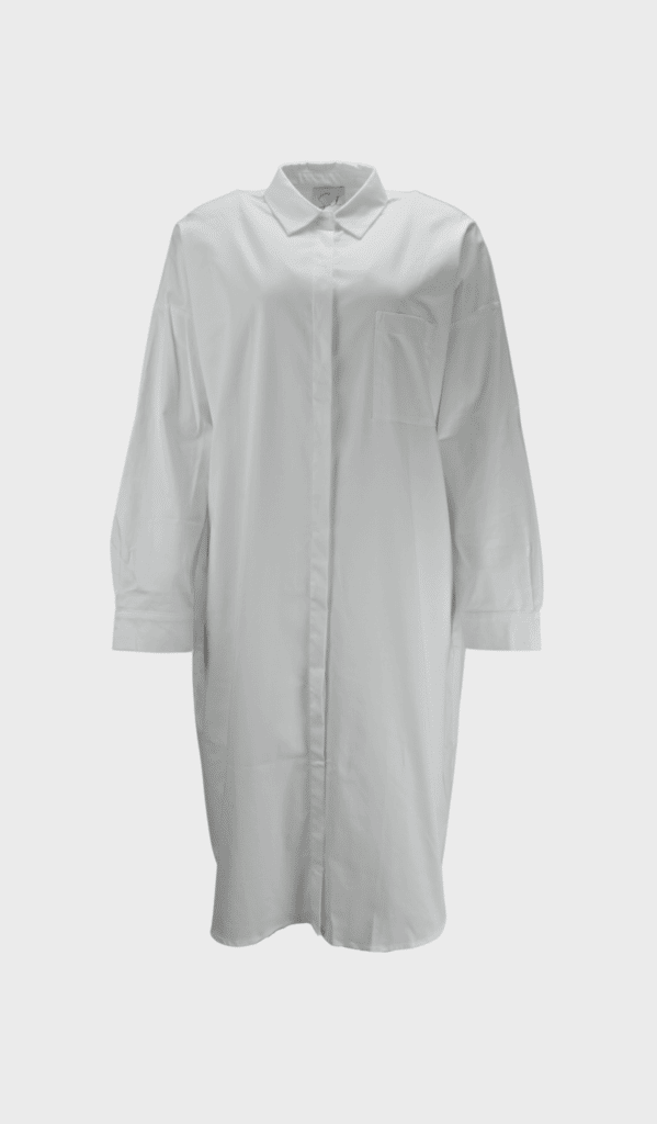 Daddle Dress by SIL is a white colored loose dress shirt with classic collar and long sleeves. Wear this shirt dress with a casual un-tuck style over jeans or wear it open over a slip-on dress for a more casual look.