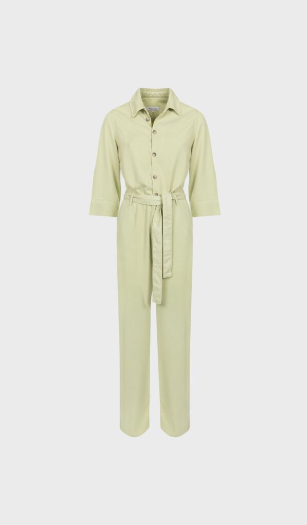 Delta by Terre Bleue is a pistachio colored jumpsuit with collar and row of button on front. Mid length sleeves and ribbon belt on waistline.