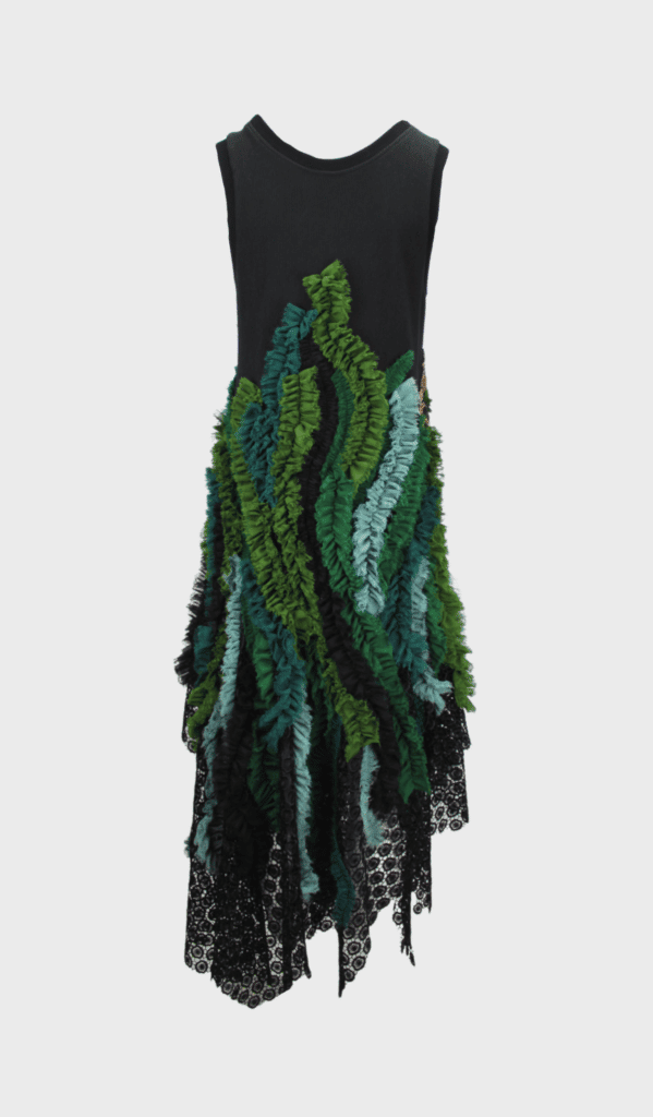 The gold work embroidery goes over in ruffled chiffon in shades of green and black. The green ruffles come in olive green, sage green, moss green, and petrol. They give an organic feel to this unique handmade dress. The raw edge chiffon is reminiscent of seaweed, coming from the inspiration of our Siren concept. We set the ruffles on a black lace base. This dress is asymmetrical. It is shorter on the sides, and longer on the front and in the back.