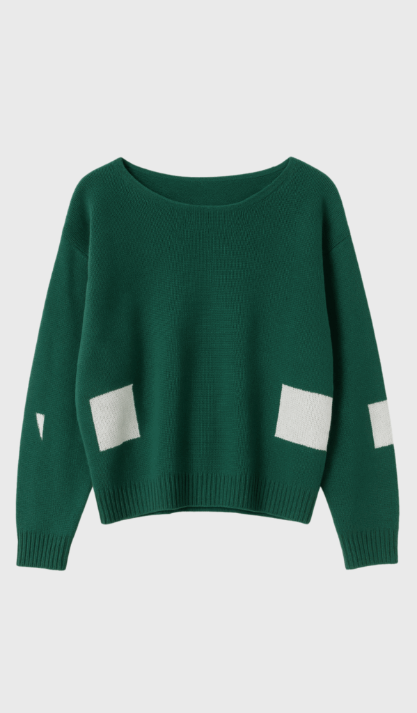 DINA is a relaxed, lightweight sweater in rich green with playful white intarsia detailing on the sleeves and waist. Its light oversized fit and dropped shoulders give it a laid-back silhouette, while the soft blend of 85% cotton and 15% cashmere offers breathable luxury.