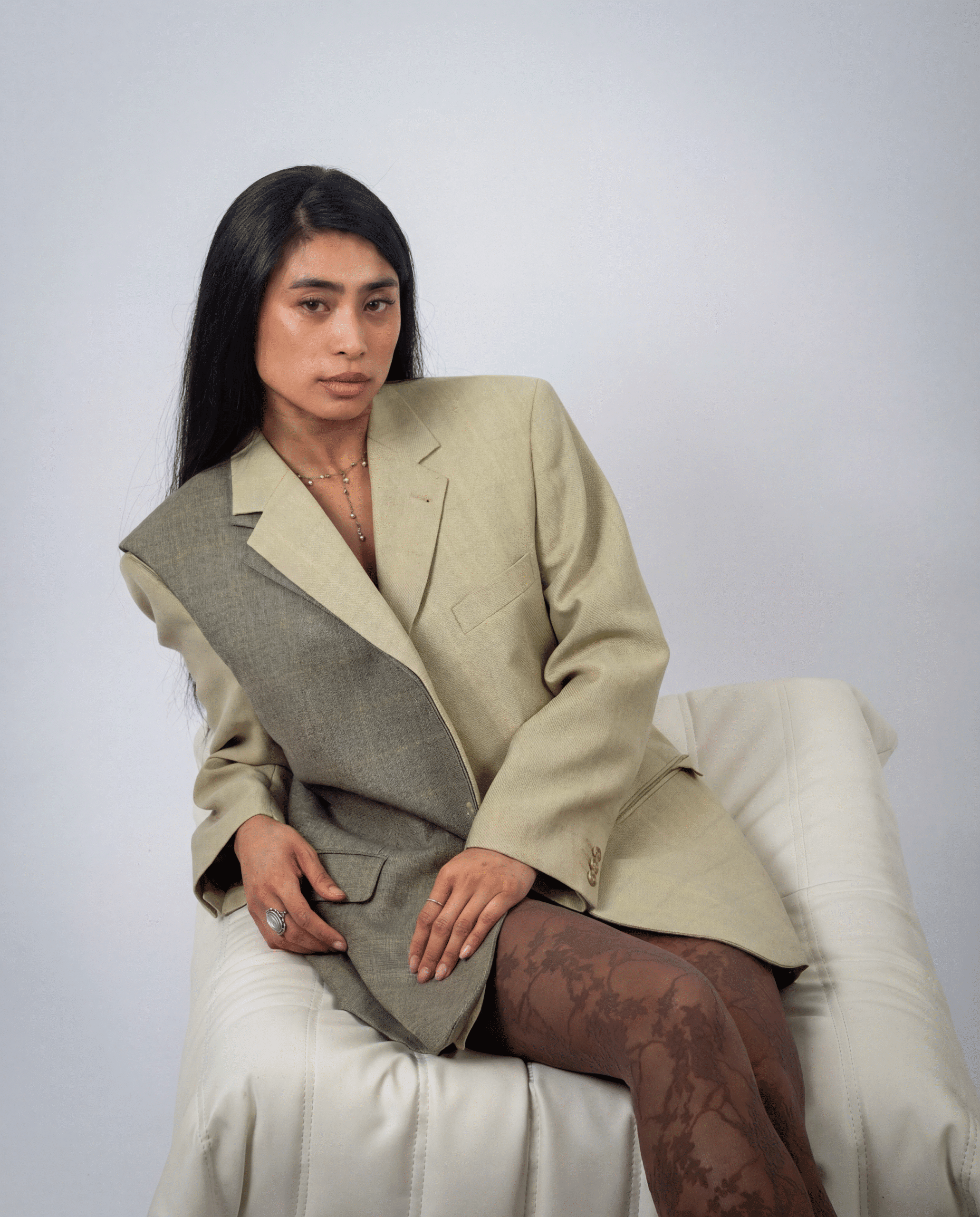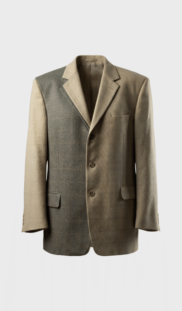 Crafted from two high-quality blazers, this upcycled piece merges classic tailoring and layering. A green checked blazer panel is deconstructed and stitched over a beige wool base. Original blazer elements such as lapels, buttons, and pocket outlines are preserved. The back reveals a full-length vertical seam where both garments join.