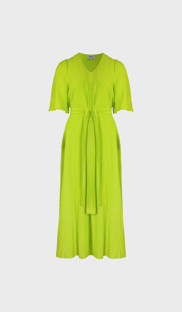 From a party paired with sandals to a day at the office with trainers, this green-yellow midi dress for women will have you wearing it all spring and summer long. This colorful statement item features a V-neckline, short, wide sleeves and a matching ribbon to accentuate your waist. In addition, discover the playful texture and side slit. Contains 85% viscose, among other ingredients.