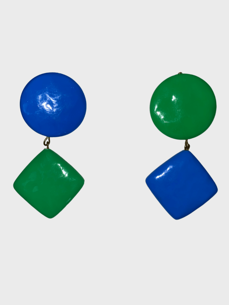Duo Drop Earrings by LIVE TO EXPRESS is a pair of minimalistic yet colorful statement earrings. The Duo Drop Earrings are designed and made in the 1980’s, but never worn before. They have a clip-on closing.