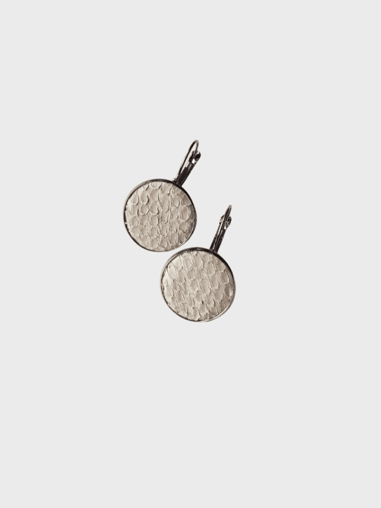 These elegant round earrings, in ecological fish skin, are handmade and inlaid in an anti-allergic (rhodium) cabuchon with a closed hook. The earrings are made from salmon fish skin that has been tanned into leather and colored with organics. This leather has a nice texture and a special pattern, the colors vary making each pair of earrings unique. They are very light-weighted and can be worn everyday or with a sporty outfit.