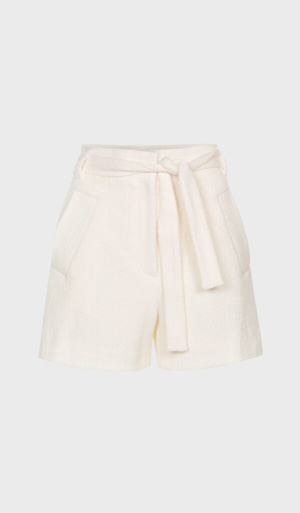 Edwin Salvia by Gigue is an ecru colored high waisted shorts with zipper and button detail on front. Belt ribbon at the waistline and side pockets. Perfect with a chic sweater or a blazer.