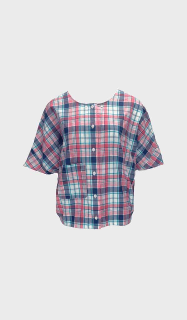 Estelle Blouse by Renée is a checkered pink and blue colored shortsleeved and oversized blouse. This blouse is made from leftover fabrics.