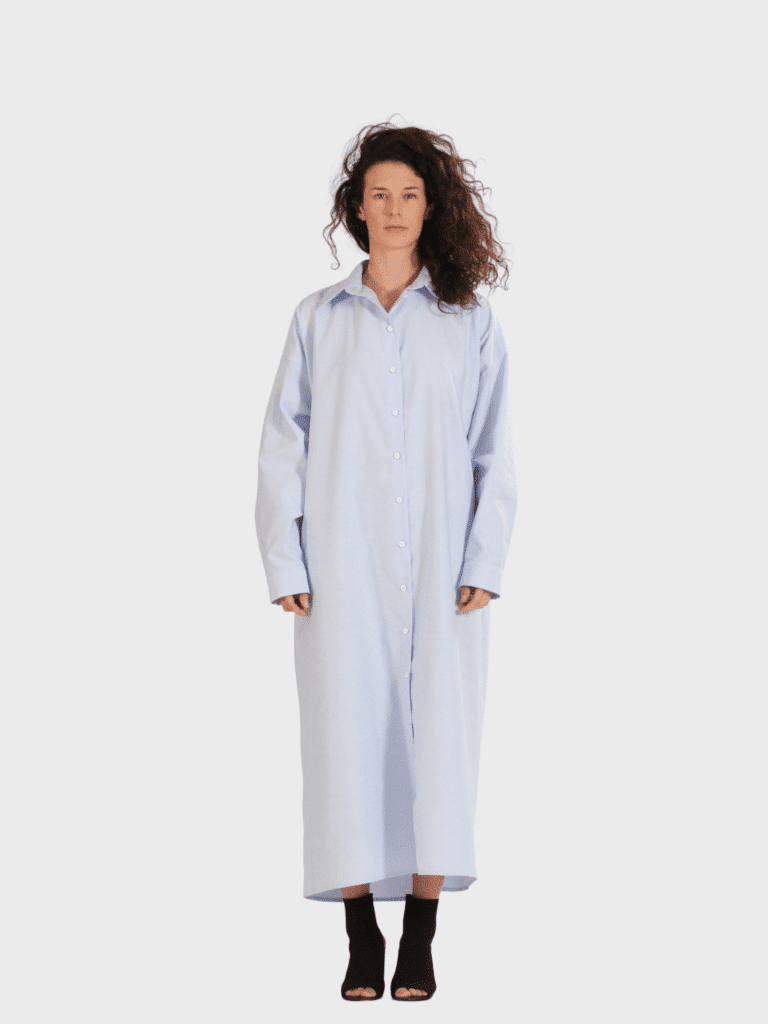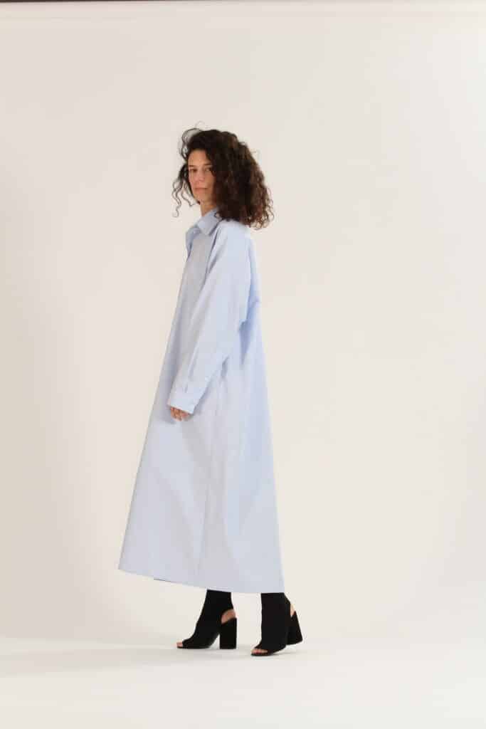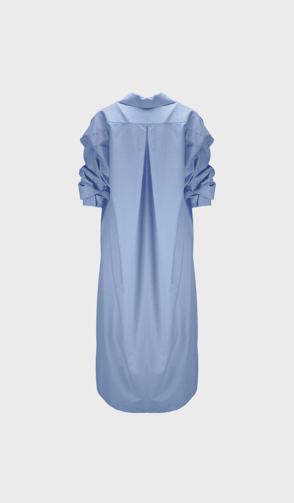 Men’s inspired shirt dress with a crafted XL pleat on the back for an overly fluid silhouette. A loose-cut with voluminous sleeves.
