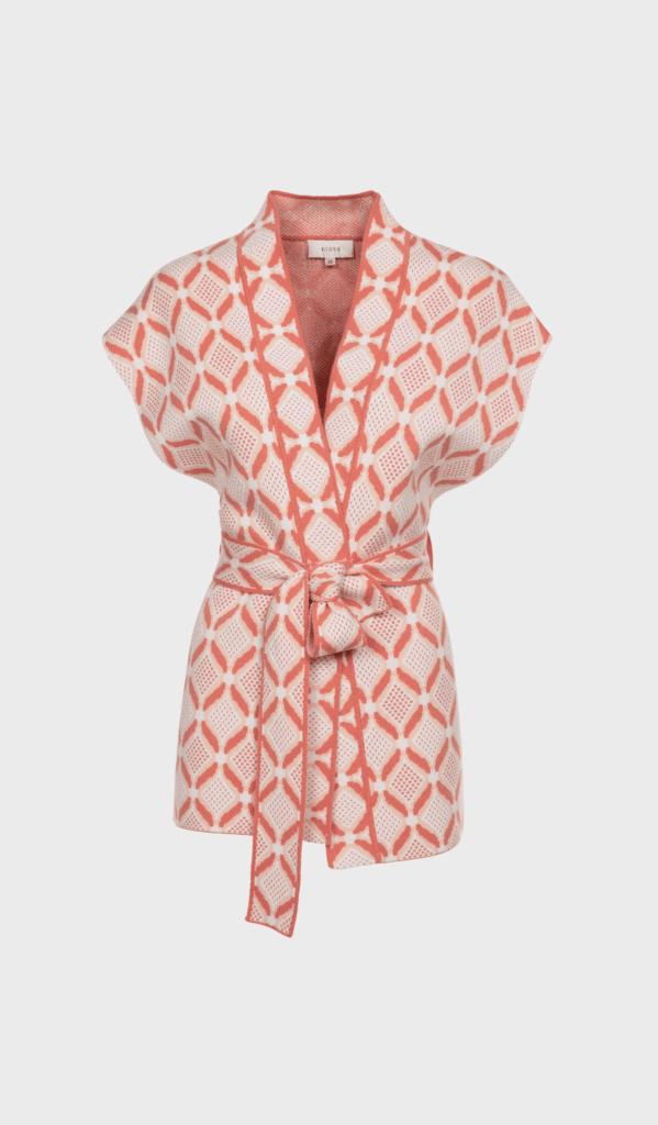 Foll by Gigue is a flamingo pink colored pull-on vest with deep V-neckline and ribbon belt at waistline. All over white and pink geometrical pattern.