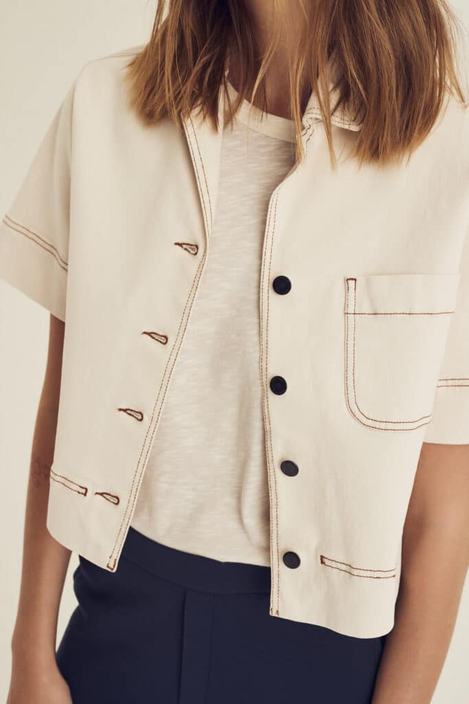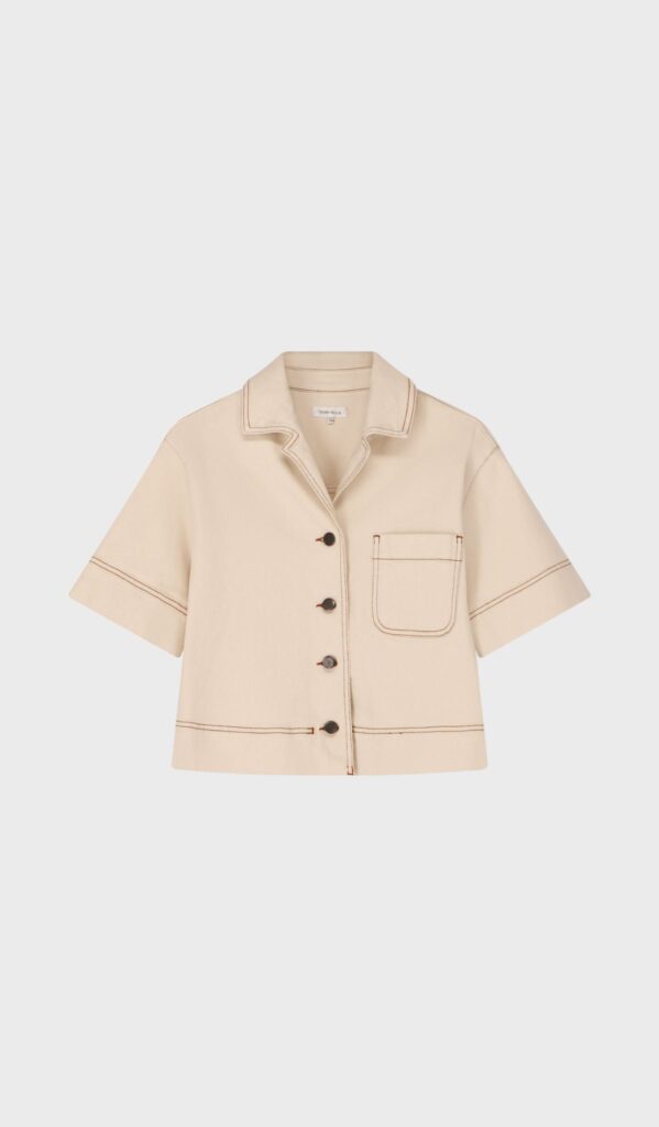 Hava is an ivory short-sleeved blouse with buttons.