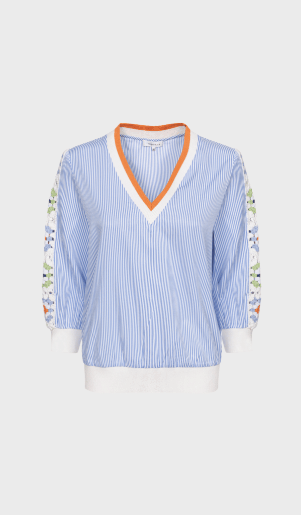 Helsinki by Terre Bleue is a white and lavender striped sweater with deep V-neckline on front. Long puffed sleeves. Sleeves with printed section on the back.