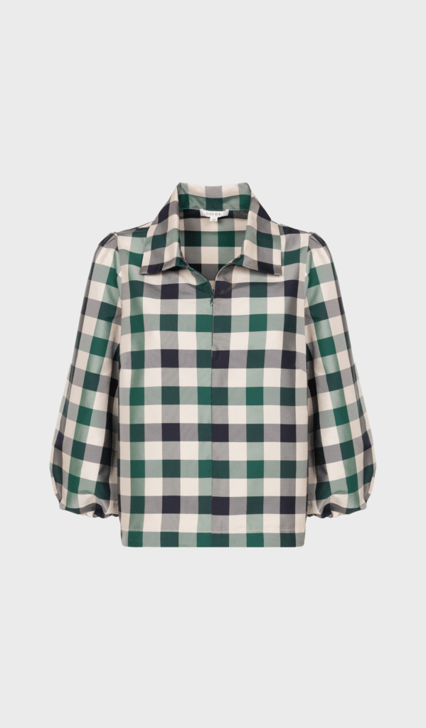 Hermin by Gigue is an emerald green colored blouse with collar and slightly puffed up sleeves. Green and black all around pattern. Pair it with the matching pants.