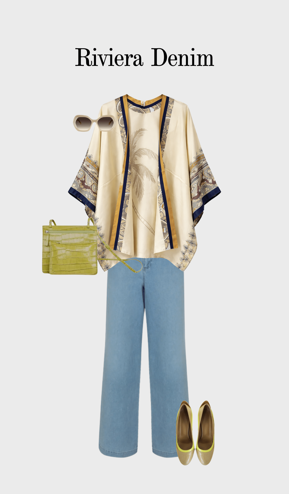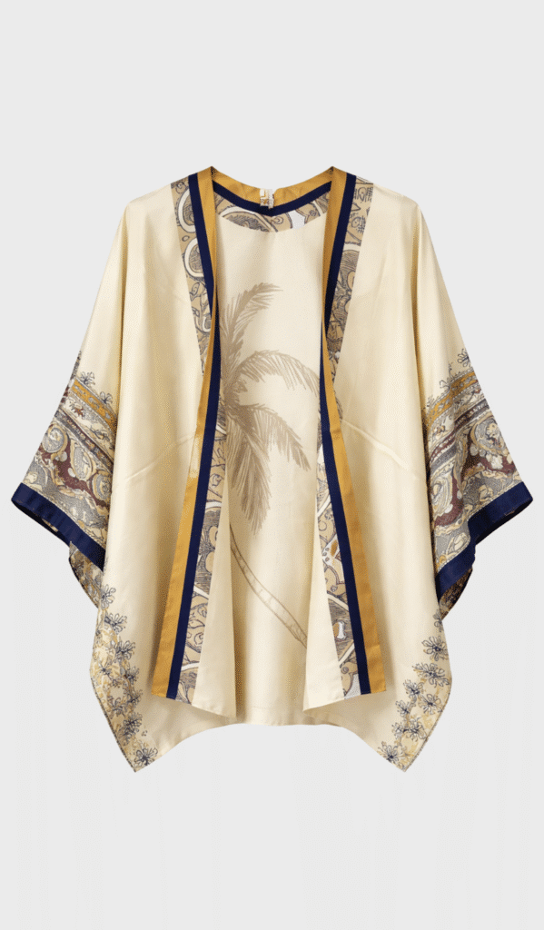 Short kimono with sleeves in 100% silk with a palmtree design.