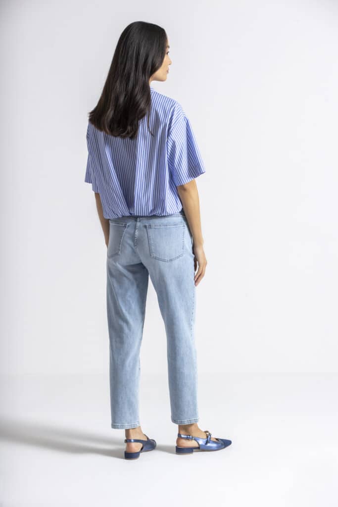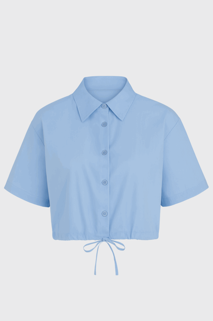 Short white blouse with drawstrings. Model is wearing the striped version of the Holiday, the item you will be renting is a beautiful blue satin color.
