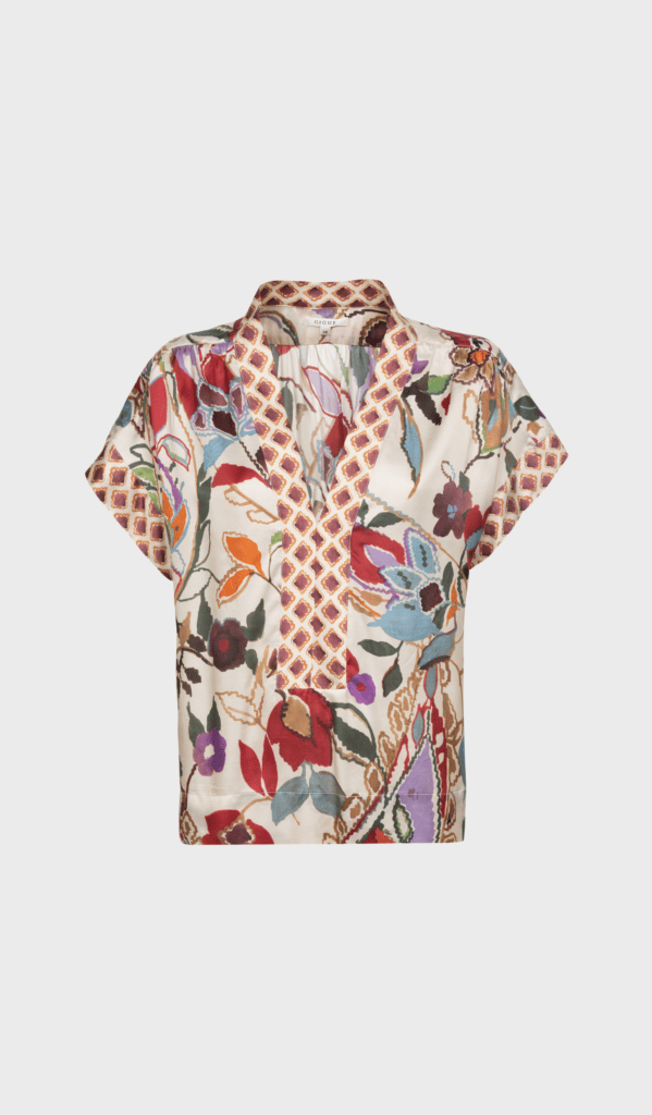 Hostel by Gigue is a mastic colored relaxed-fit blouse with deep V-neckline on front. All over multicolor flower print.