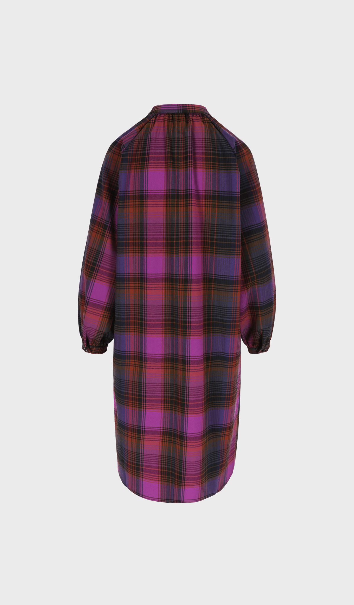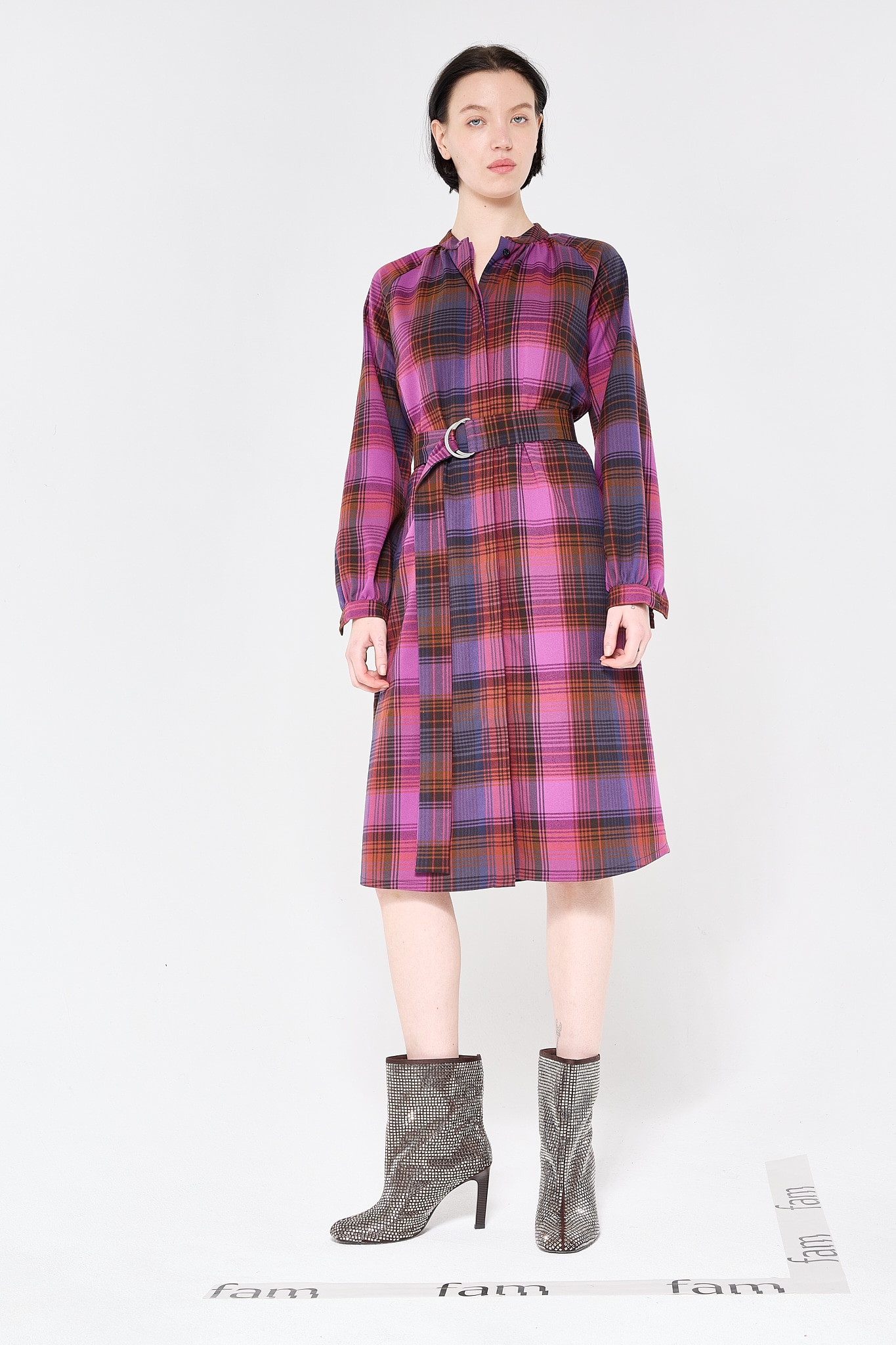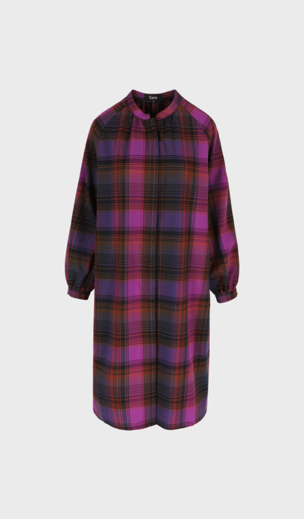 Vibrant check — with bold pink, navy blue and a flash of orange,  all in a soft feel drape. Relaxed dress ending just below the knee, with removable belt for a cinched or loose look