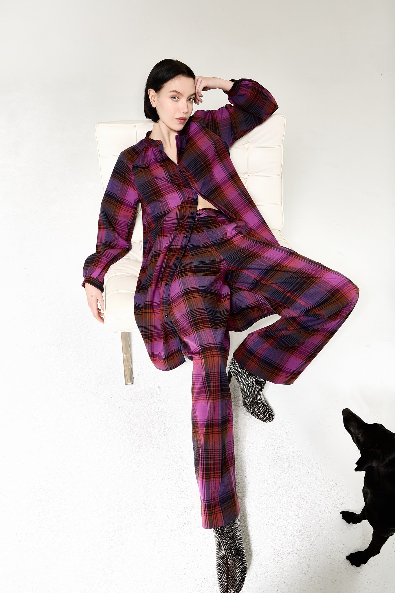 Style closed as a dress or wear open as a long shirt over the matching pants — the power of plaid, your way.