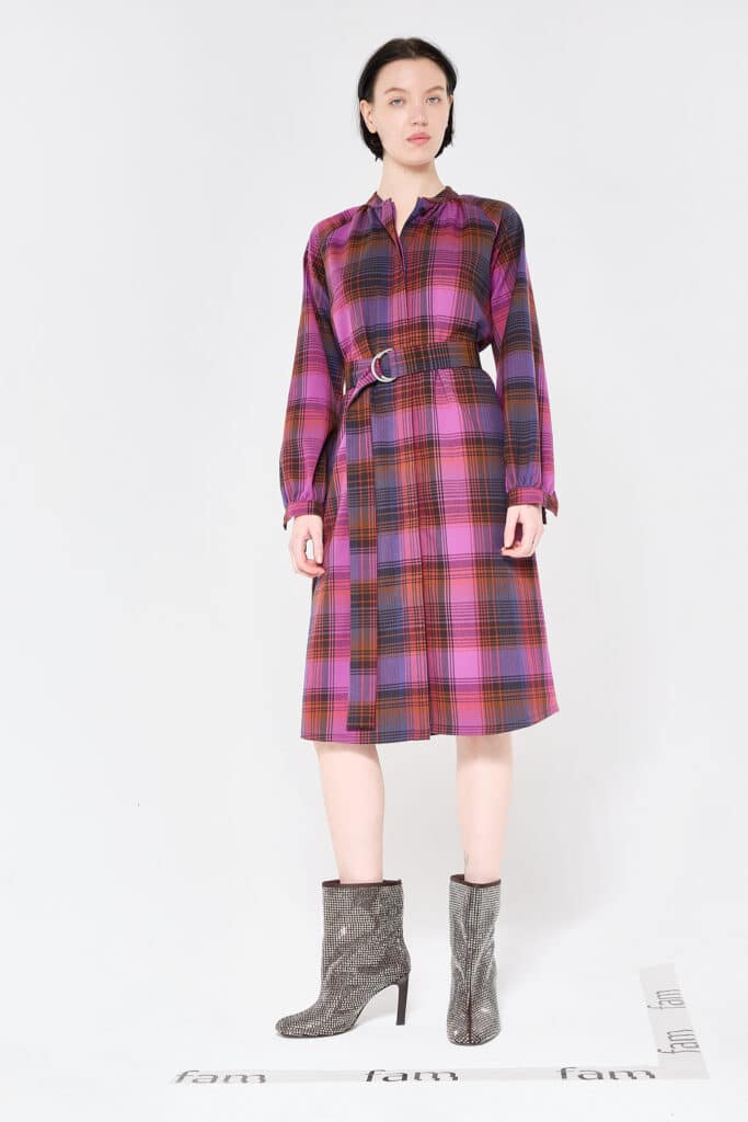 Vibrant check — with bold pink, navy blue and a flash of orange, all in a soft feel drape. Relaxed dress ending just below the knee, with removable belt for a cinched or loose look