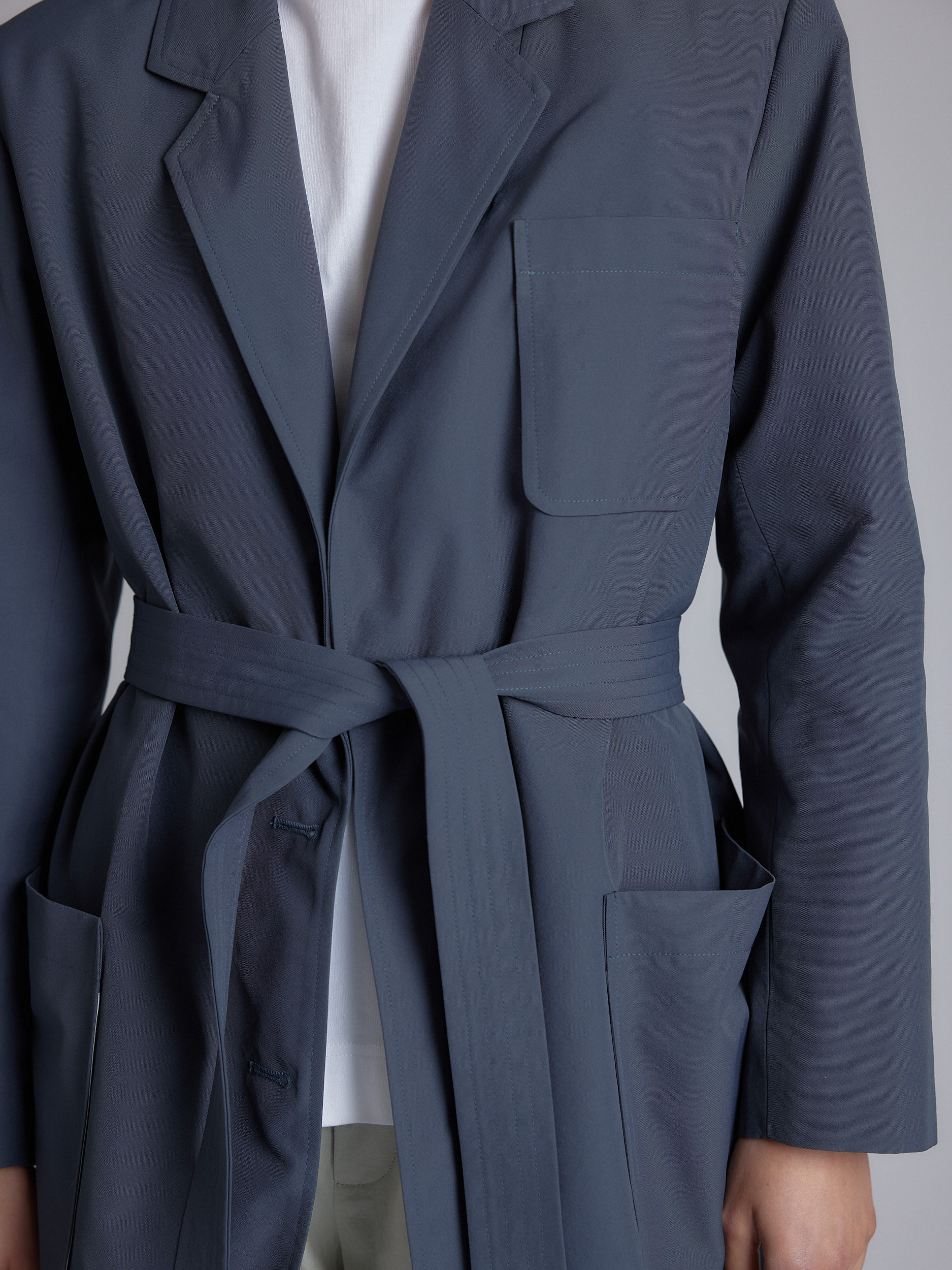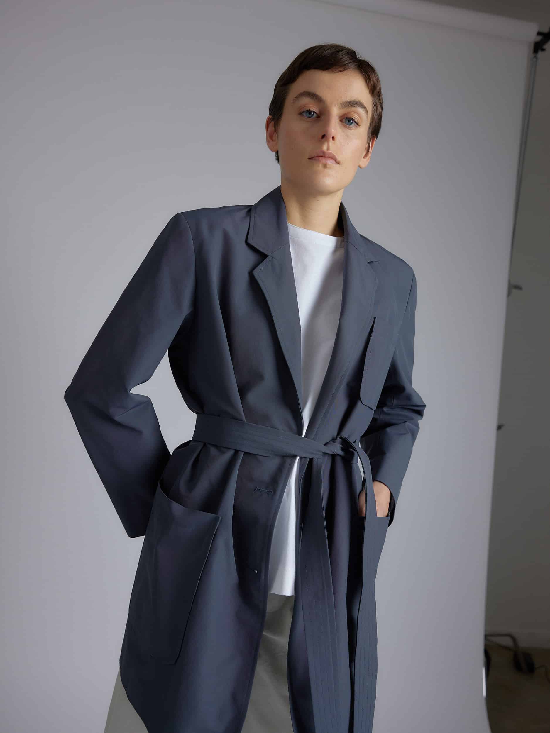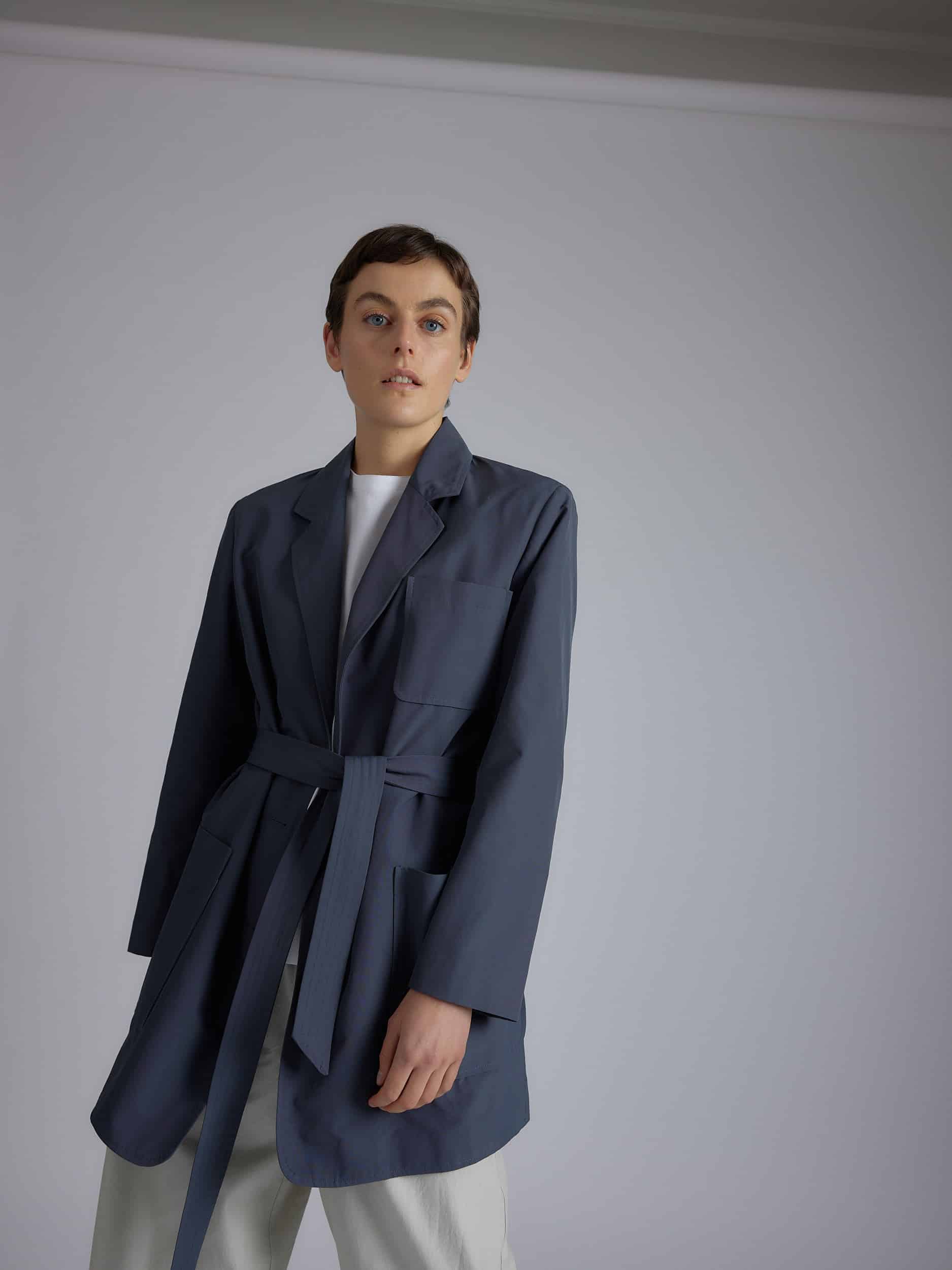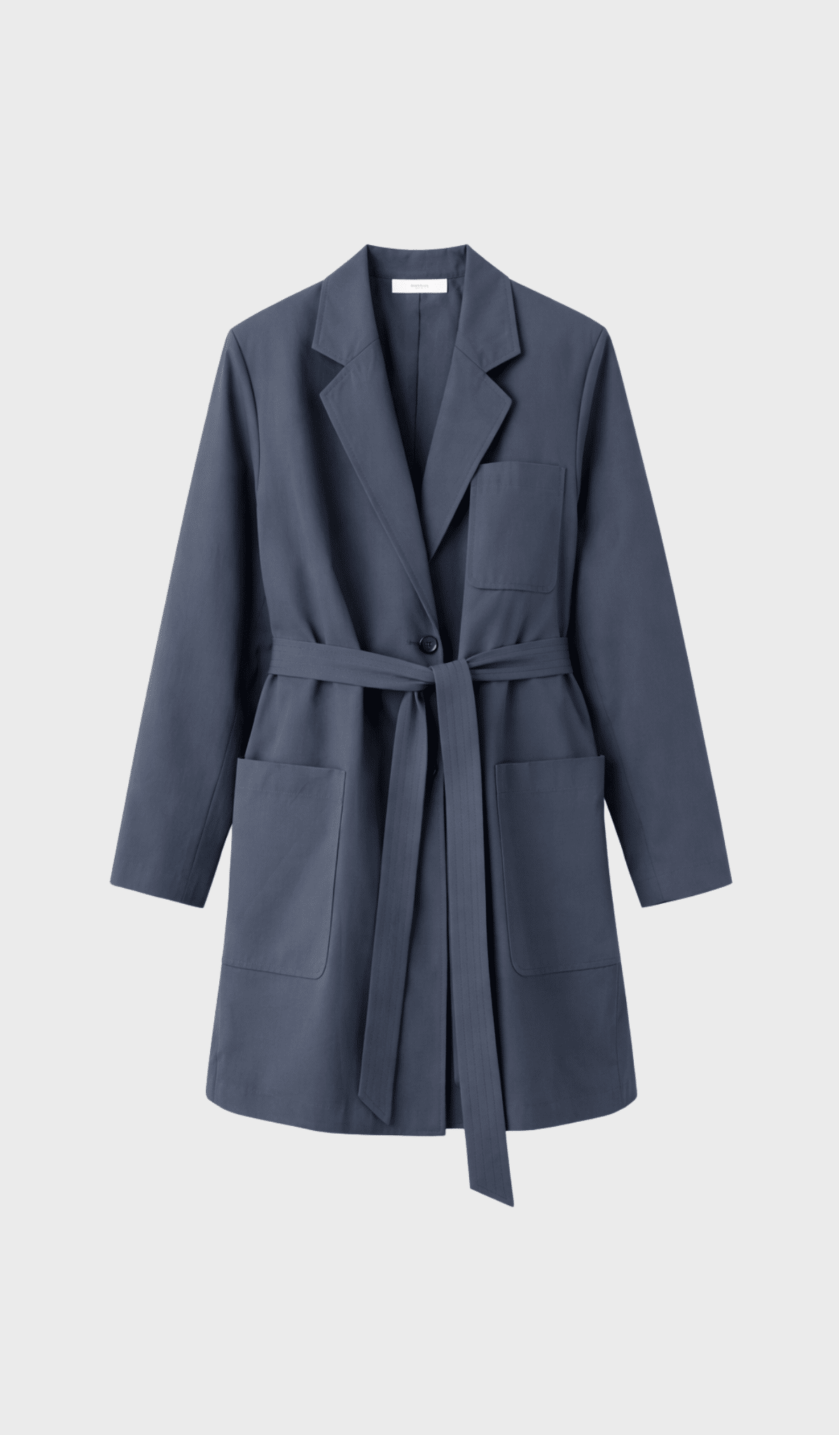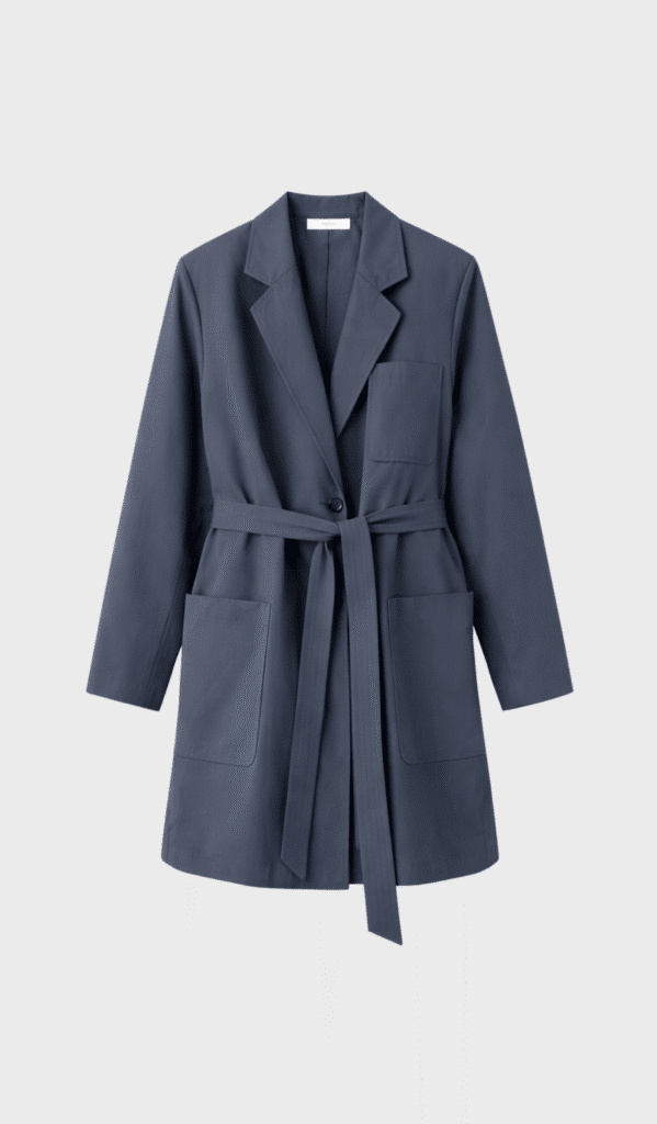 Extra long blazer with button closure and a self fabric belt to give a fitted look.