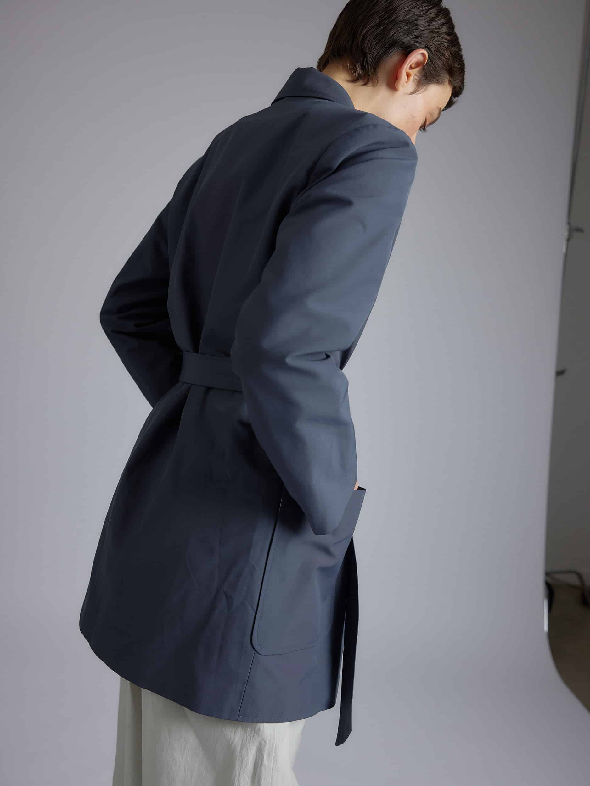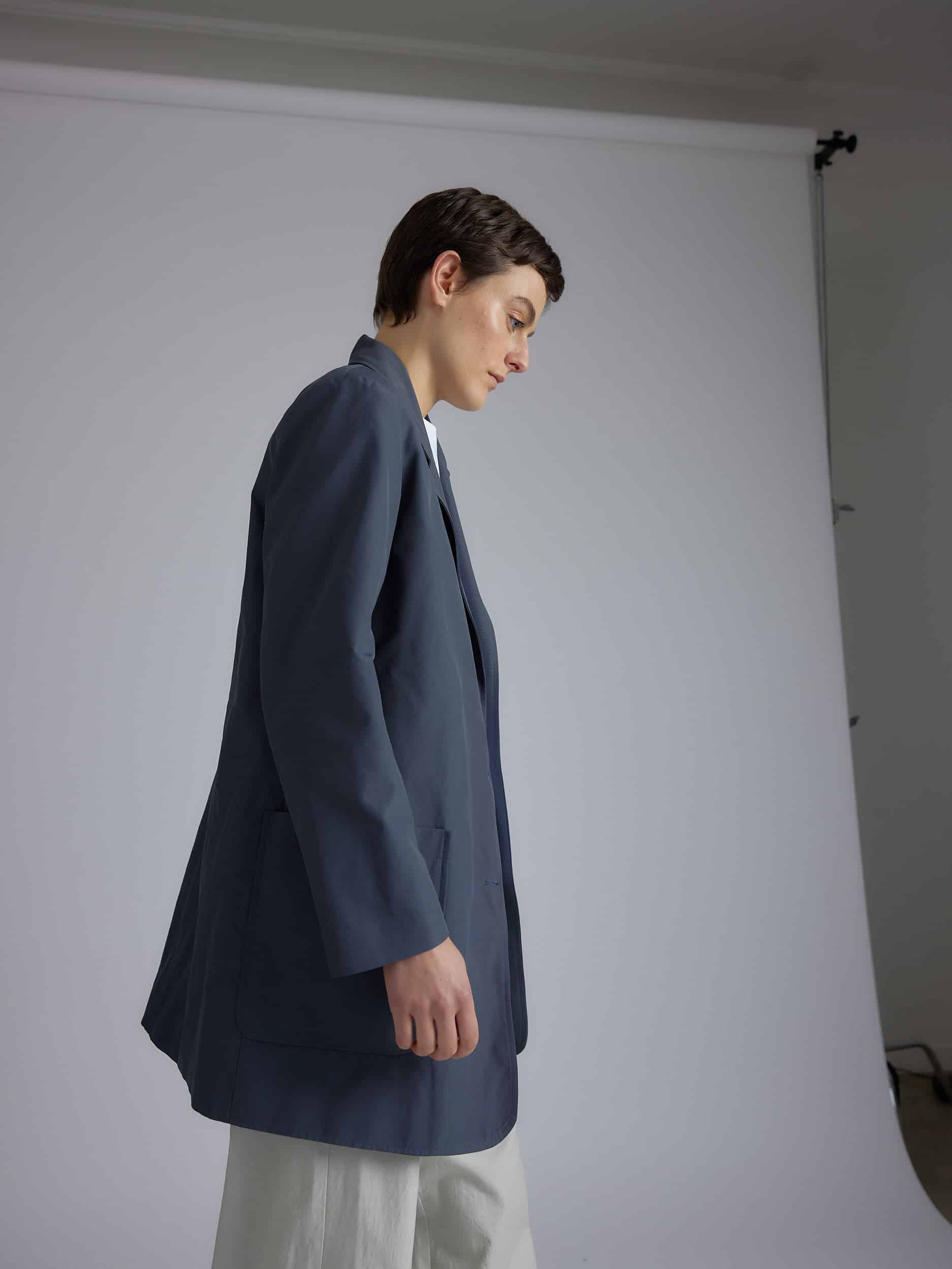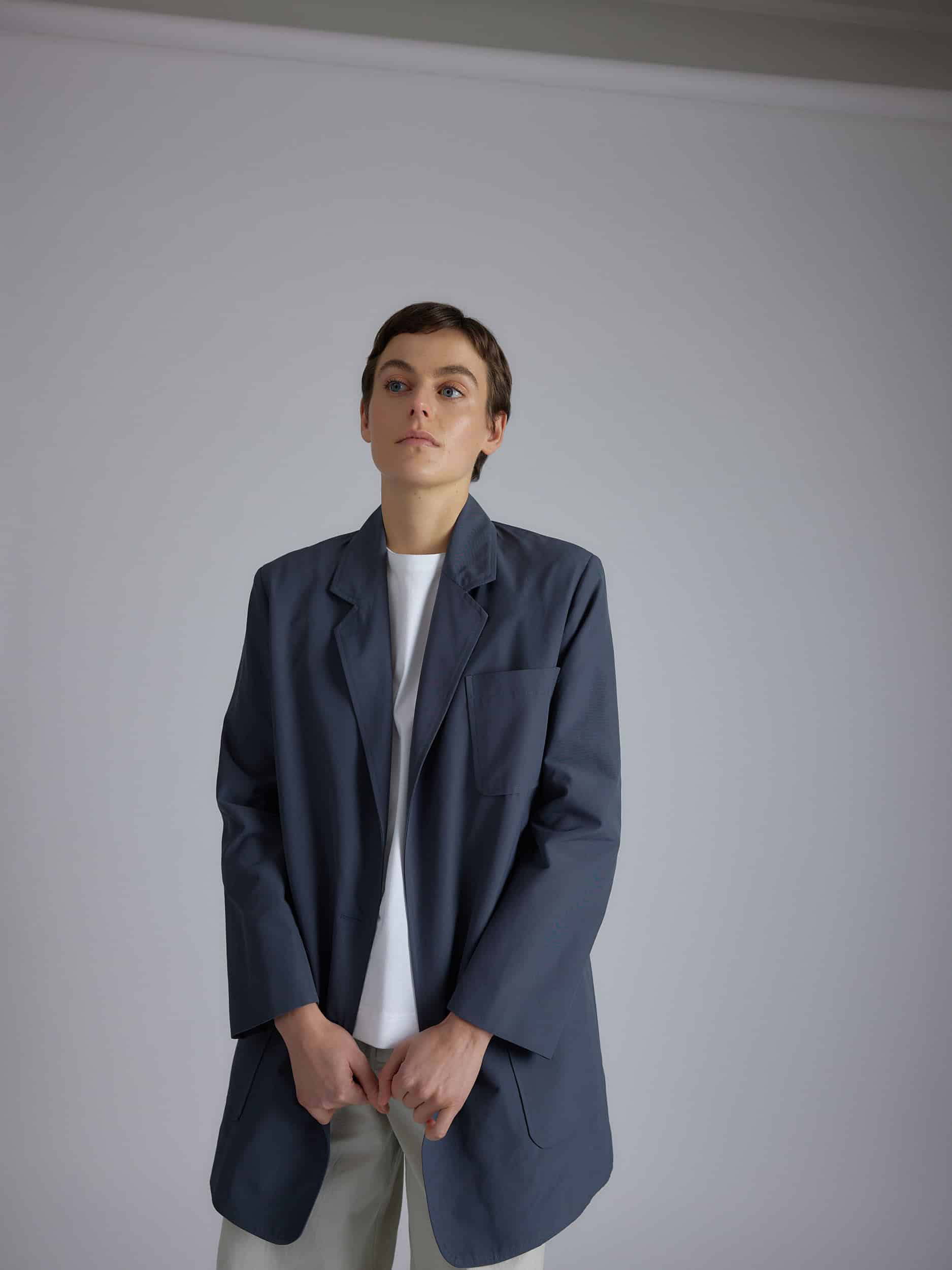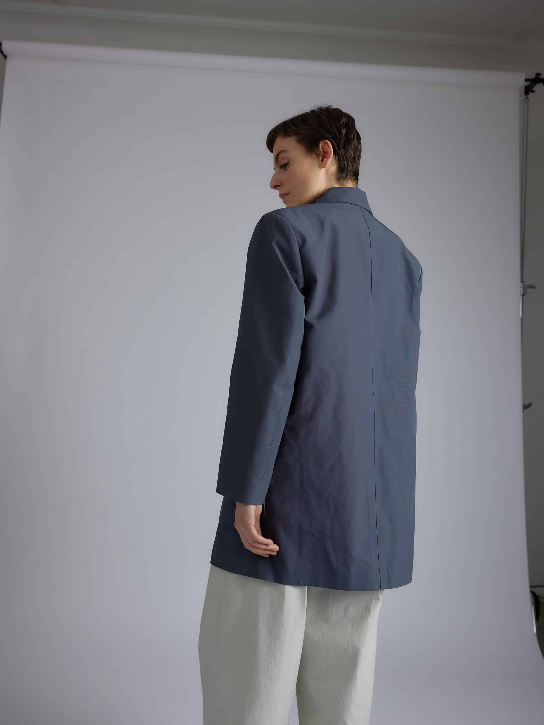 Extra long blazer with button closure and a self fabric belt to give a fitted look.