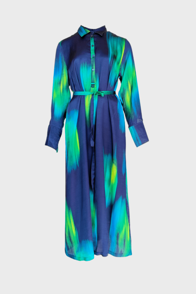 Long-sleeved button-up dress with a bold green and blue abstract print, made from a lightweight fabric.