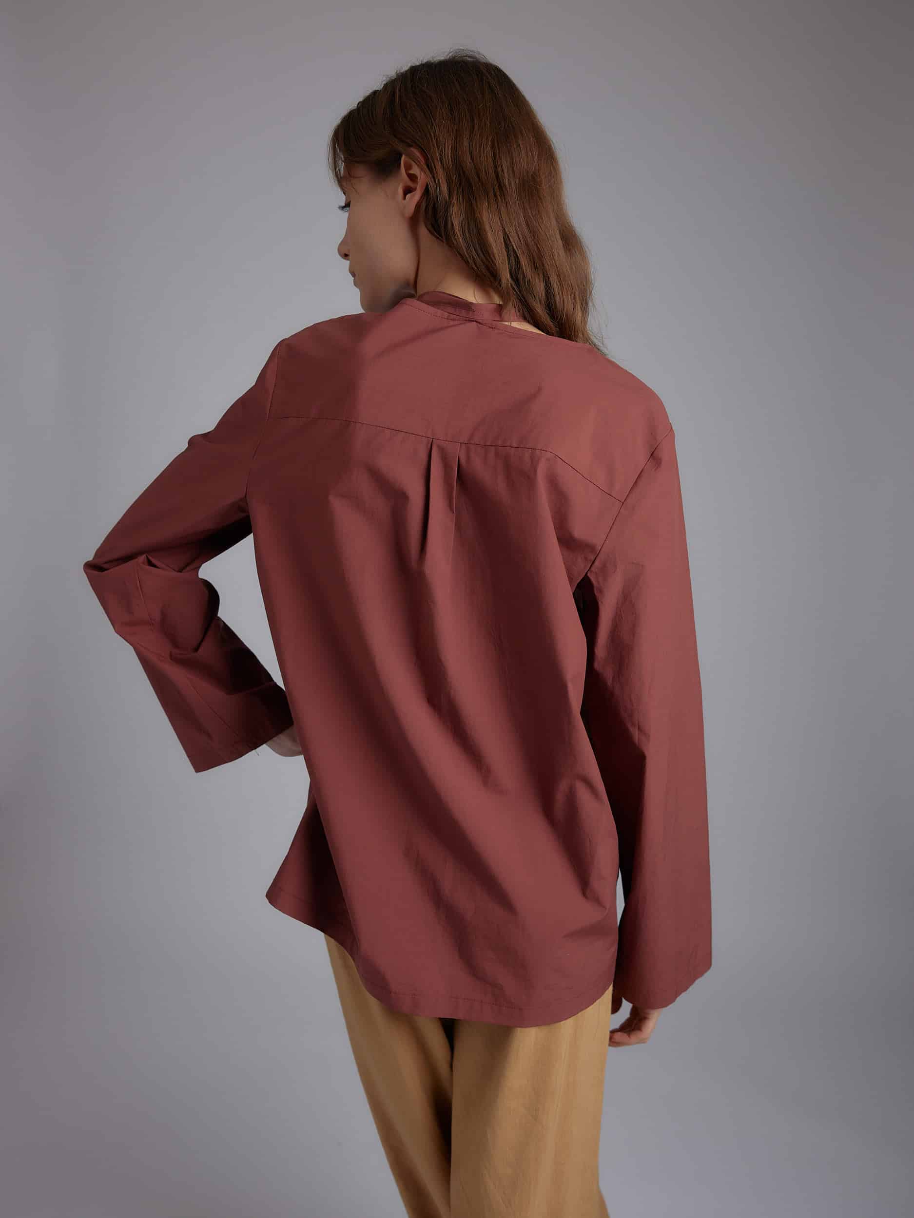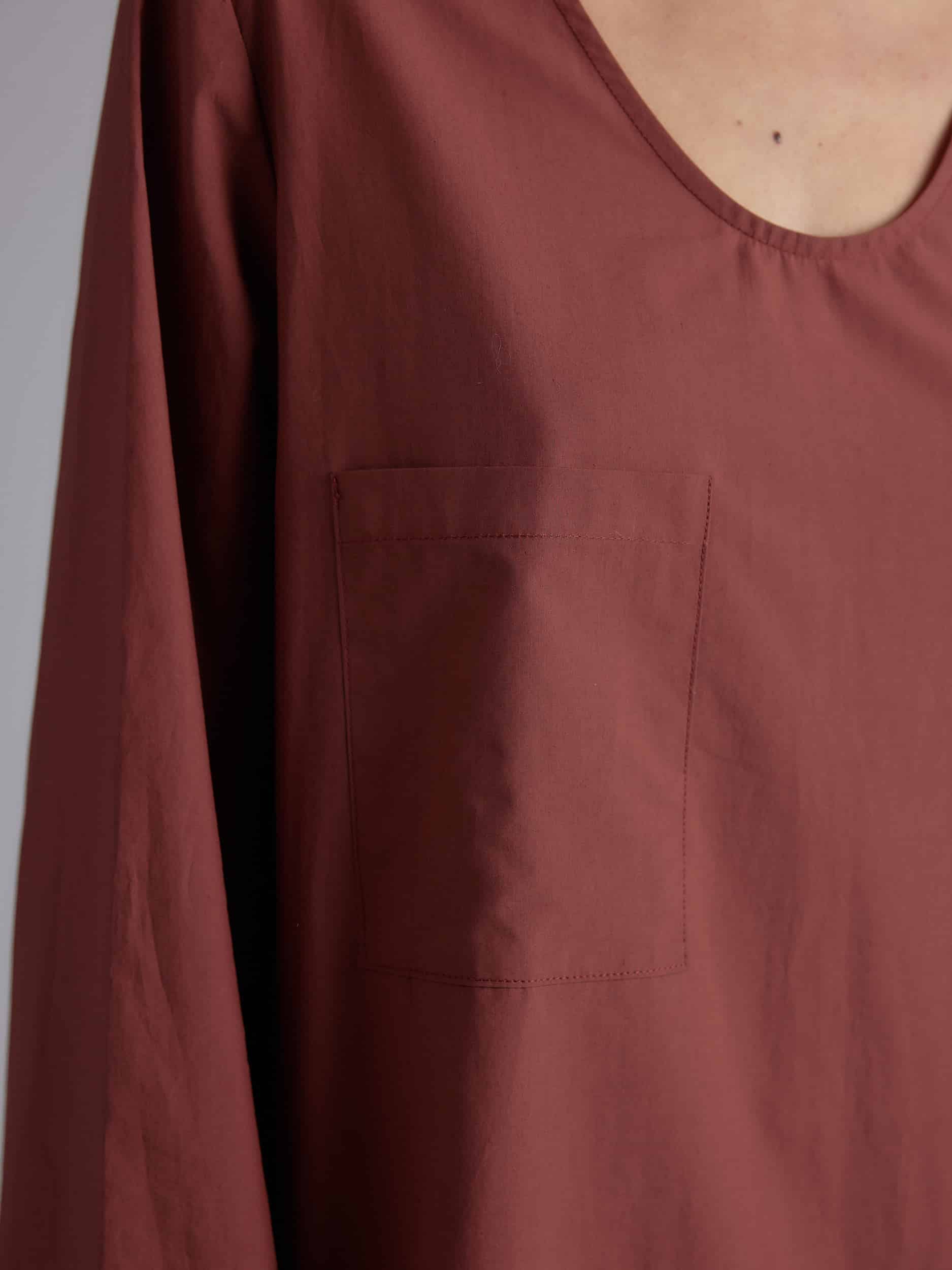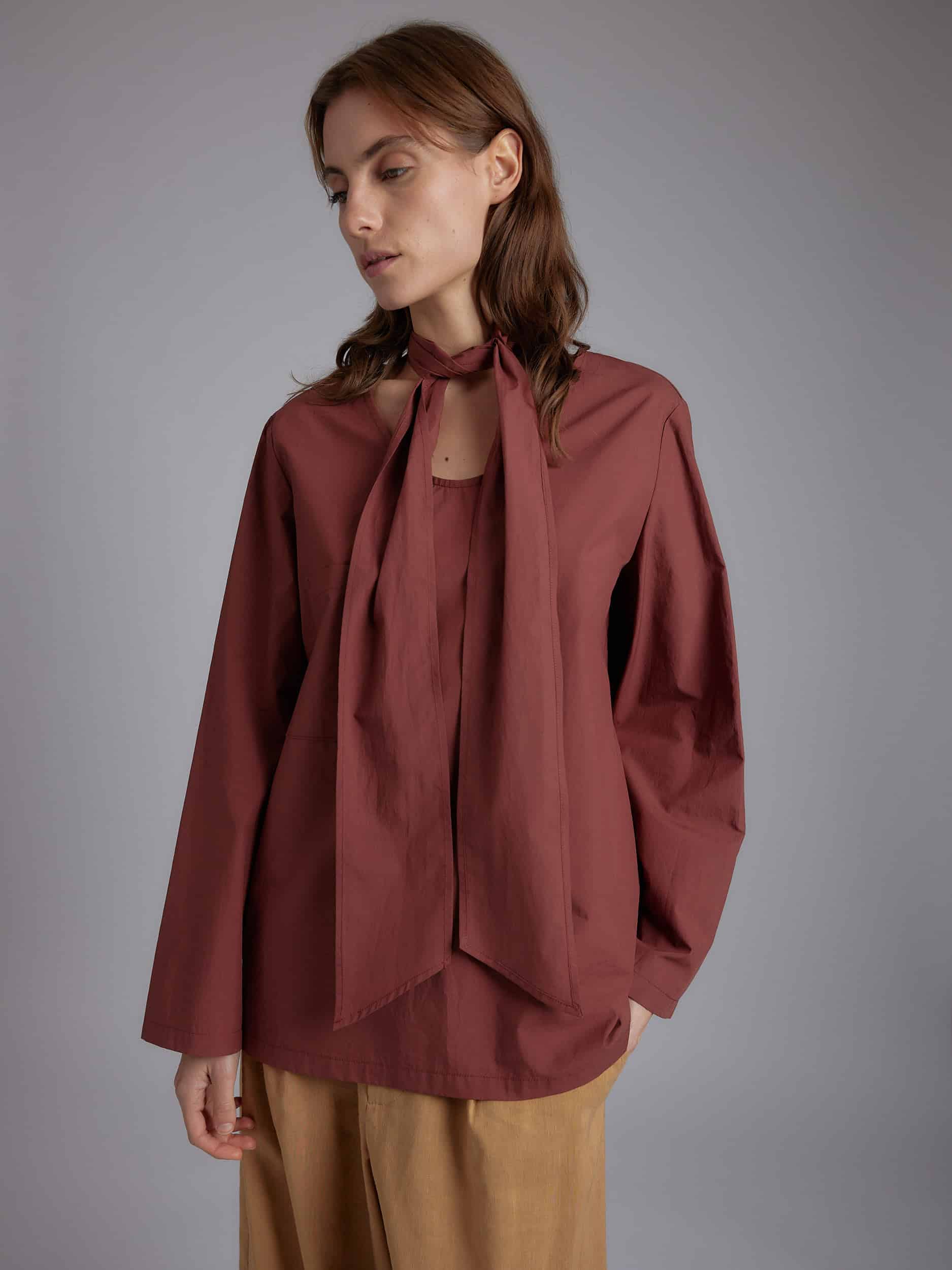 Long sleeve shirt, deep round neck, flat front pocket, self-fabric scarf attached in the neck by a button.