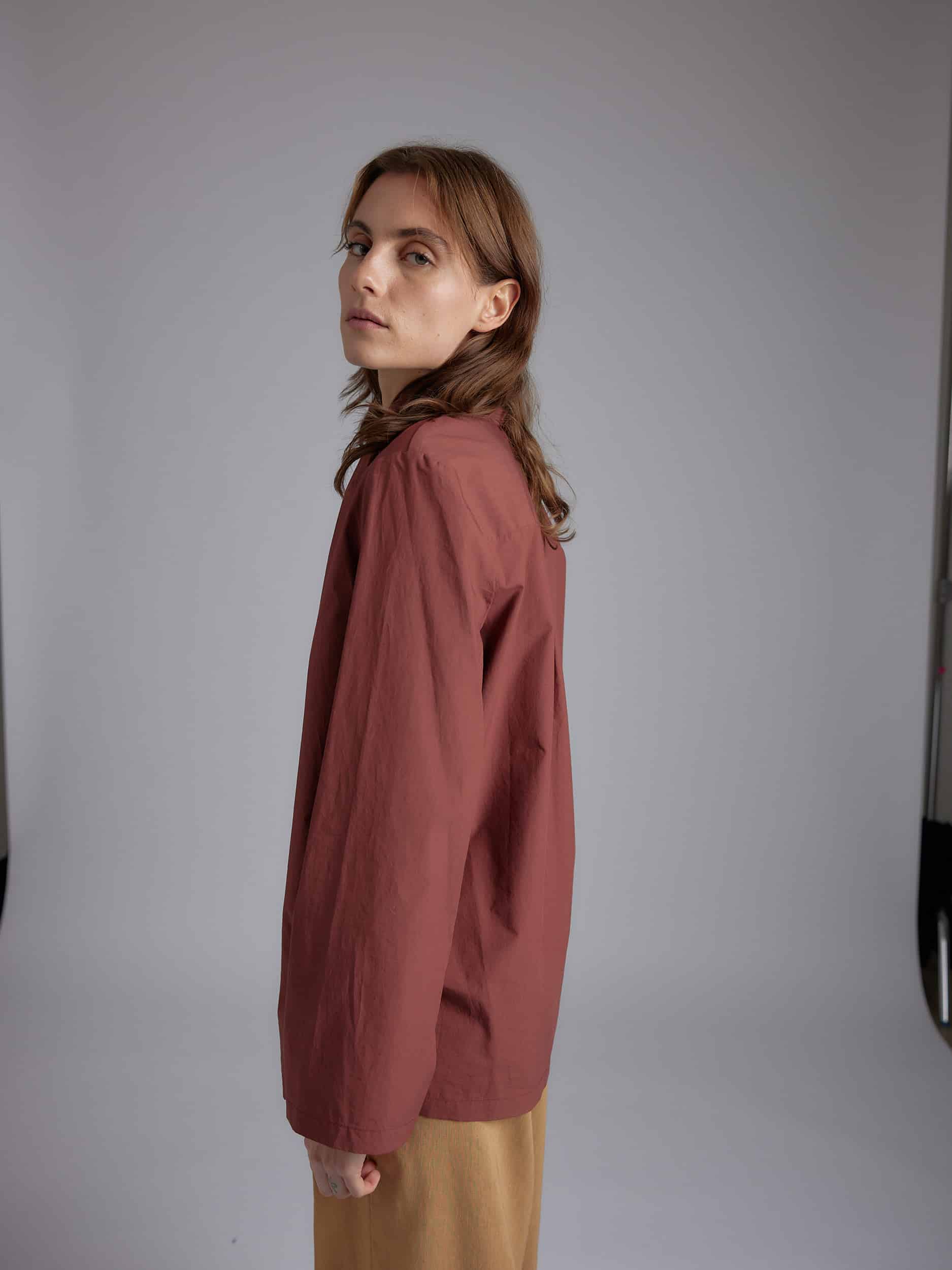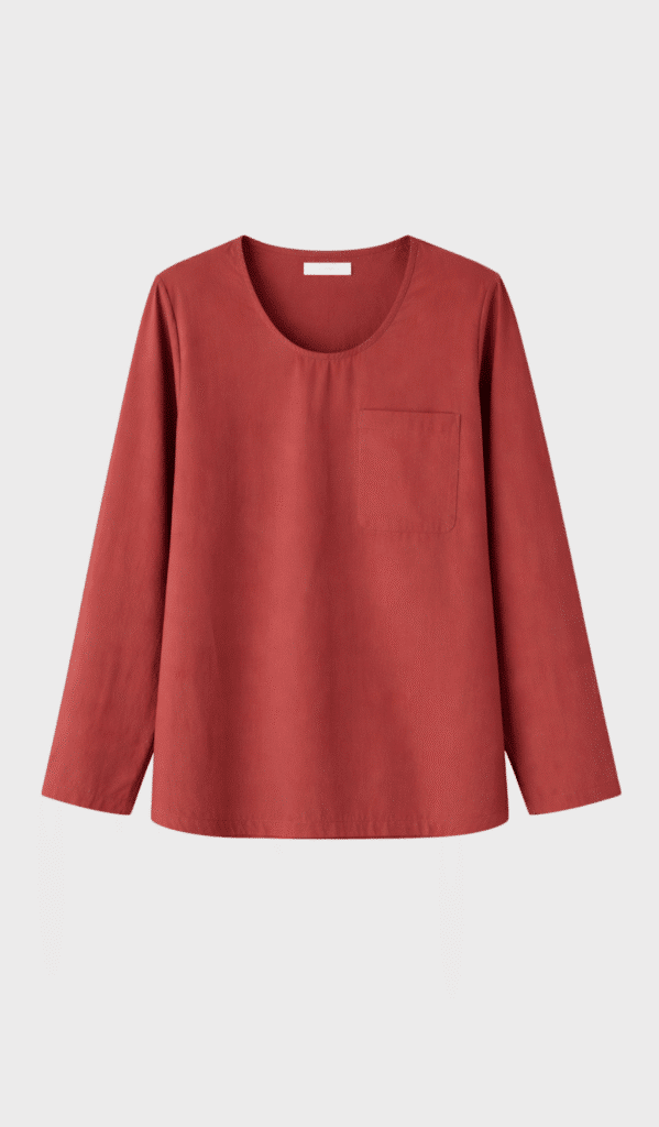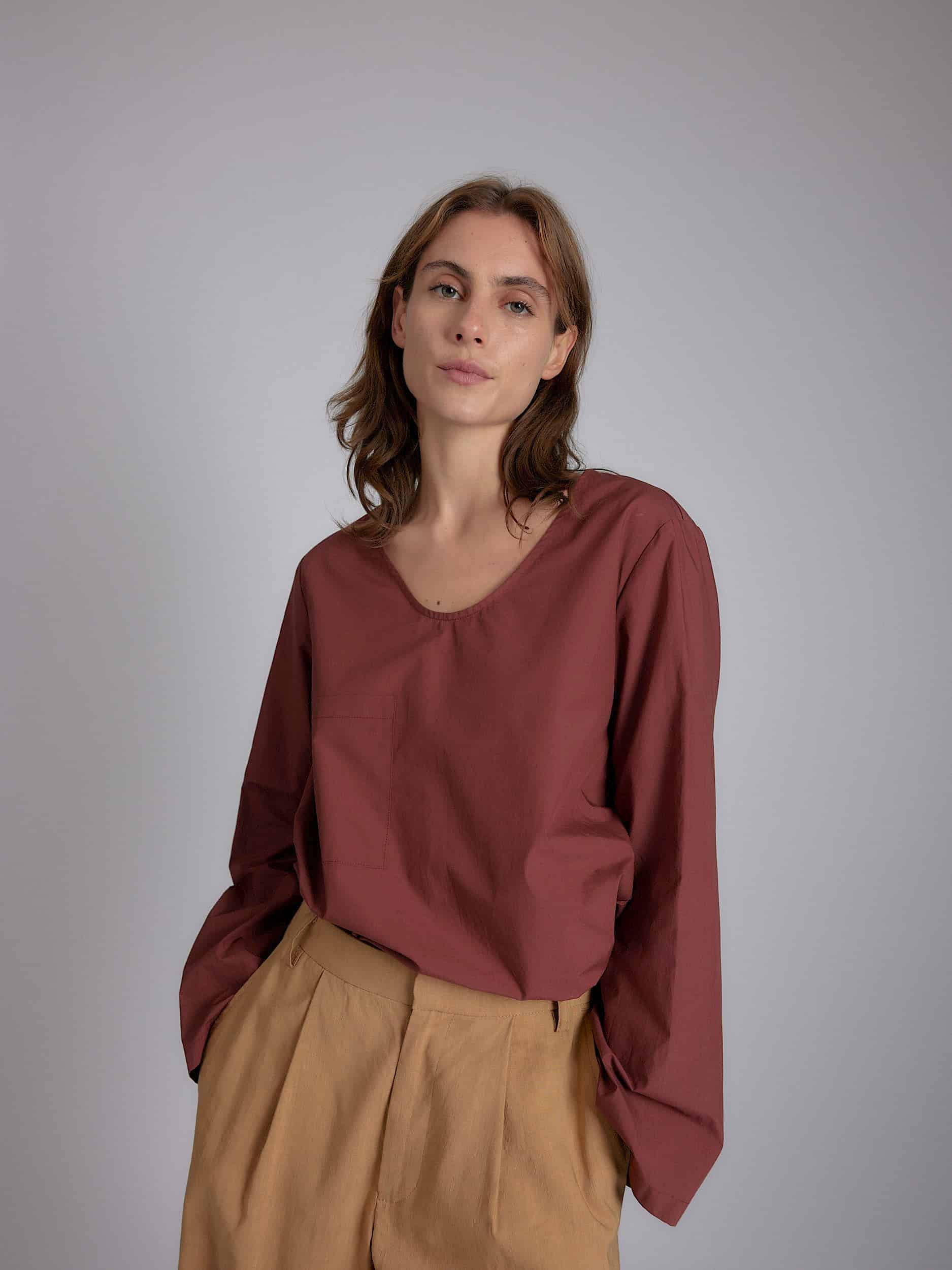 Long sleeve shirt, deep round neck, flat front pocket, self-fabric scarf attached in the neck by a button.