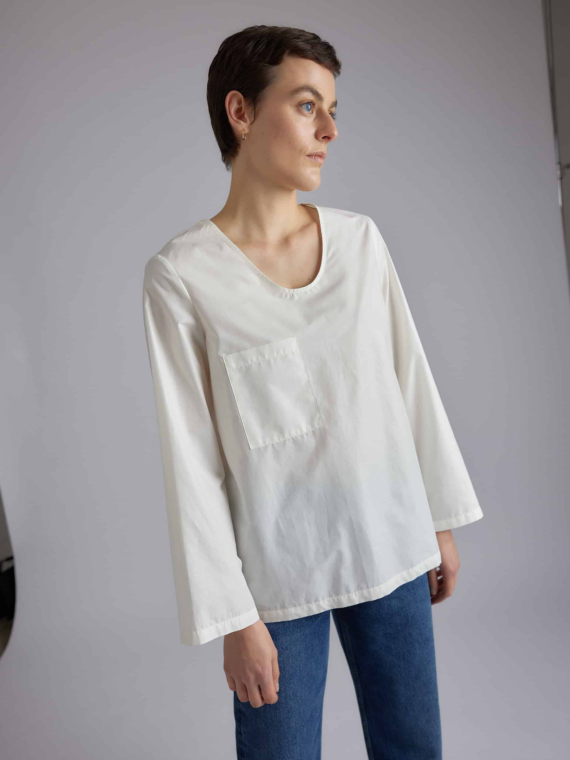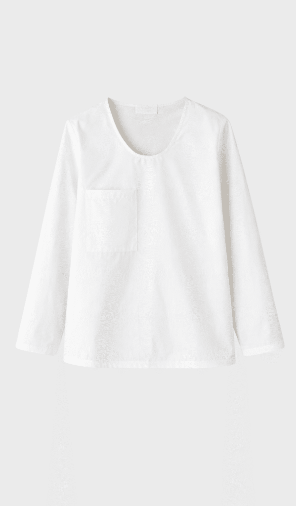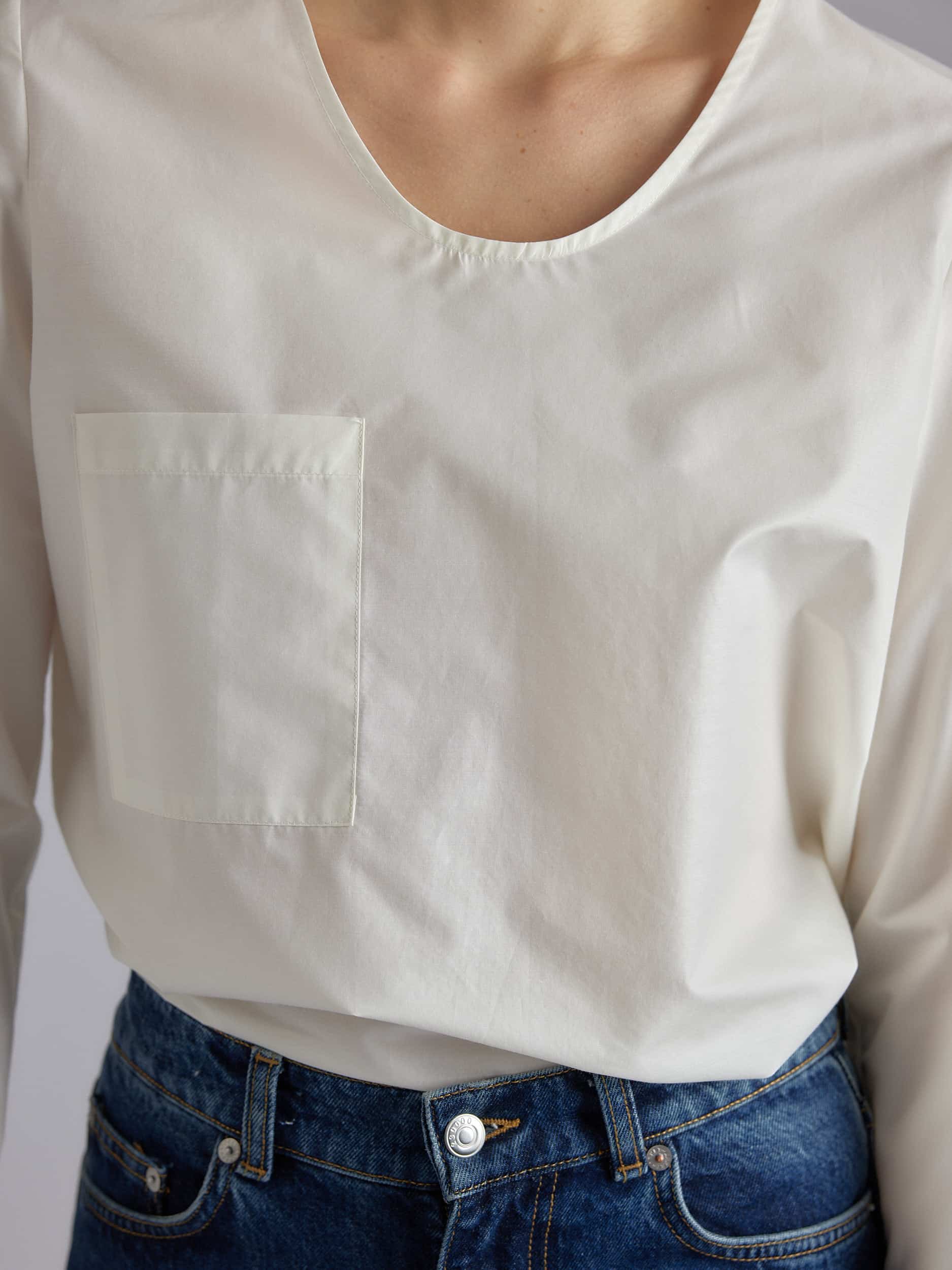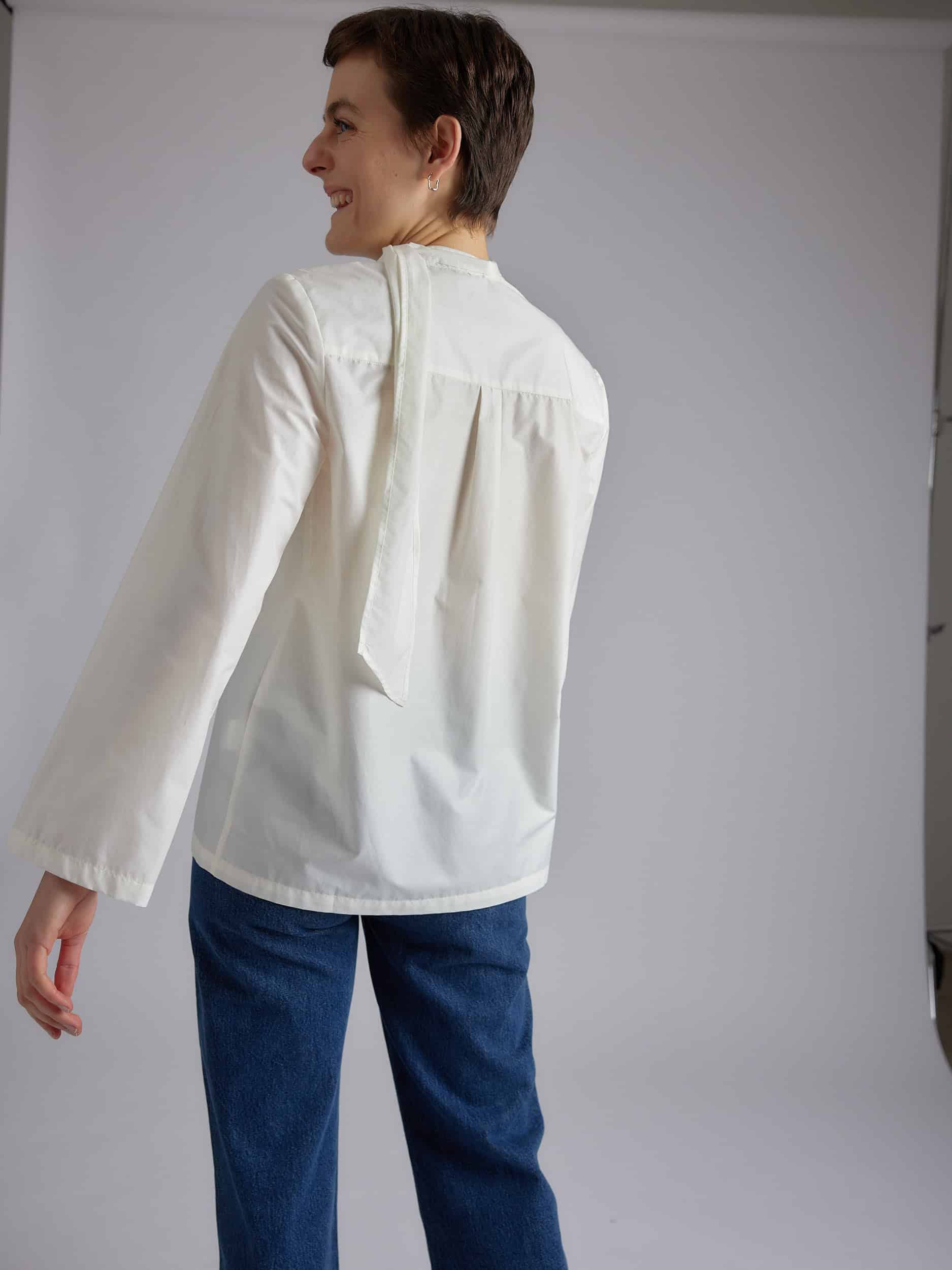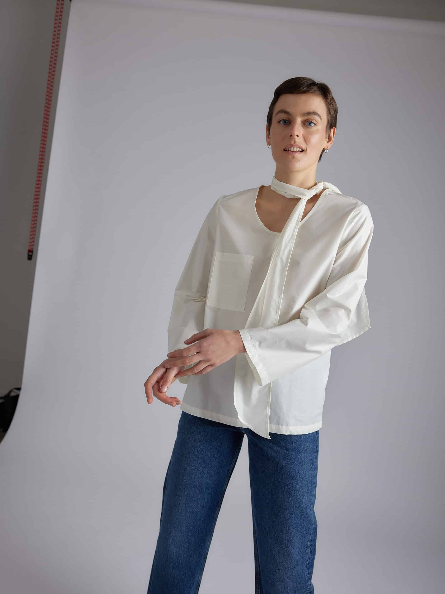 Long sleeve shirt, deep round neck, flat front pocket, self-fabric scarf attached in the neck by a button.