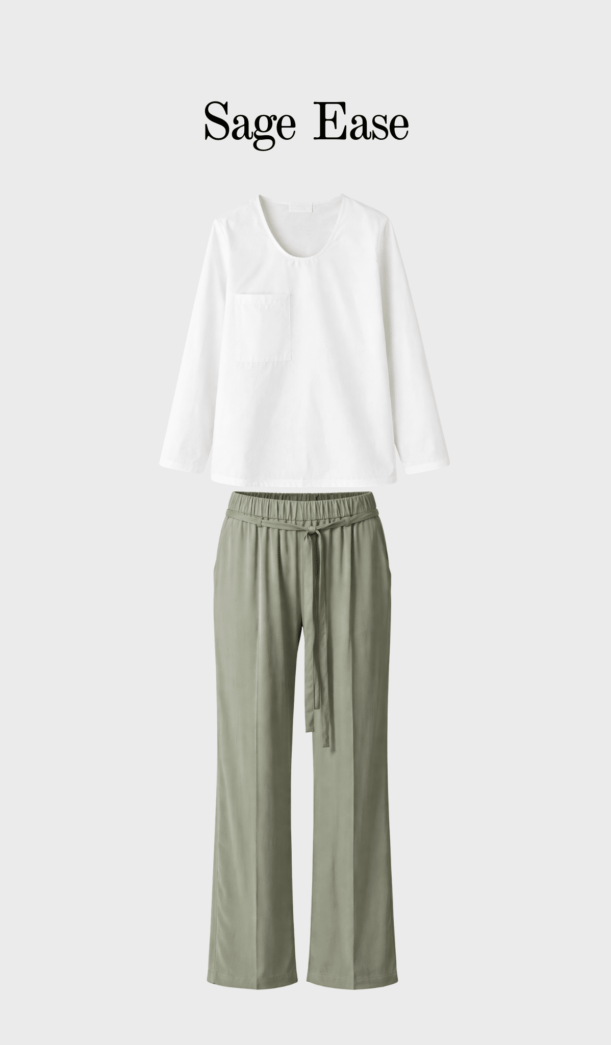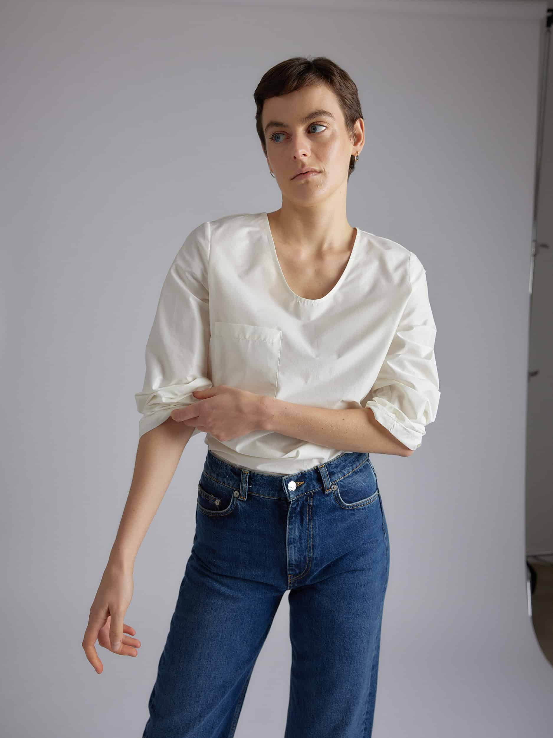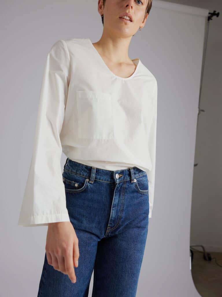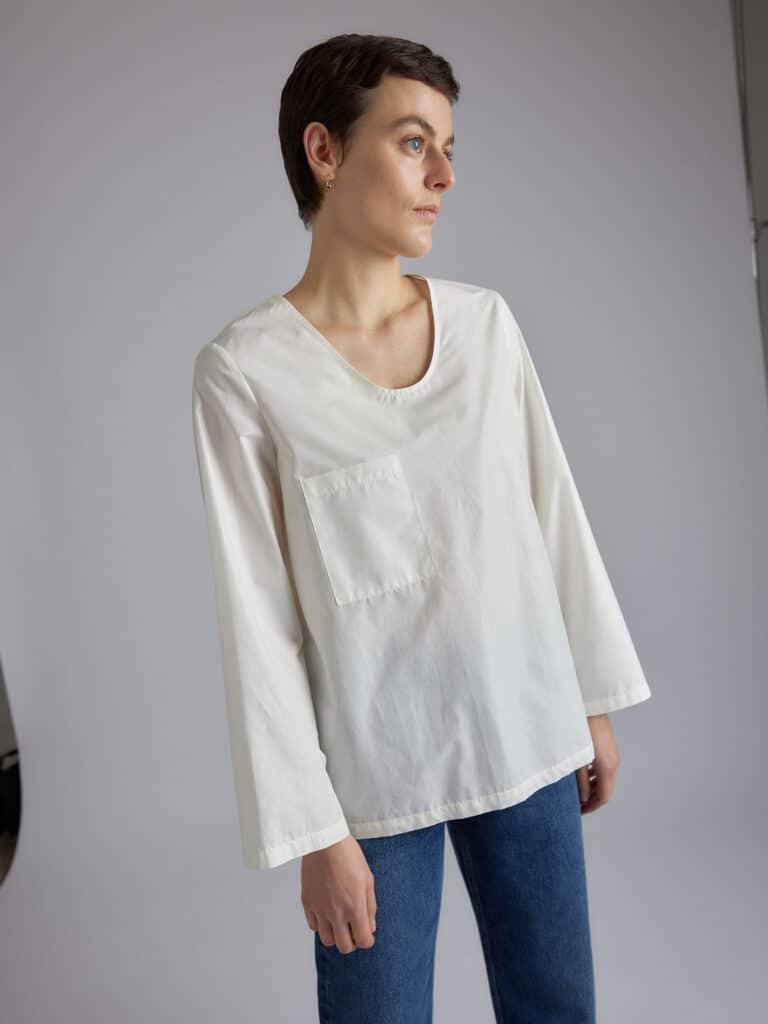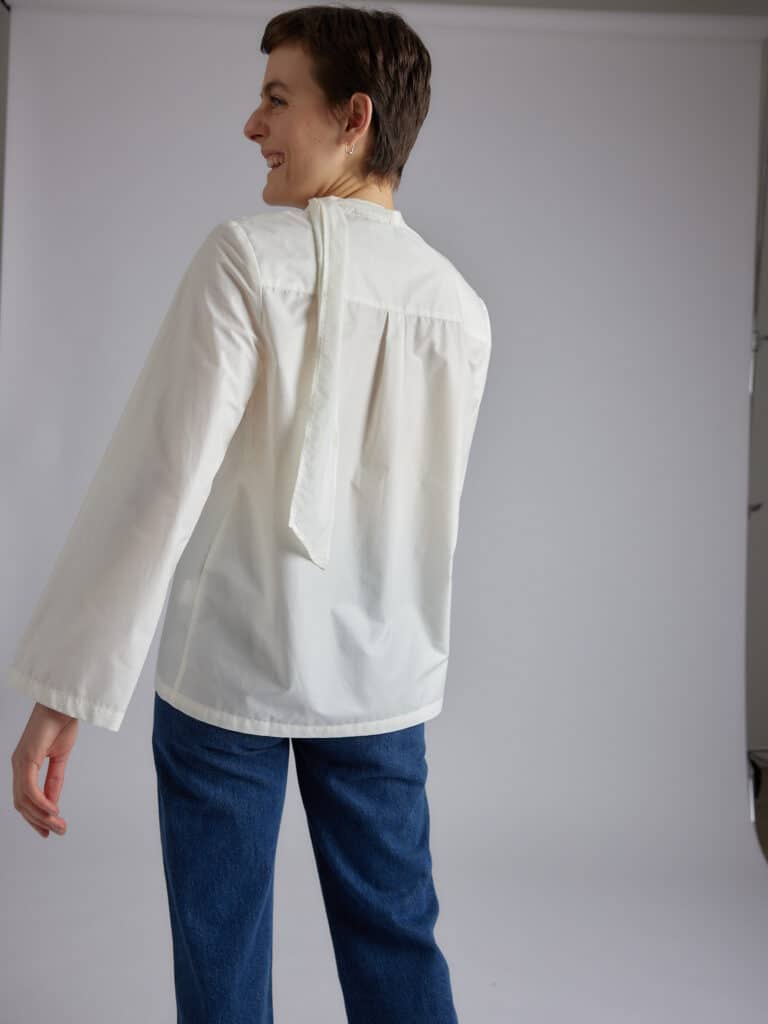 Long sleeve shirt, deep round neck, flat front pocket, self-fabric scarf attached in the neck by a button.
