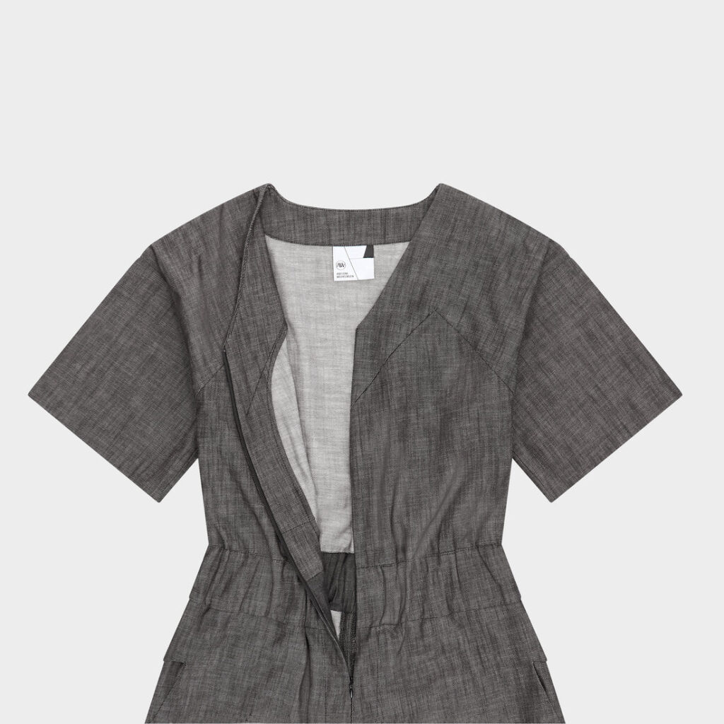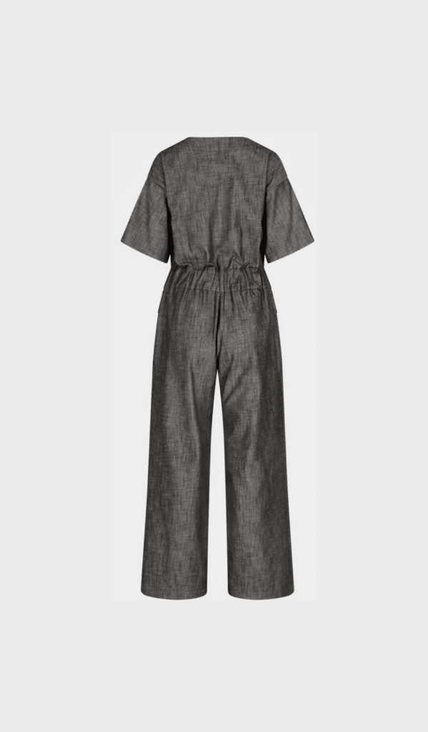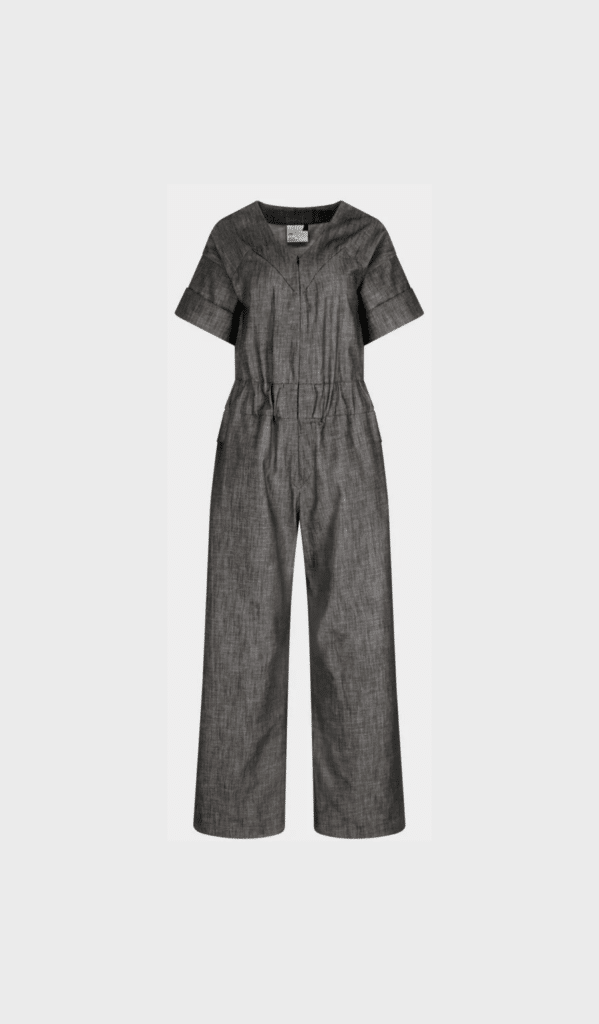 Jumpsuit by ABELONE WILHELMSEN is a grey mélange colored urban jumpsuit with a V-neck & a decorative pointy detail at the front. Wear it for a walk on the beach or in the woods, to work, a night out or with a celebration with friends! Timeless silhouette with flared legs. Invisible zip at front and V-neck. Short kimono sleeves – Roll them up if you like. Waistband with wide elastic for a great comfort. Pointy pockets at side seam.