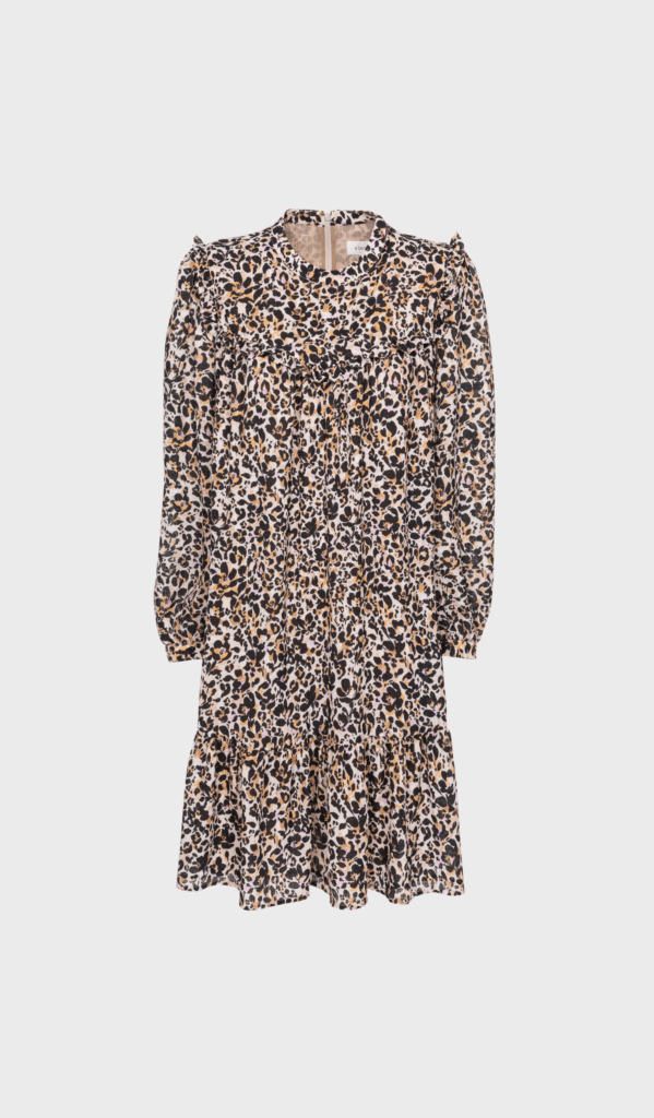 The Katrina is a leopard-printed mini dress with a detailed neckline.