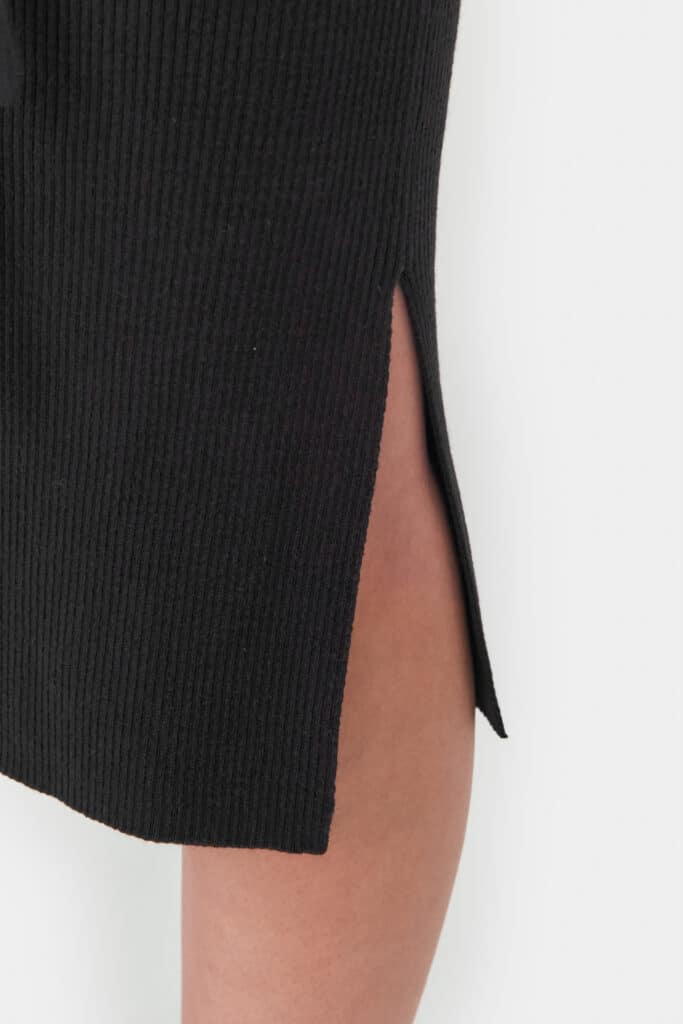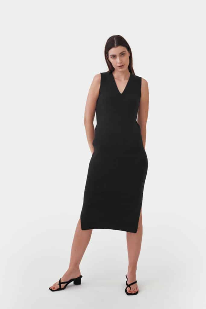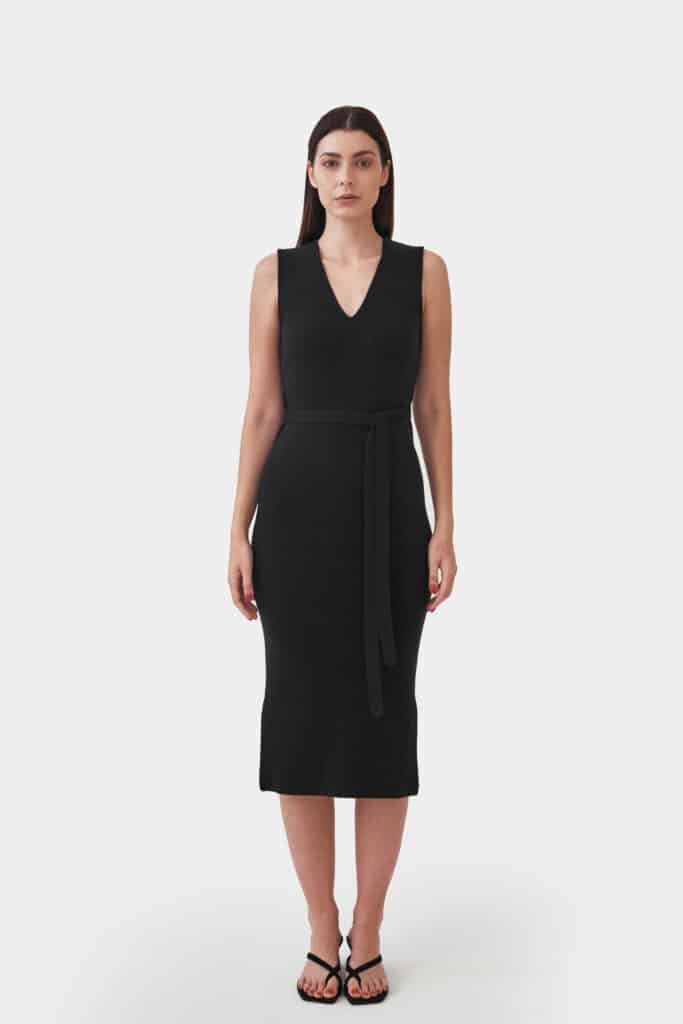 Our knitted V-neck dress is light and airy, providing a luxuriously comfortable feel all year round. The tight-fitting, sleeveless dress features a V-neckline, a waist belt and side cuts that serve as an intriguing detail to the otherwise clean-cut form.