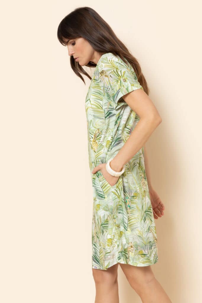 Leni by Terre Bleue is a pistachio green colored dress with V-neck opening in the front. Short sleeved and ribbon belt at the waistline. All over foliage and animal figures print. Pair it with a chic summer hat and brown leather sandal.