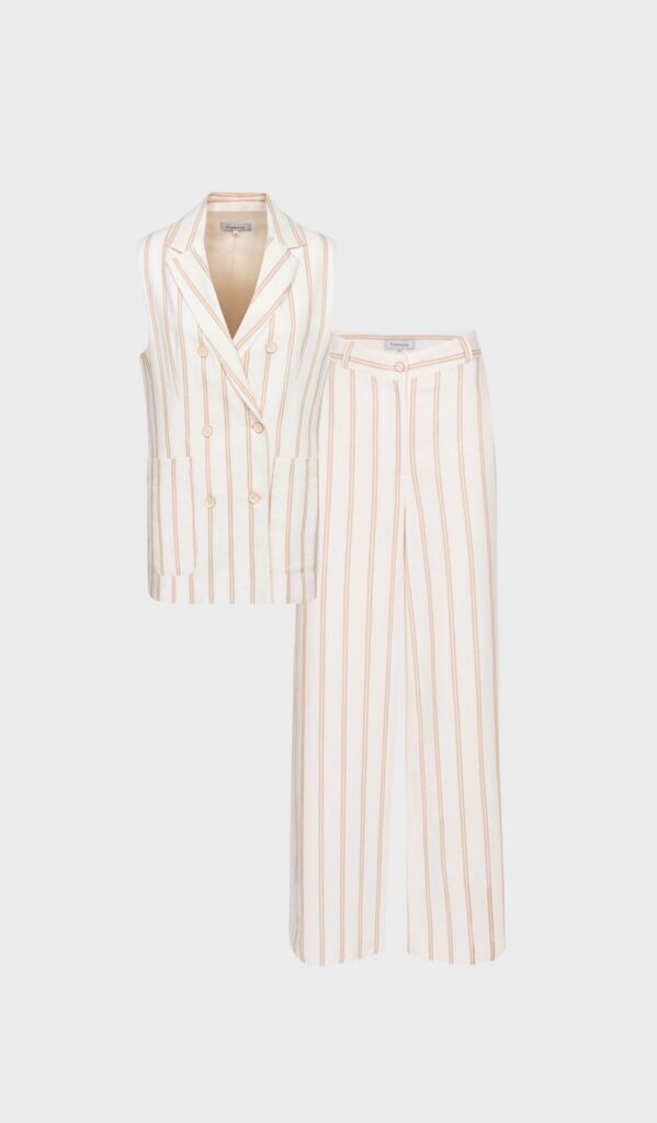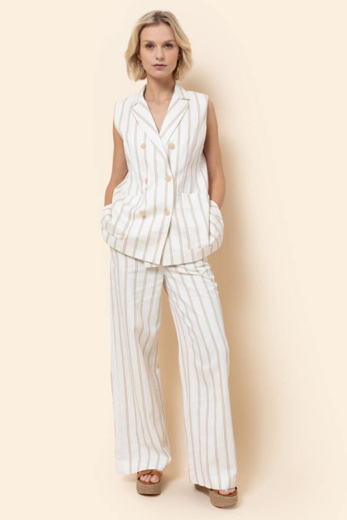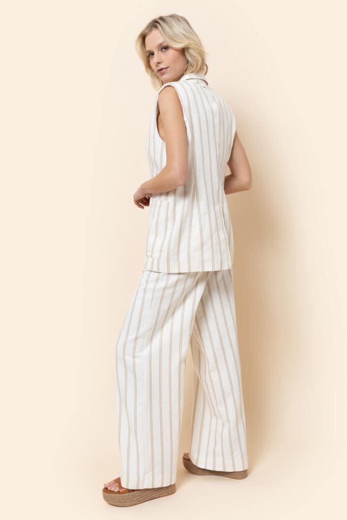 Levi by Terre Bleue is a beige high waisted and wide leg pants with zipper and button detail on front. Pockets on front and belt loops. Ecru stripes printed all over.