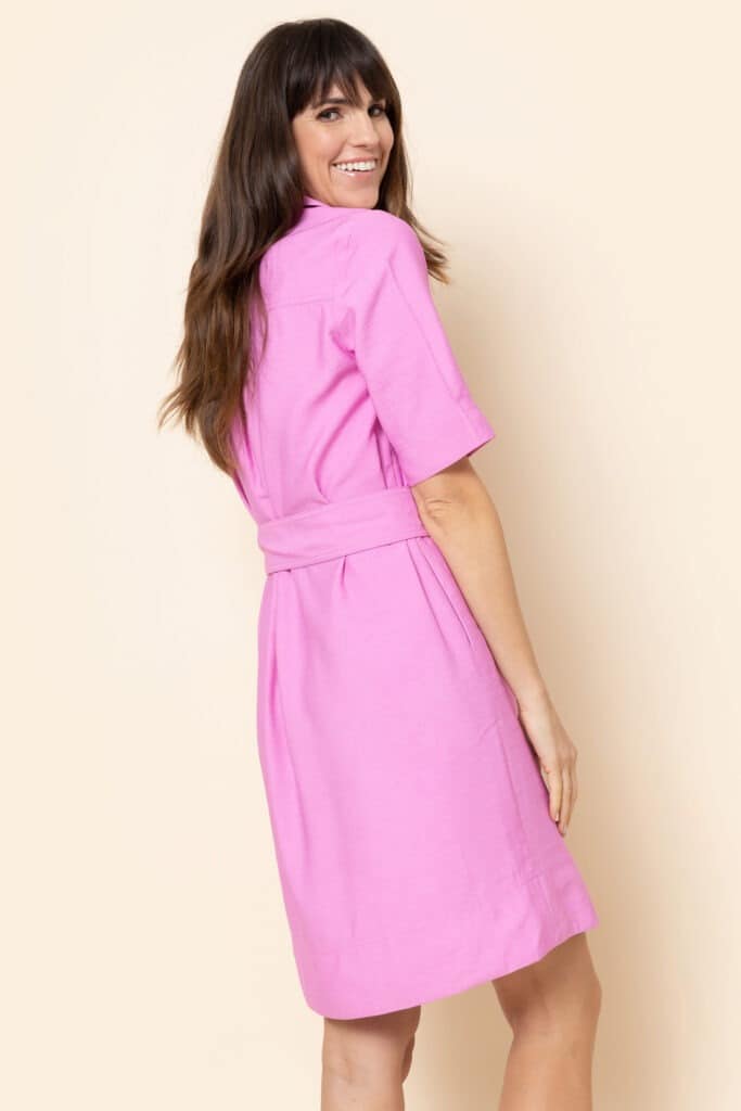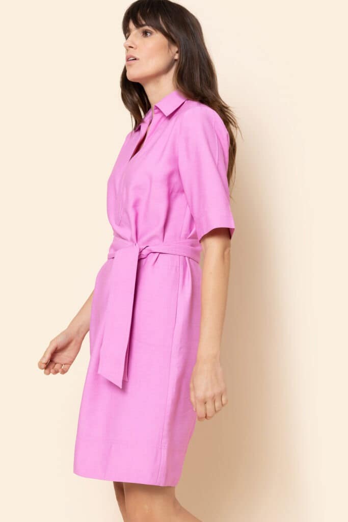 Lilou by Terre Bleue is a long pink dress with collar and deep V-neckline. Short sleeved. Ribbon belt to tie at waistline.