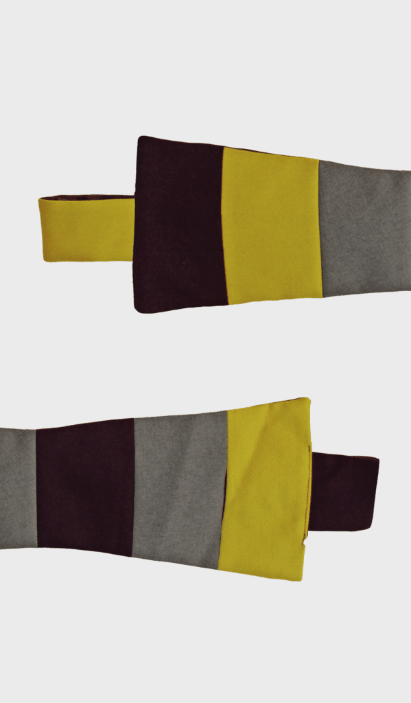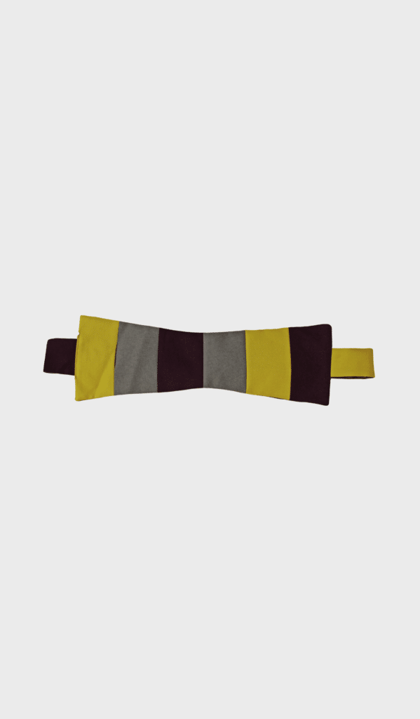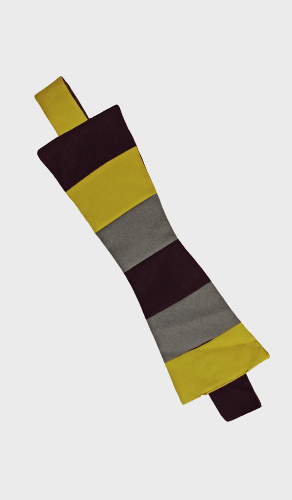 Liverpool Street Belt by EVA Schalckens is a dark purple (almost black), yellow mustard and grey colored belt inspired by the Japanese Obi Belt that was made with leftover fabric from the collection.
