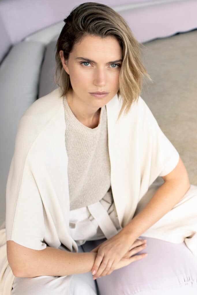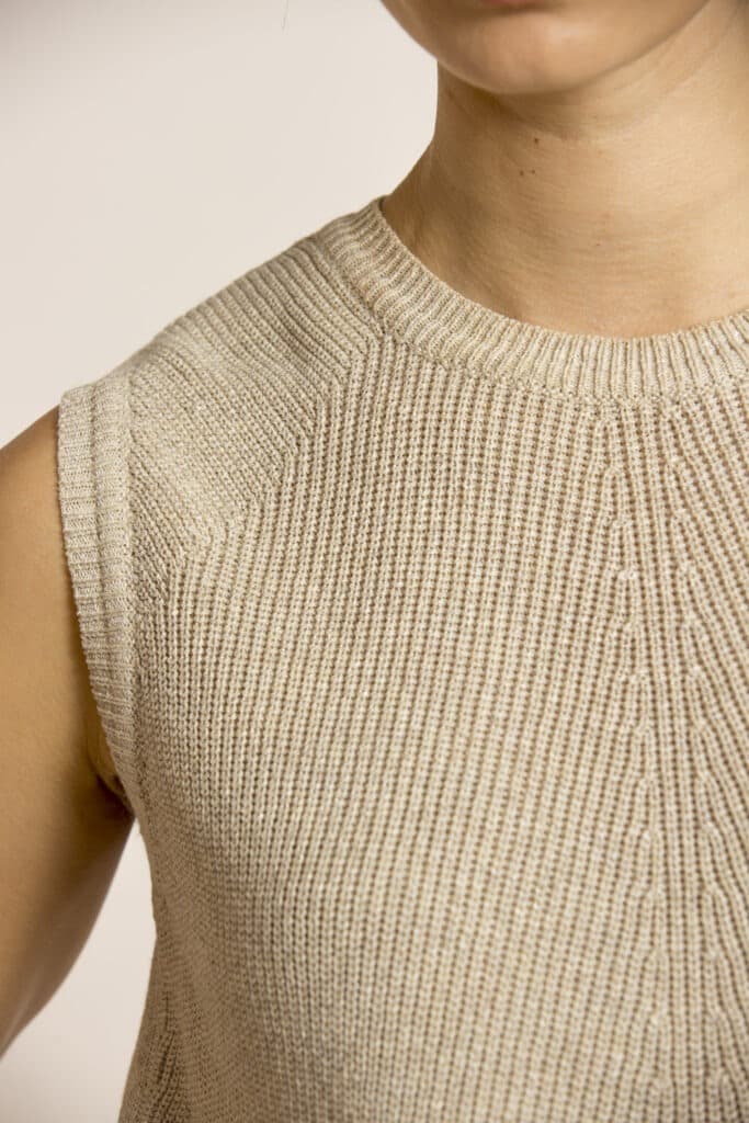 Livia by Gigue is a mastic colored sleeveless pullover with round neckline. Pair it up with a white turtleneck and white or mastic trousers.